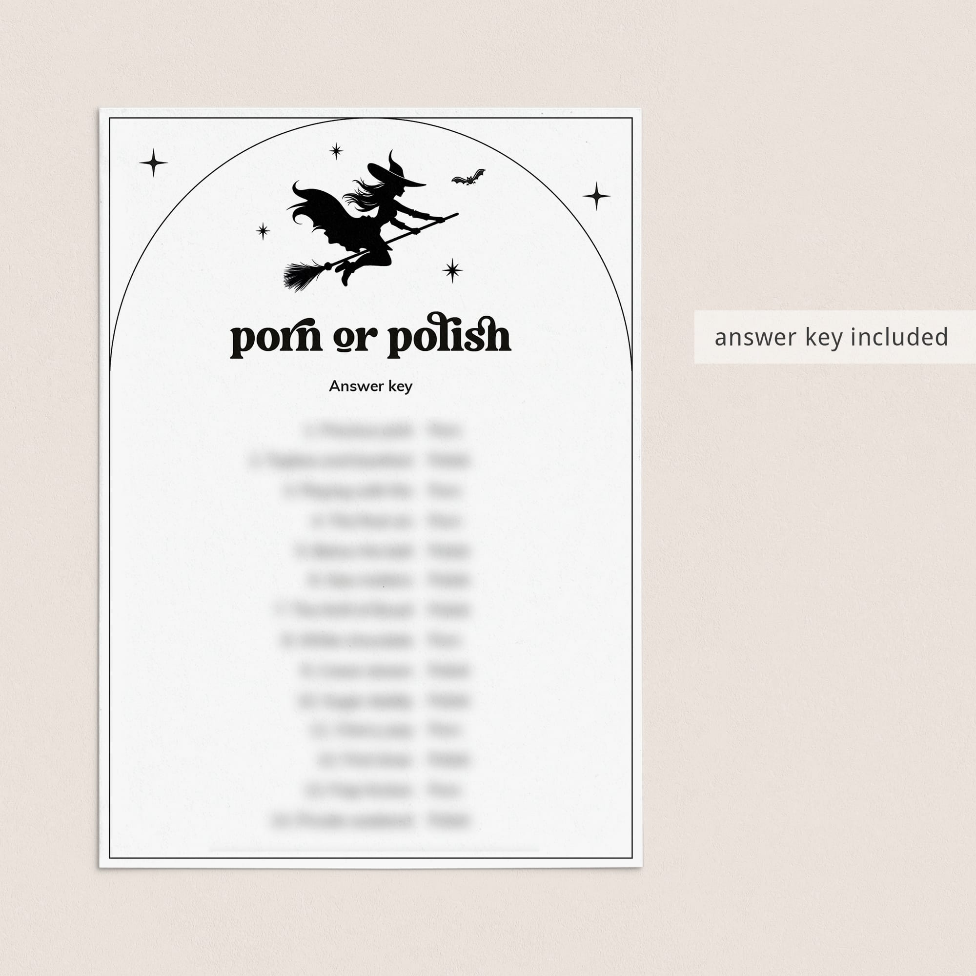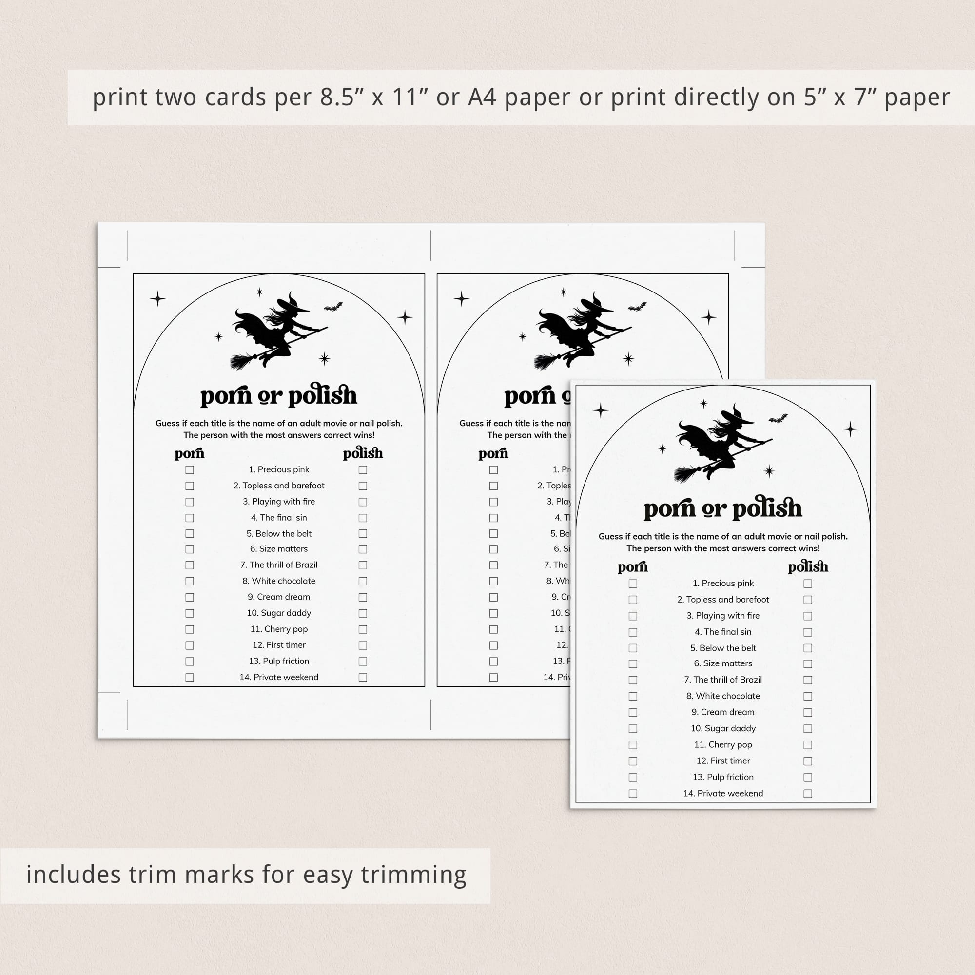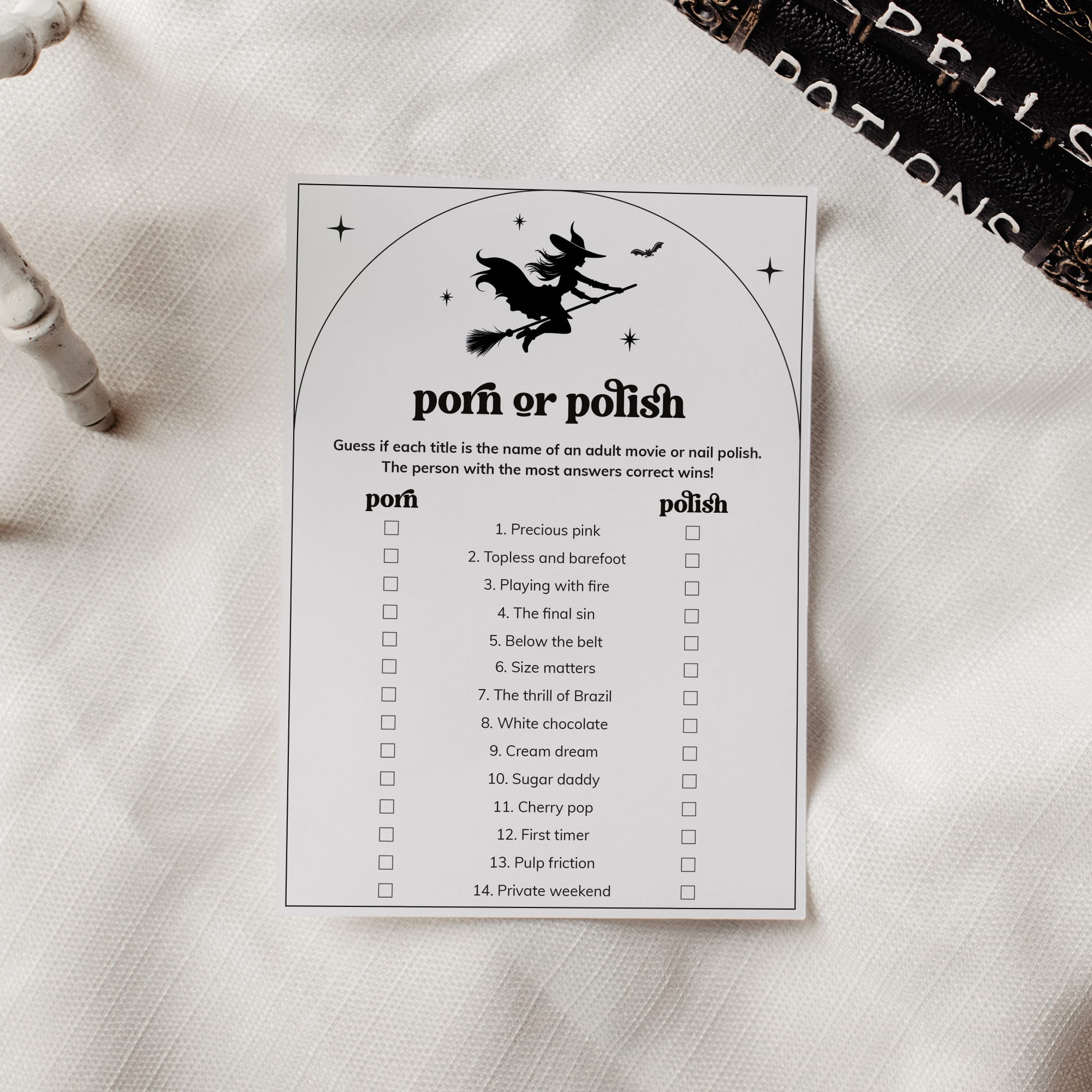 Are you looking for a naughty bachelorette game to play with your girlfriends? Play Porn or Polish with this Bewitched theme bachelorette game with witch on a broomstick silhouette. It is a hilarious addition to your Witches Bachelorette Party, Halloween Hen Night or Witchy Bride Bridal Shower. You'll have your girls laughing in no time.