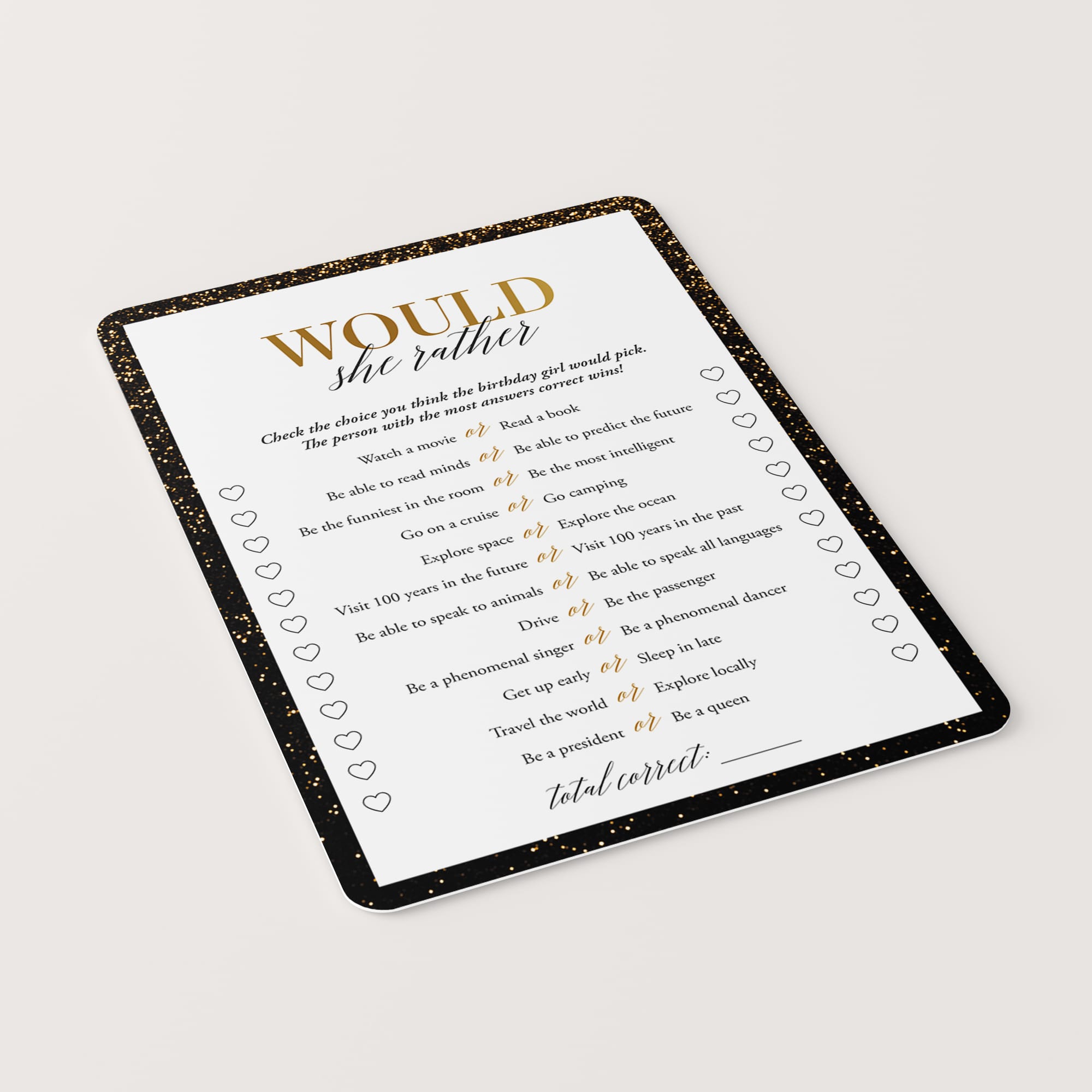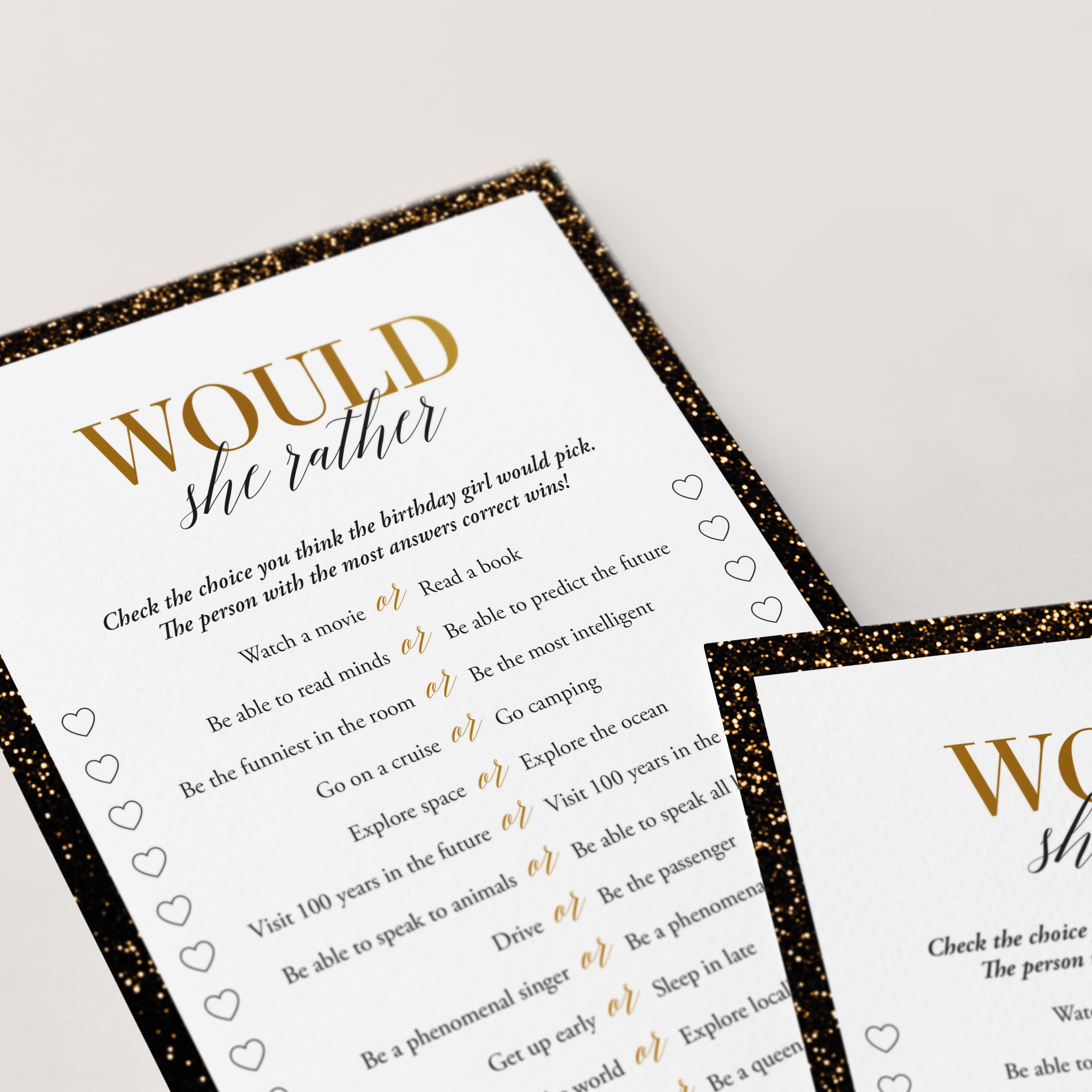 Are you looking for the perfect icebreaker to get people talking and in the party mood for your birthday party? Play Would She Rather! After all, your guests have one thing in common: you know the birthday girl. This black and gold Would She Rather birthday game 12 Would She Rather questions is the perfect addition to a birthday party for a woman of any age.