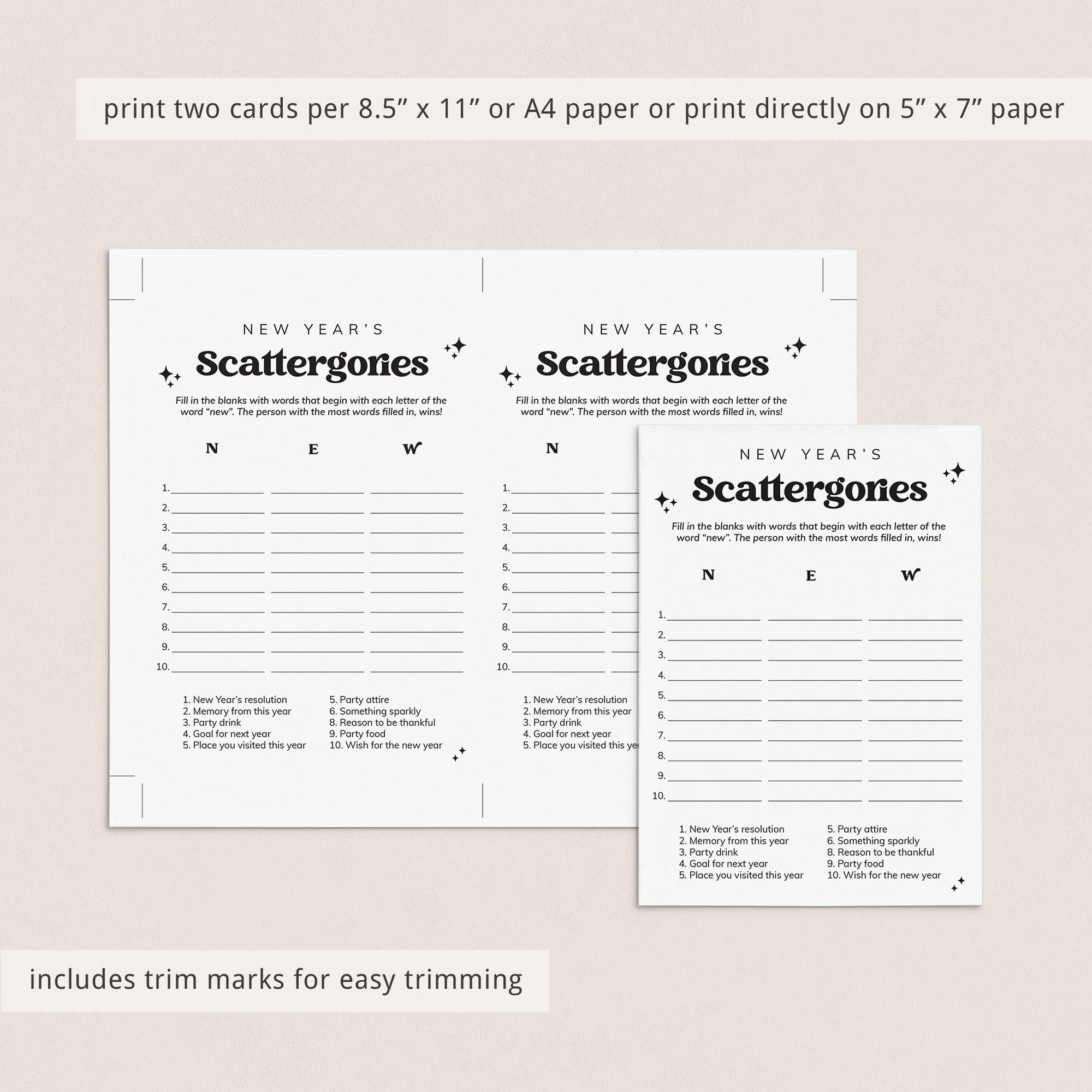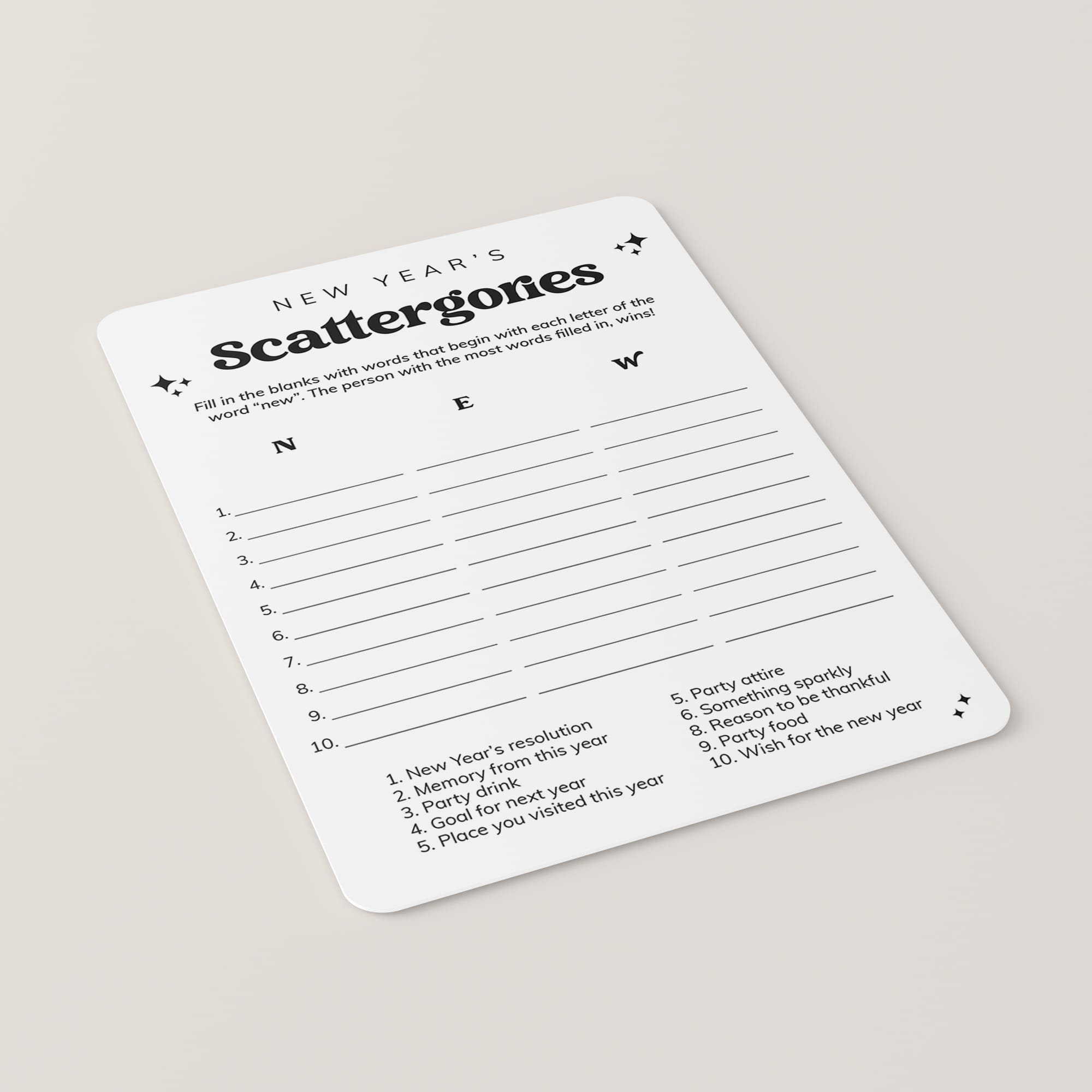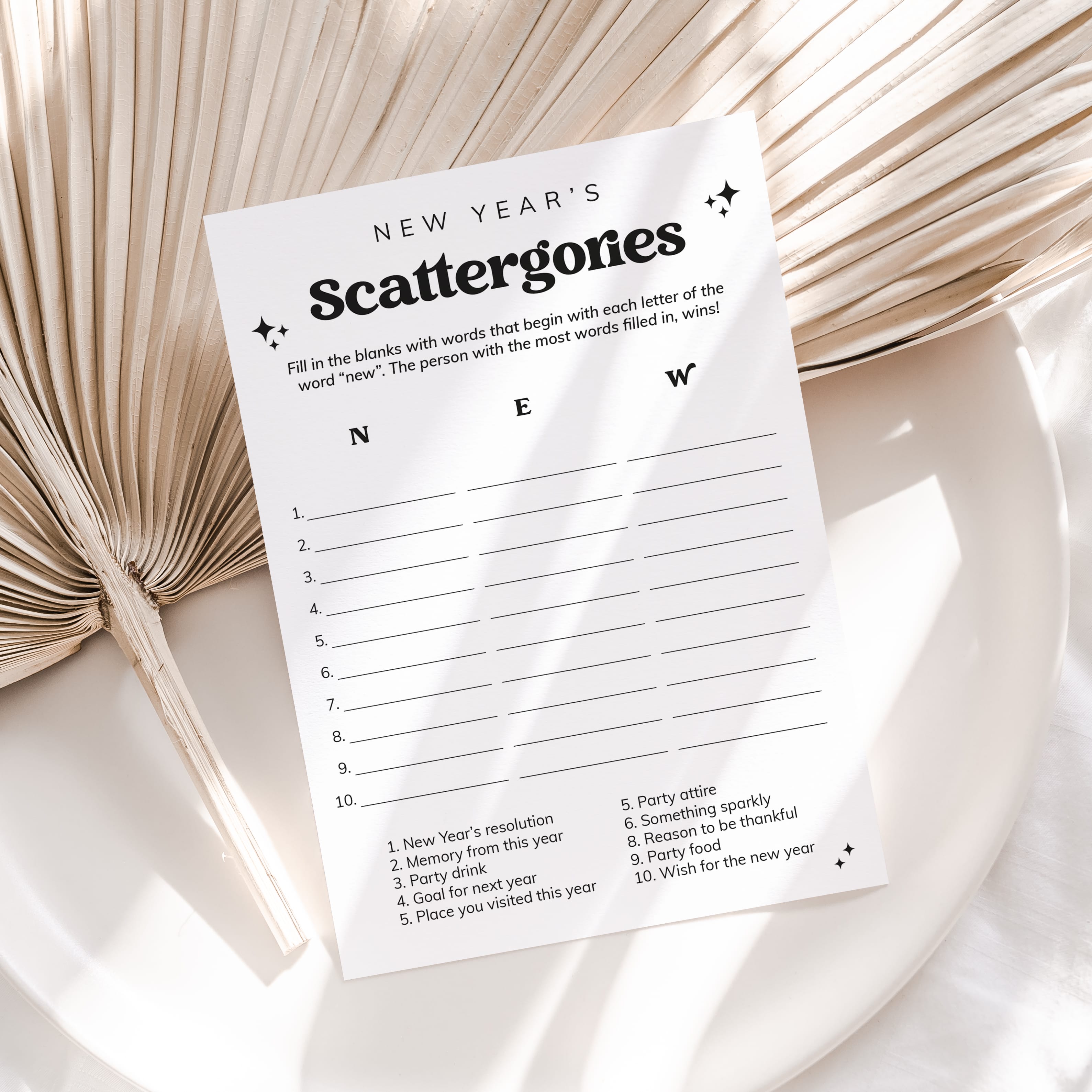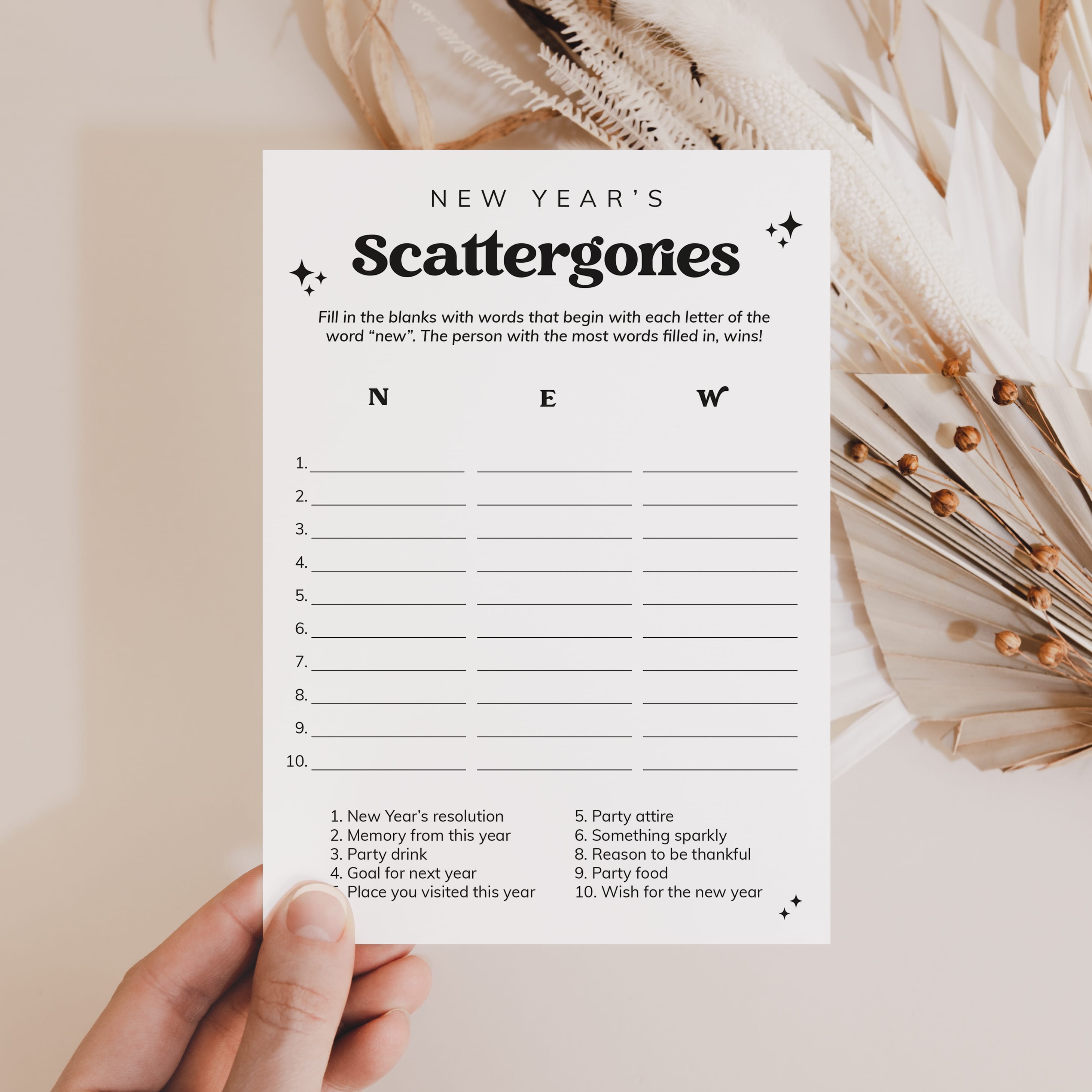 How many words can you fill in with the letters "N", "E" and "W"? Play Scattergories at your New Year's party with this minimalist black and white New Year's Scattergories game. It is a fun holiday activity for... Read more