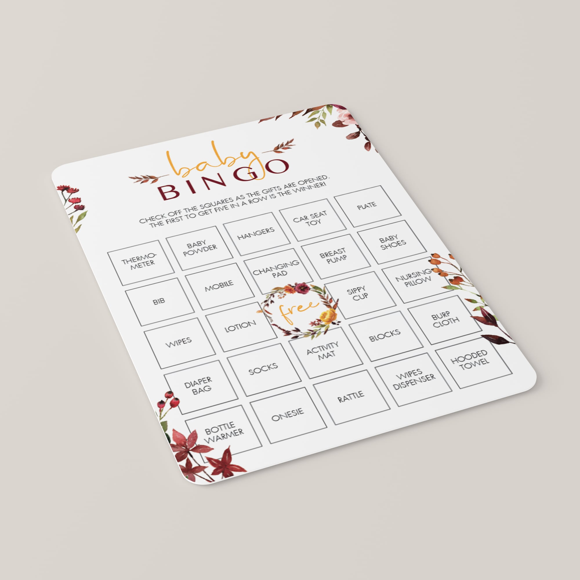Let not only the mom-to-be enjoy unpacking gifts! Play Bingo with these bohemian baby shower baby bingo cards with burgundy flowers. Check off the squares as the gifts are opened. The first to get five in a row is the winner! These bingo cards are perfect for any boho or autumn themed baby shower.