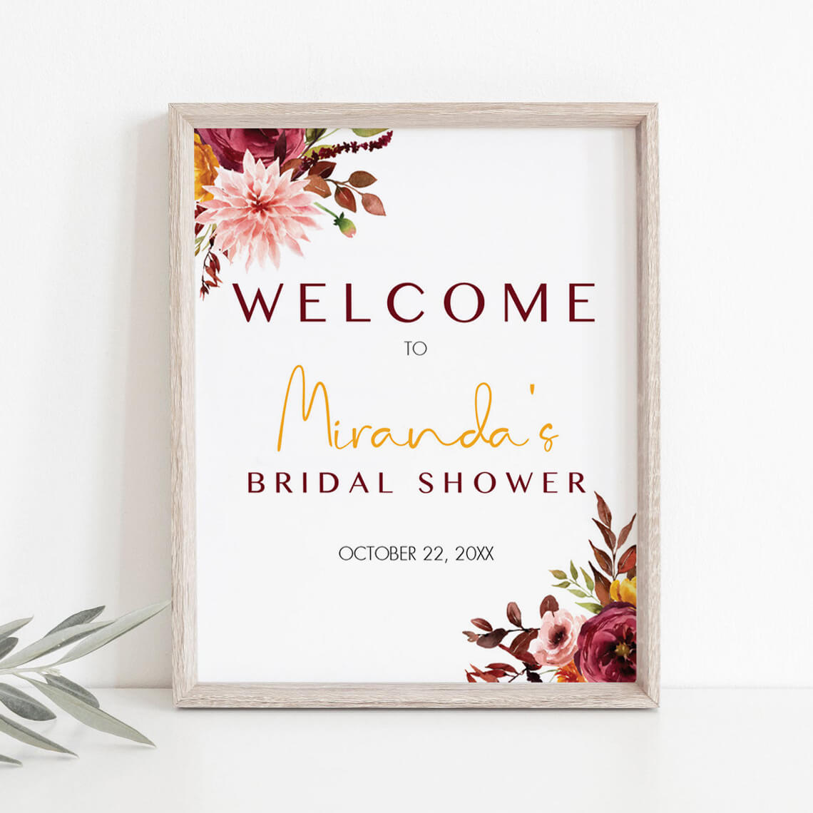 They say that first impressions are important. Set the tone for your boho bridal shower and decorate your event with this gorgeous bridal shower welcome poster with burgundy flowers.