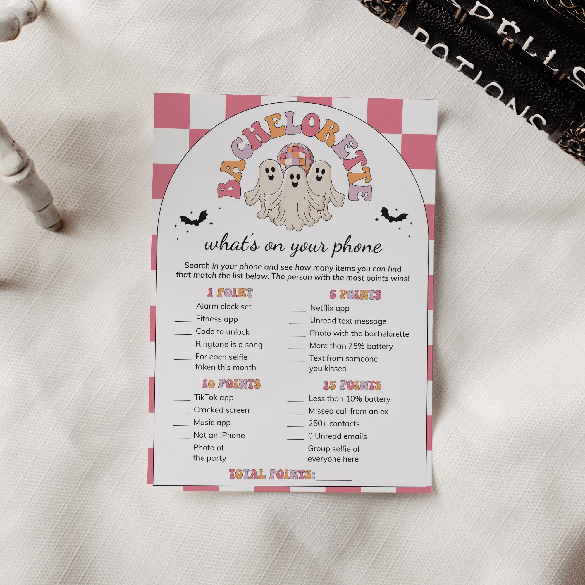 All guests need to play is a smartphone and one of these What's On Your Phone game cards with cute ghosts and pink checkered background.