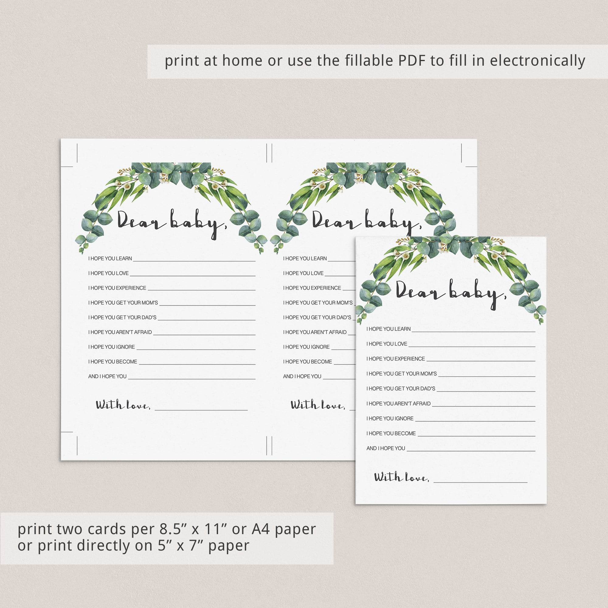 For an in-person baby shower, download and print the cards as many times as you need. We recommend printing on a nice heavy card stock for highest quality feel. Print right from your computer in a matter of minutes or have the cards printed at your favorite print shop.