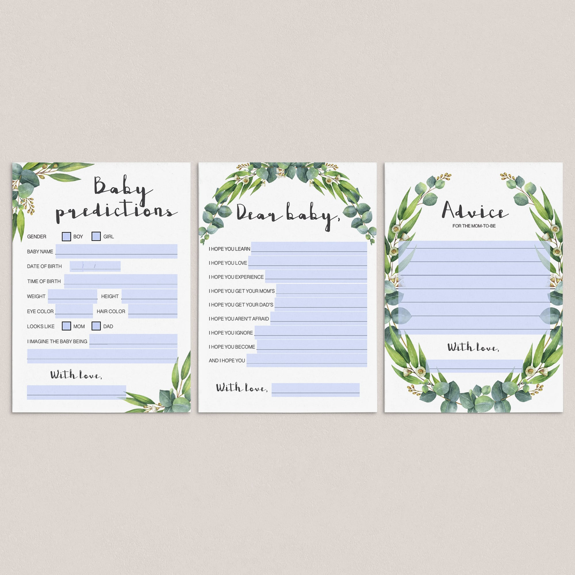 • Baby Predictions card (two versions included, with and without baby gender prediction).