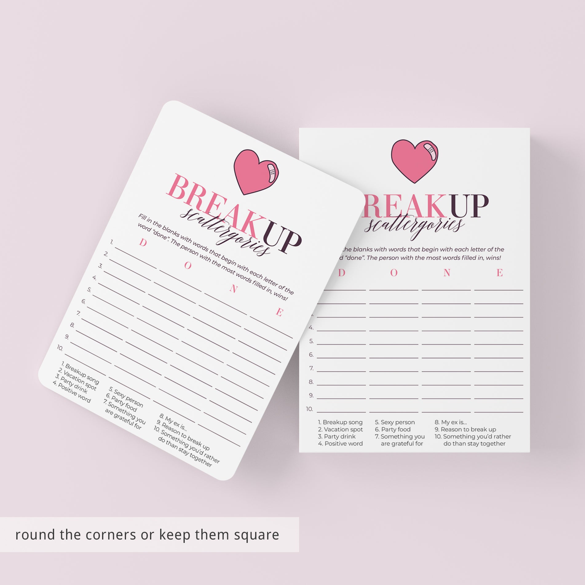 How many words can you fill in with the letters "D", "O", "N" and "E"? Play Scattergories at your breakup party with these printable game cards.