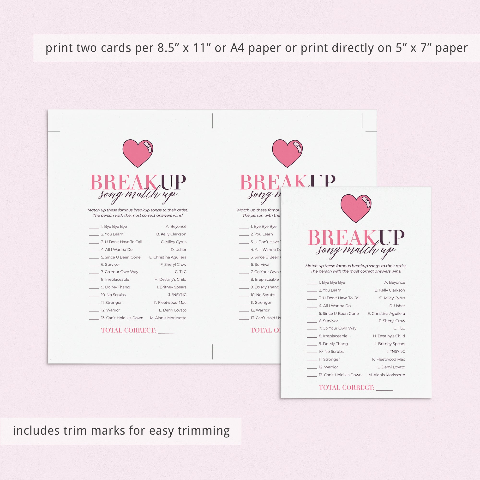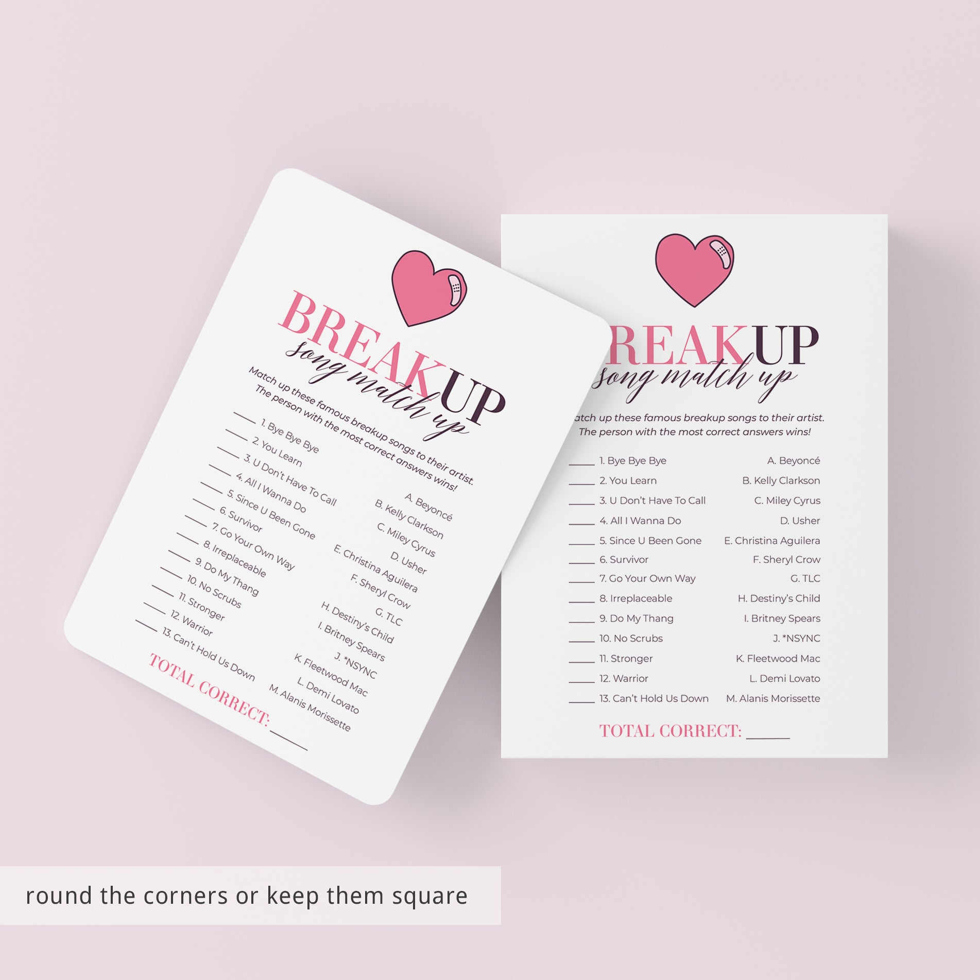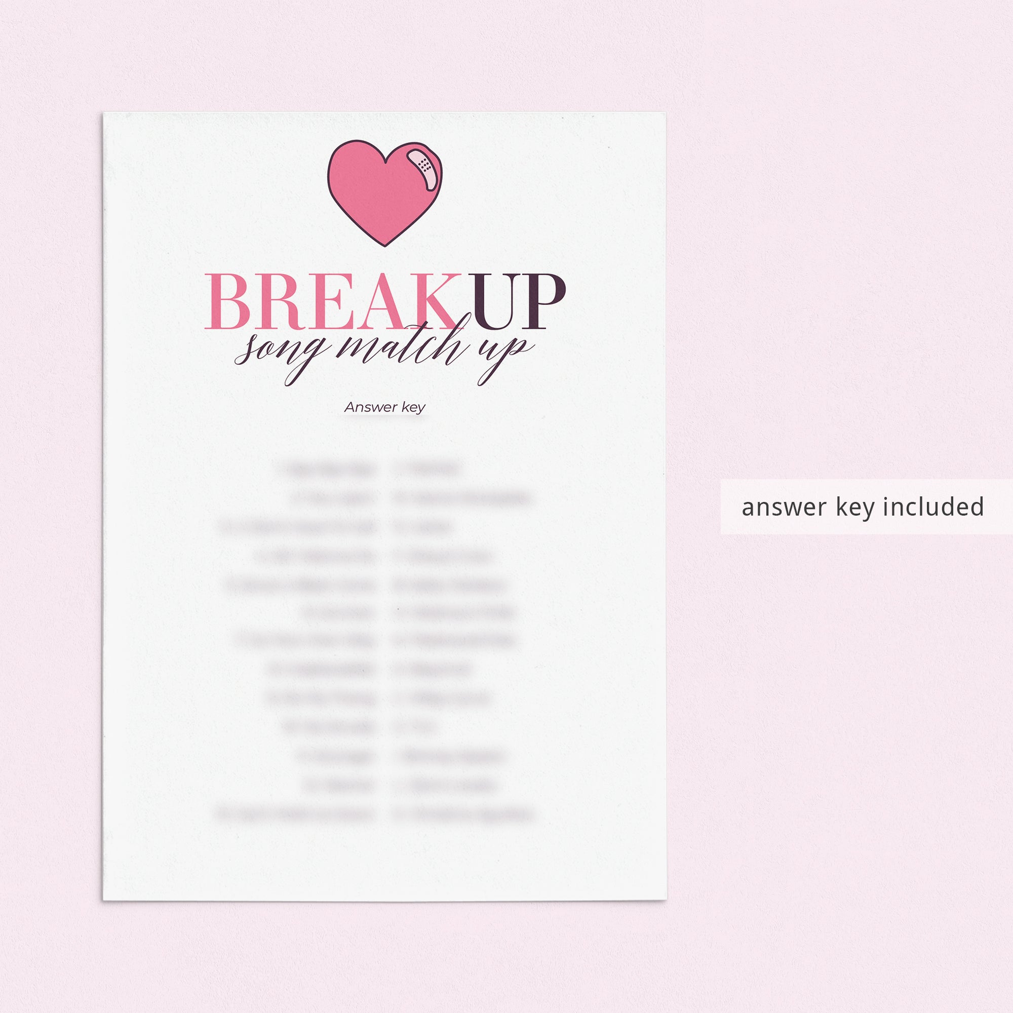 The game is very easy to play. Hand out this breakup song matching game to your guests. Have them match the breakup song titles with the corresponding artist or band. The person with the most correct answers wins. An answer key is included.