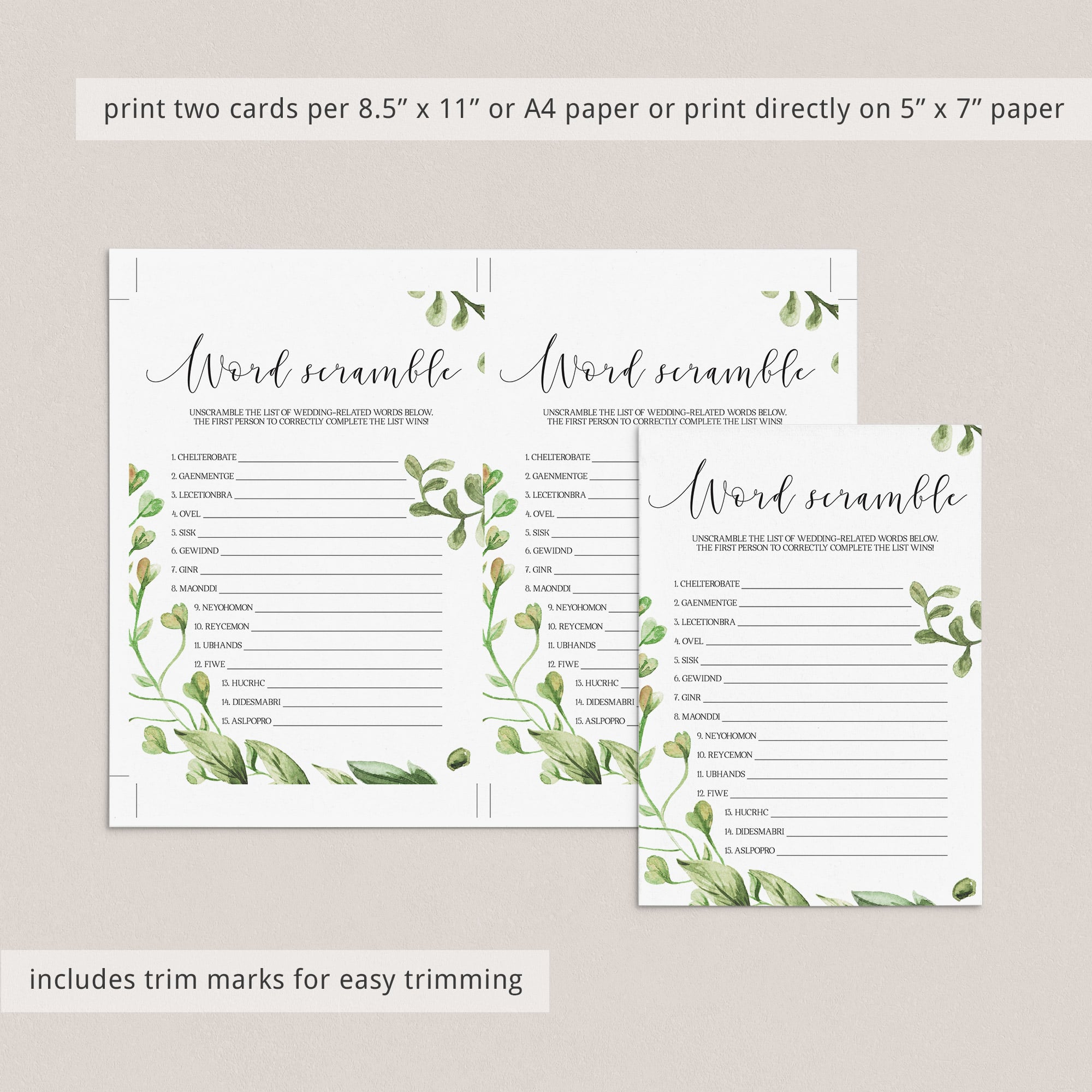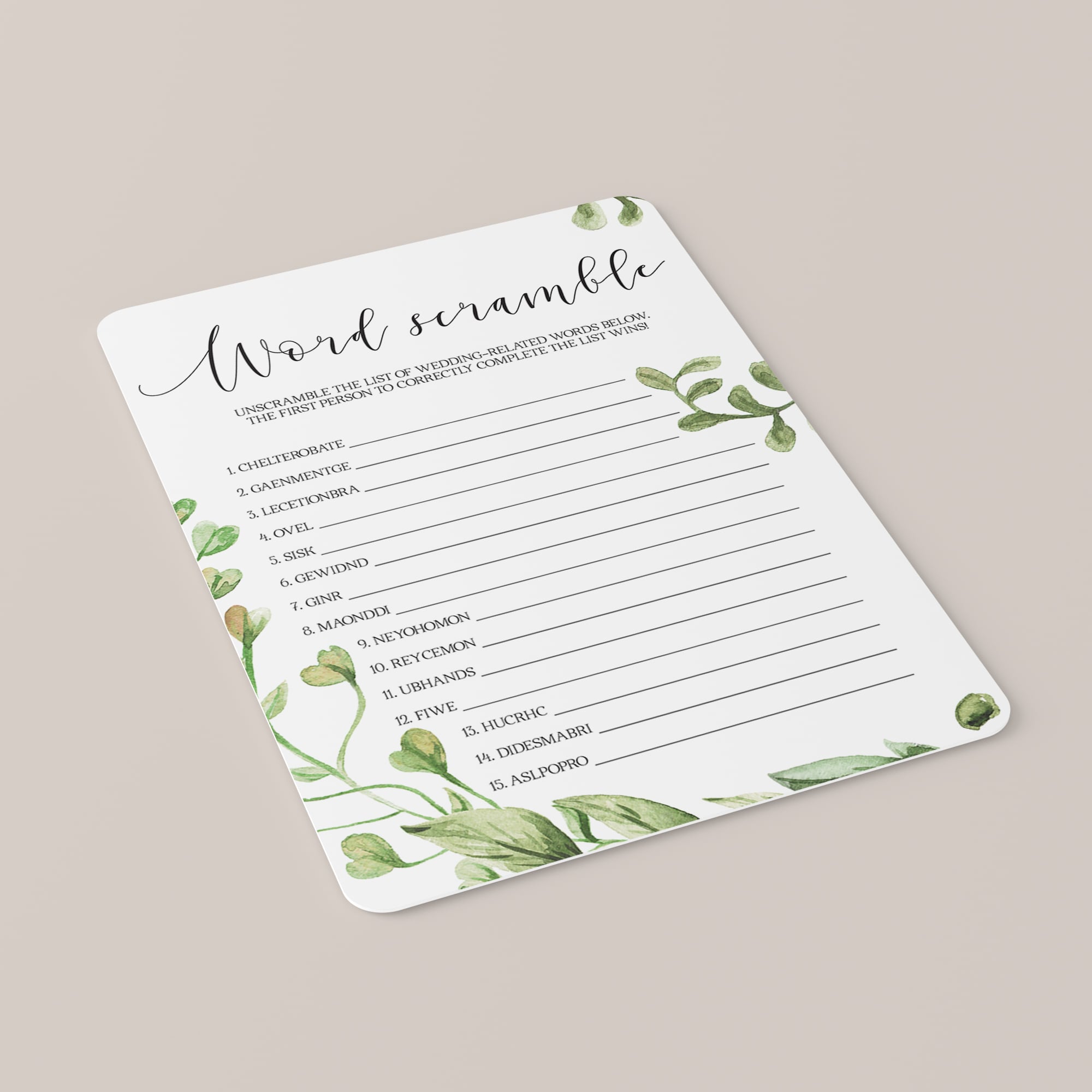Play one of the most popular wedding games with these gorgeous Word Scramble game cards. The greenery cards would be perfect for a botanical bridal shower and will create a fun and enjoyable moment for all of your guests.