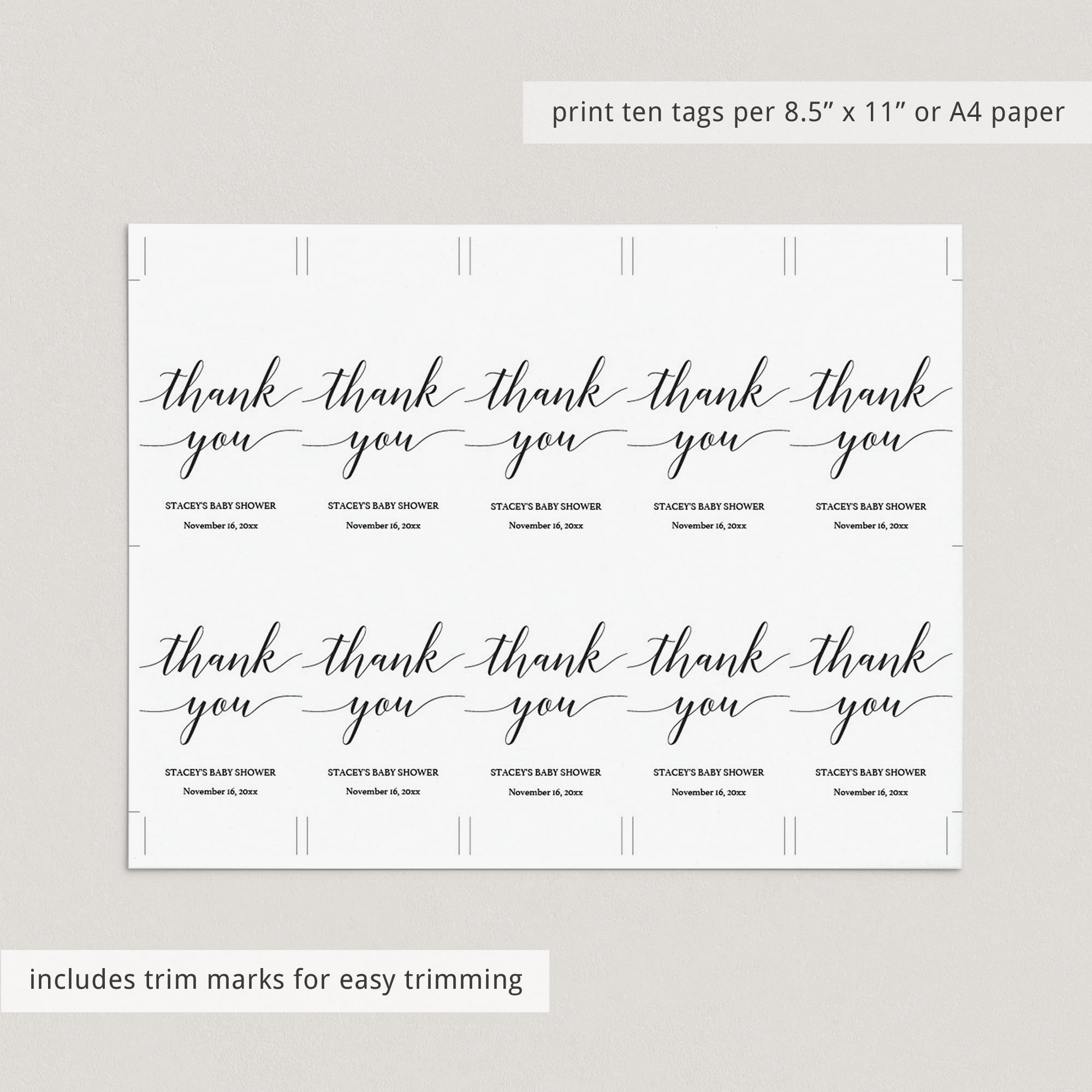 Print the favor tags on card stock, trim them following the trim marks, put a cord through the hole and you're ready to display them! The tag can be used as favor tag, thank you tag or gift tag.