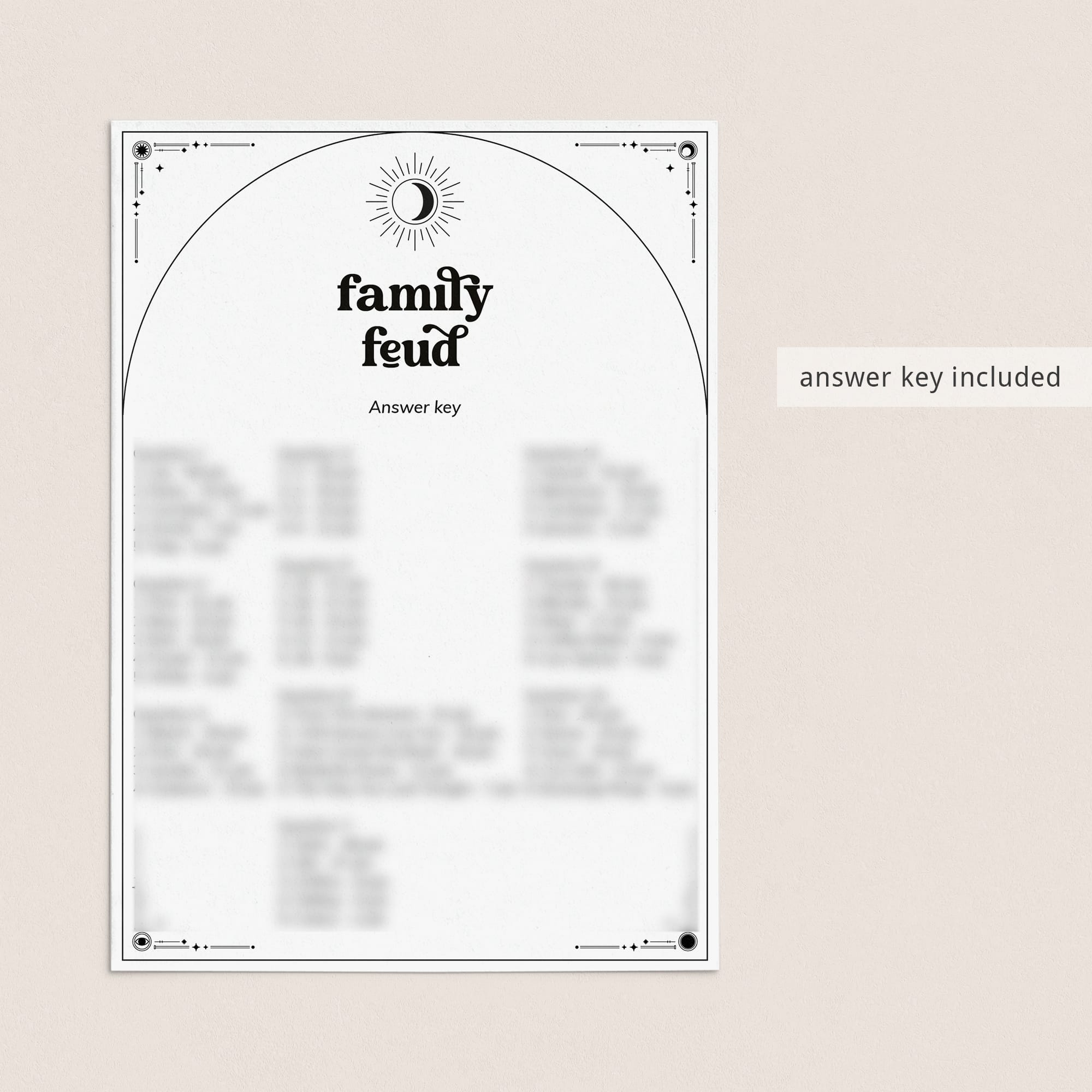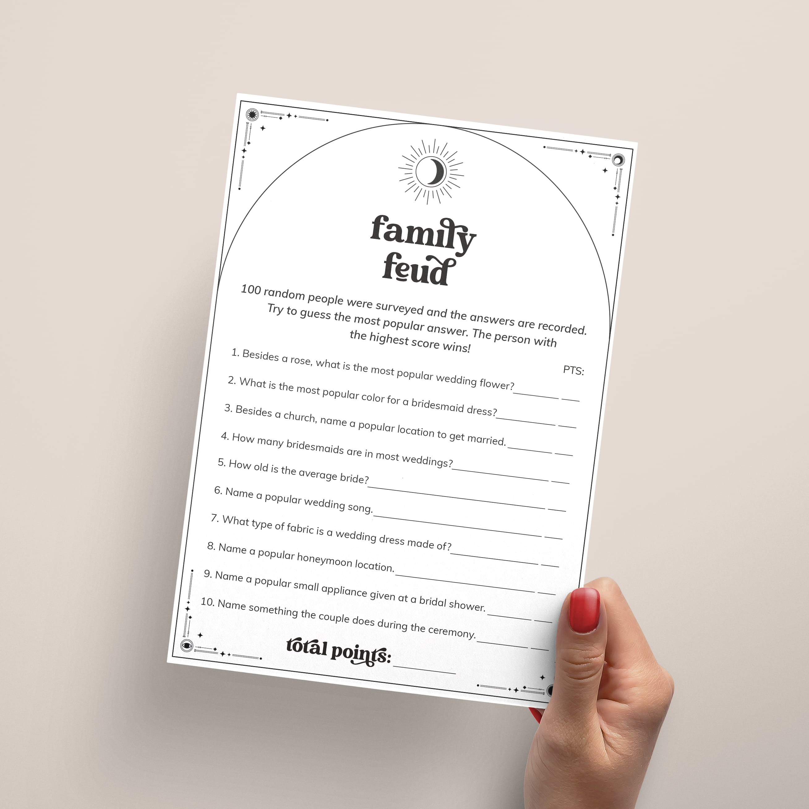 Add some fun to your Celestial theme bridal shower with this Bridal Shower Family Feud game. Family Feud is one of the best games ever. Have your friends compete to guess the most popular answer to 10 bridal feud questions. An answer key with the Bridal Family Feud answers and points is included. The person or team with the highest score wins!