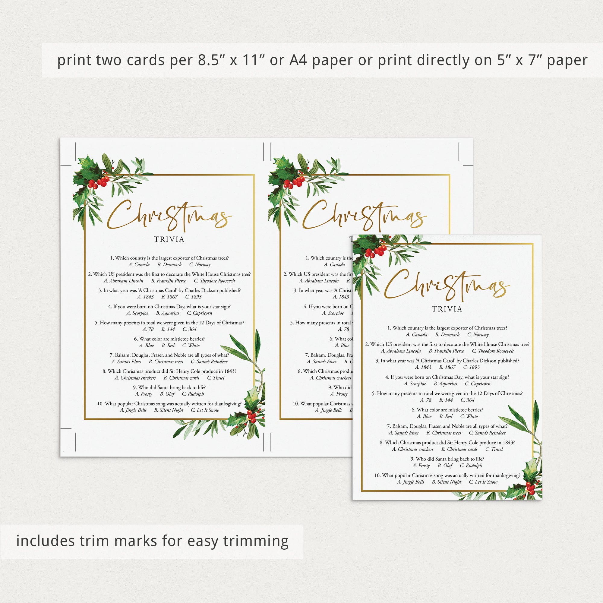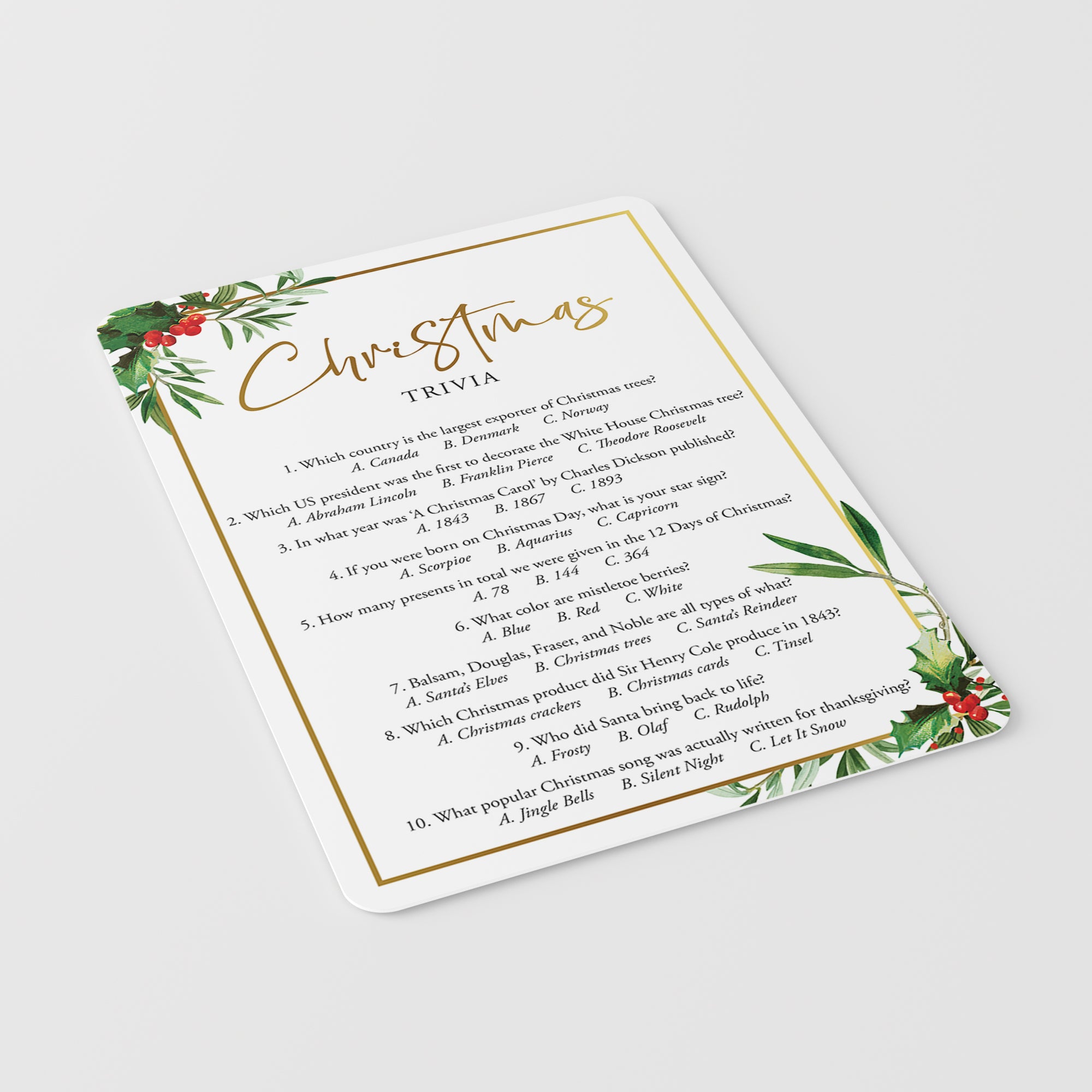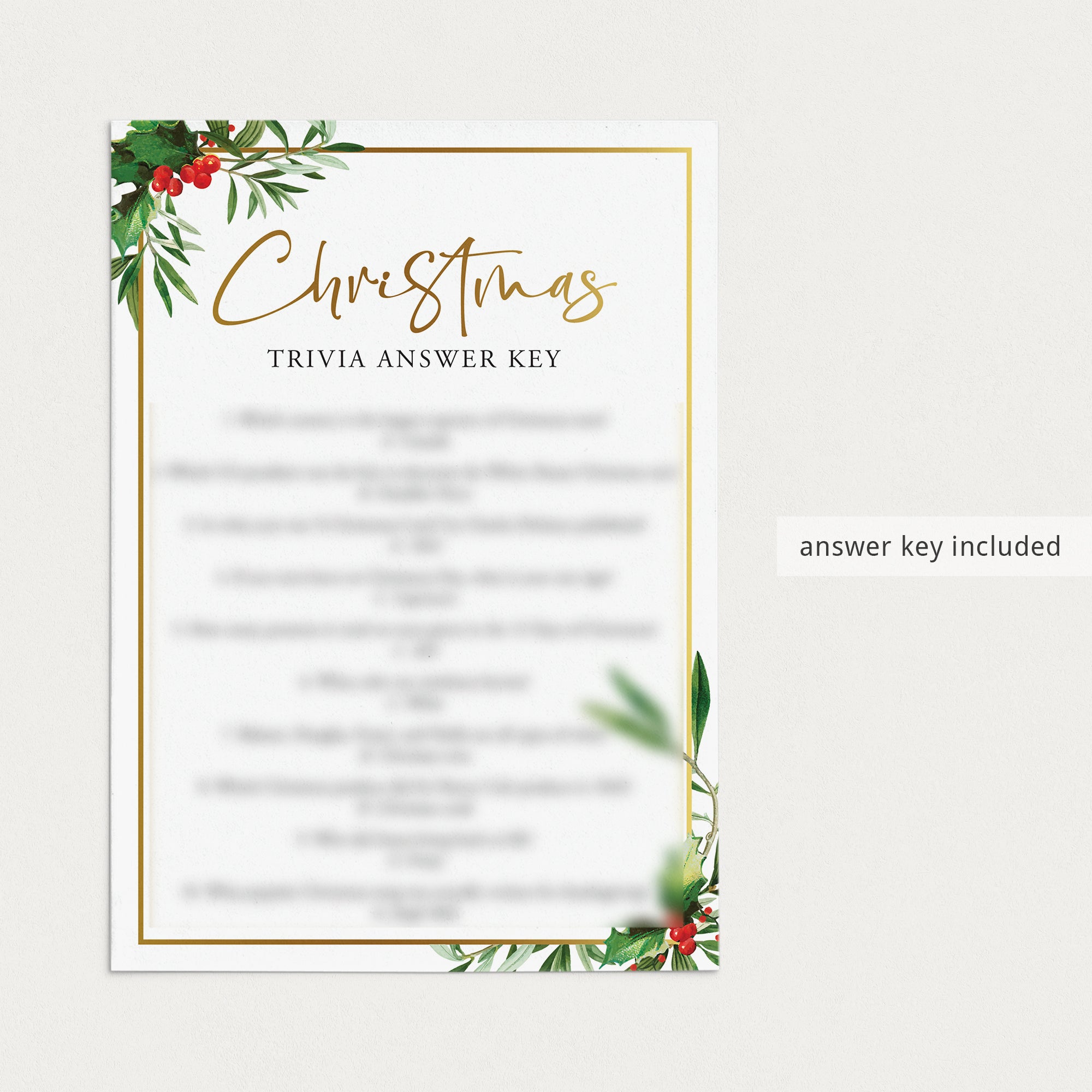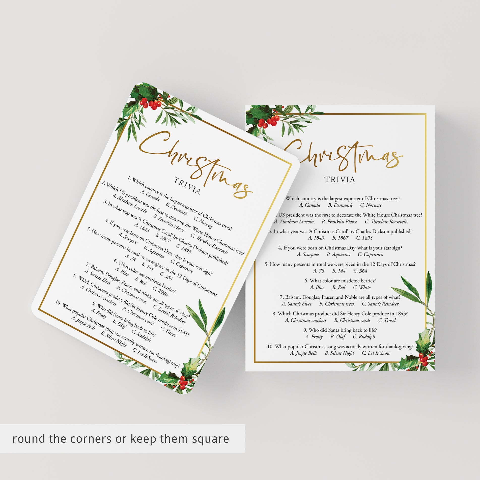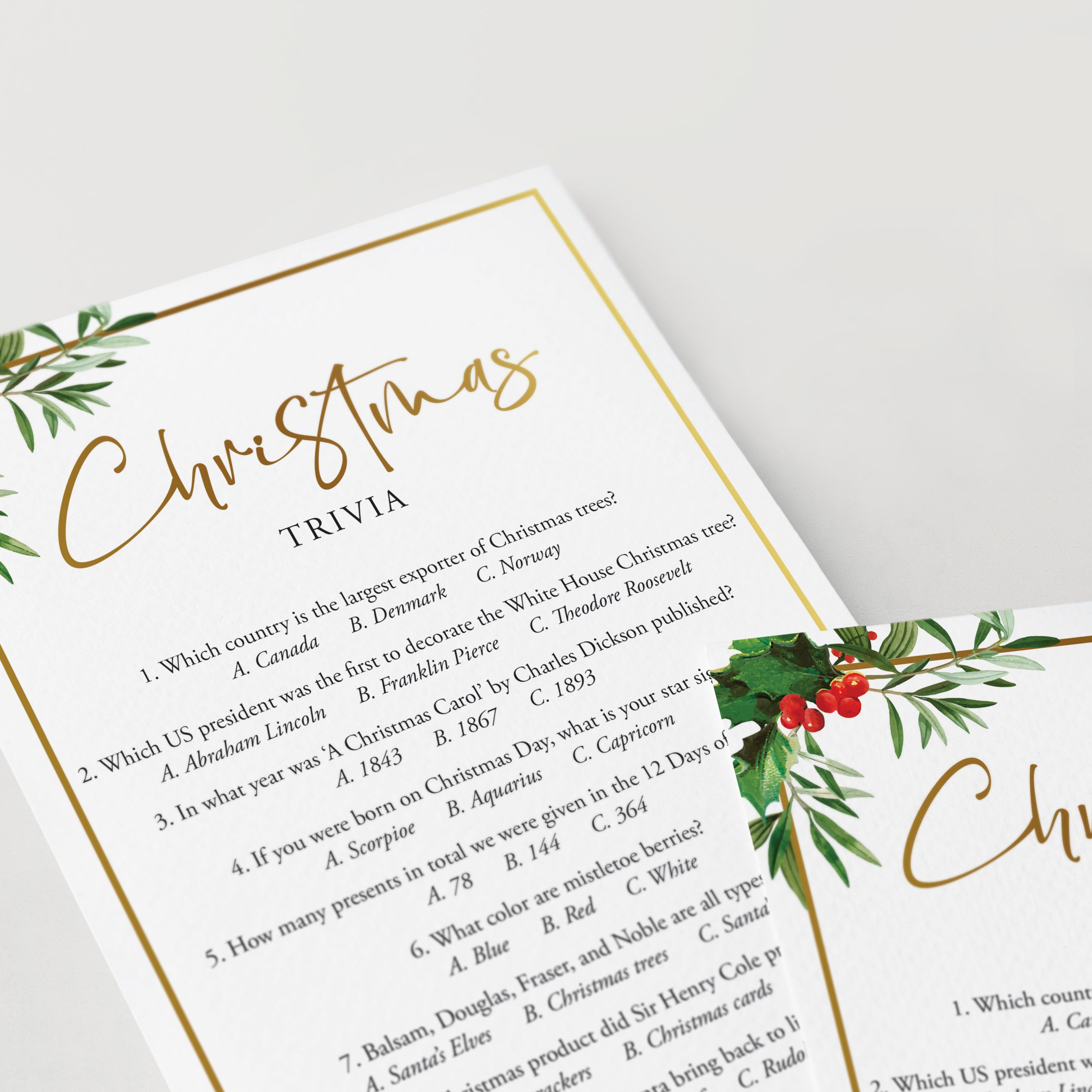 Are you hosting a Christmas party? Use this chic Christmas Trivia Quiz with gorgeous watercolor Christmas greenery and gold border to test your guests Christmas knowledge. Which country is the largest exporter of Christmas trees? And what popular Christmas song was actually written for Thanksgiving? Play this fun Christmas trivia game to find out! It’s a great challenging game to play at your Christmas dinner party.