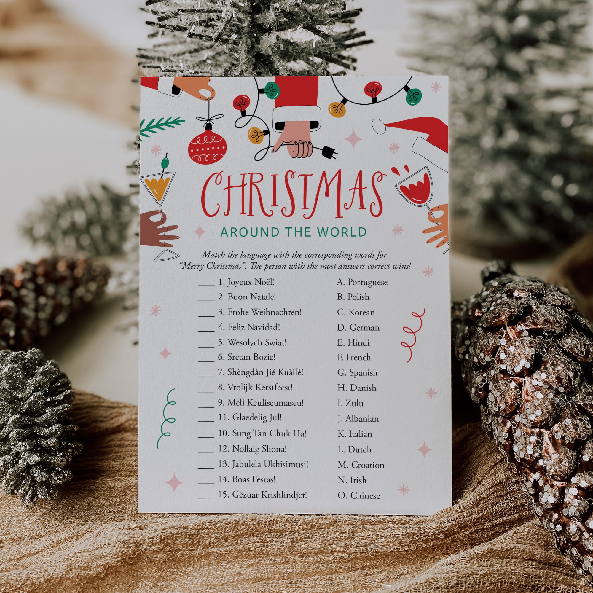 The game is very easy to play. Print and distribute these Christmas game cards and a pen to each of your guests. The have to match each version of the words “Merry Christmas” with its language of origin. The person with the most correct answers wins.