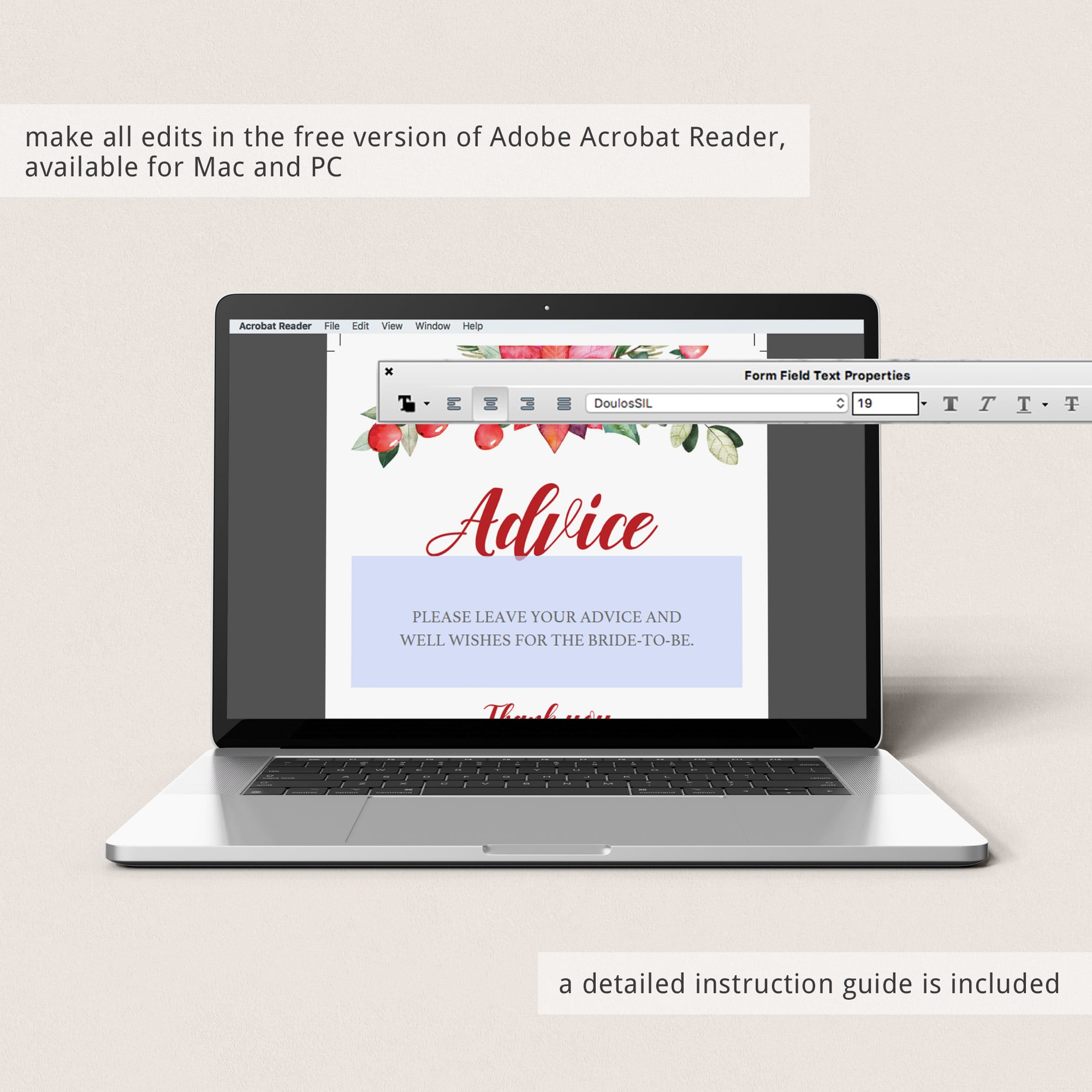 Select the text you want to customize and start typing. Hit [Cmd-E] on Mac or [Ctrl-E] on PC to edit the font, style, size and color. Only highlighted text is editable; other design elements are locked. You will find detailed instructions on how to edit your template in the included instruction guide.