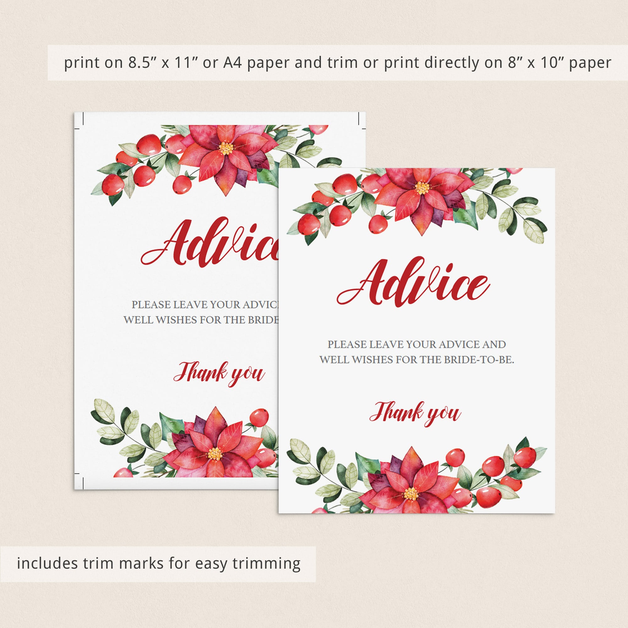 Ask your bridal shower guests to leave their well wishes and words of advice for the bride-to-be with this gorgeous Christmas bridal shower advice sign with red and white flowers and green leaves. The sign will ensure that you have those special winter vibes at your party.