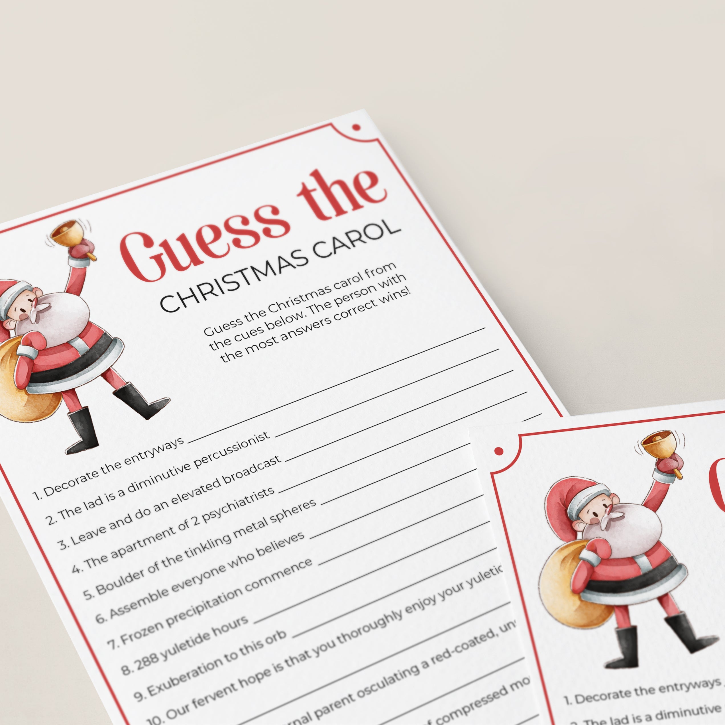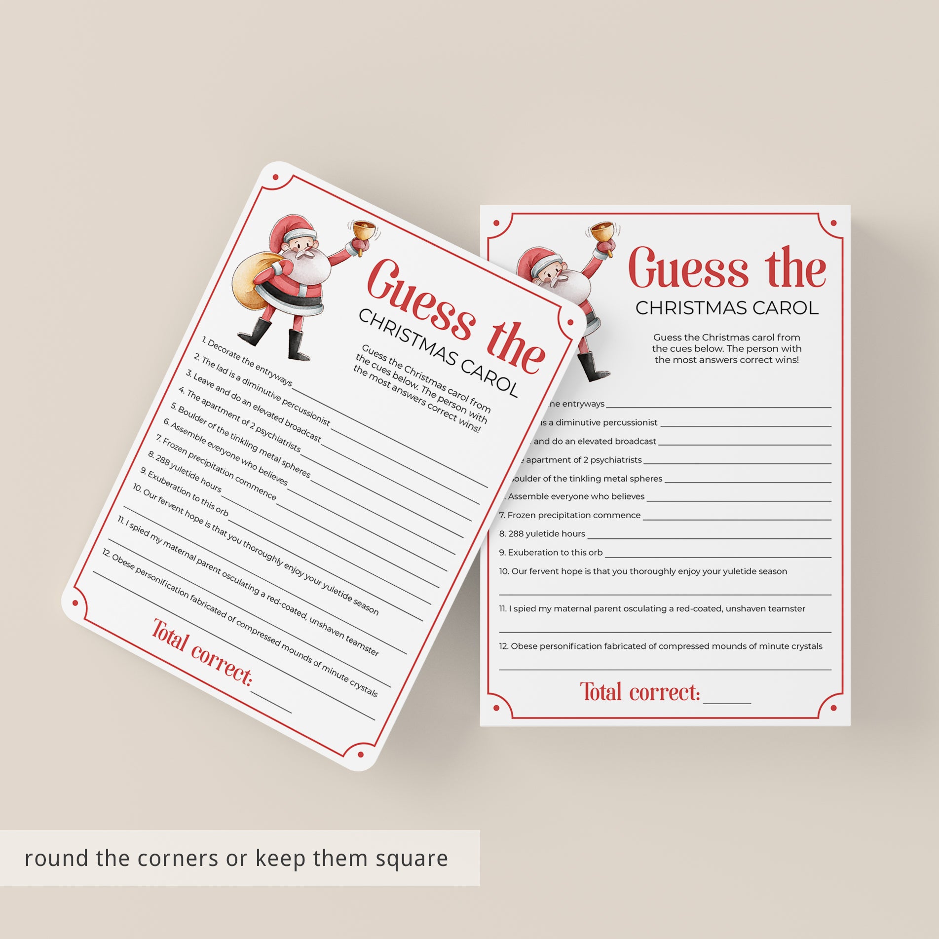 This Christmas Carol Riddles trivia is a fun Christmas party game that involves guessing a popular Christmas carol by clue titles synonymous with the original titles. Some clues are easier than others, but it’s a fun game to start your party off with. For example “Decorate the entryways” is the Christmas song “Deck the halls”.