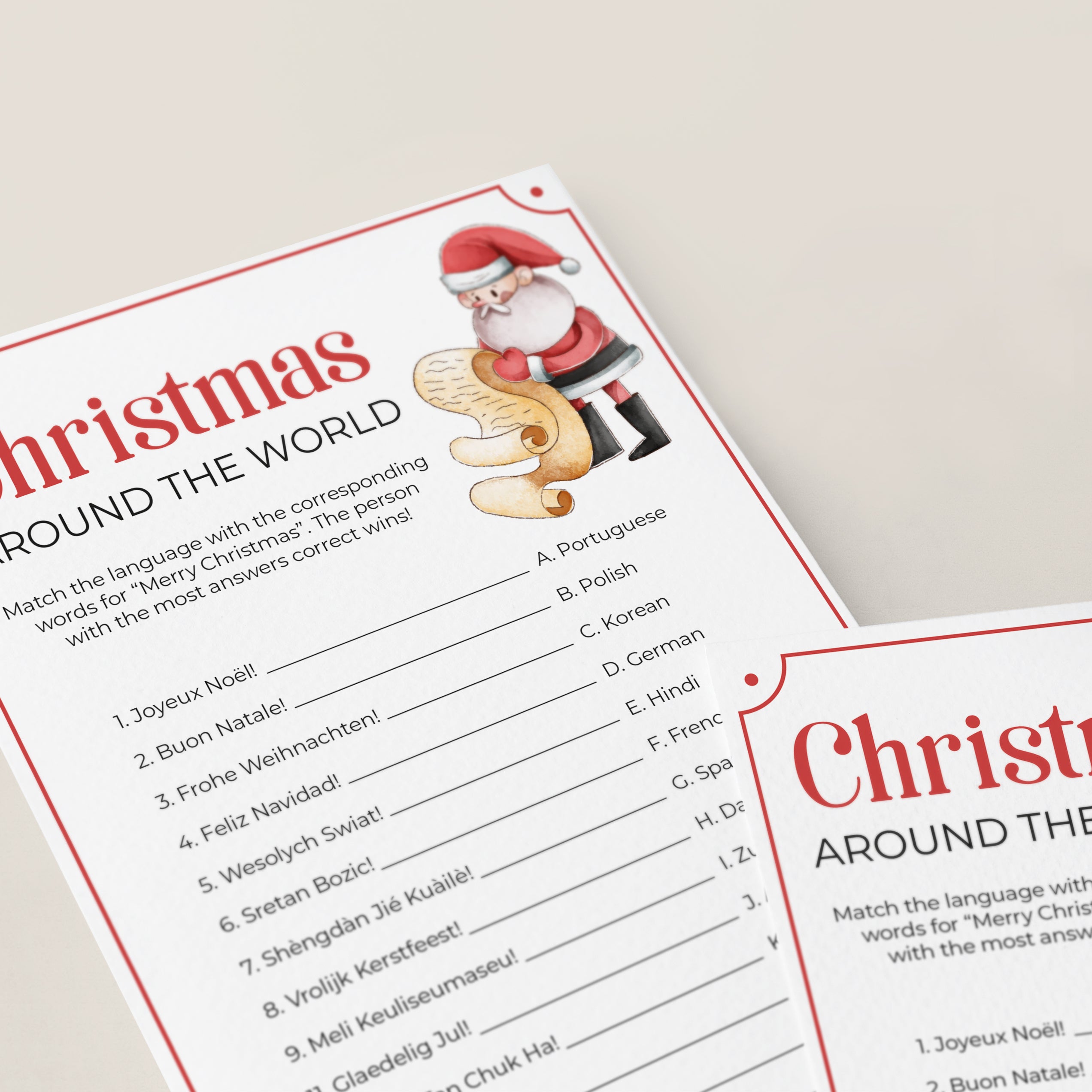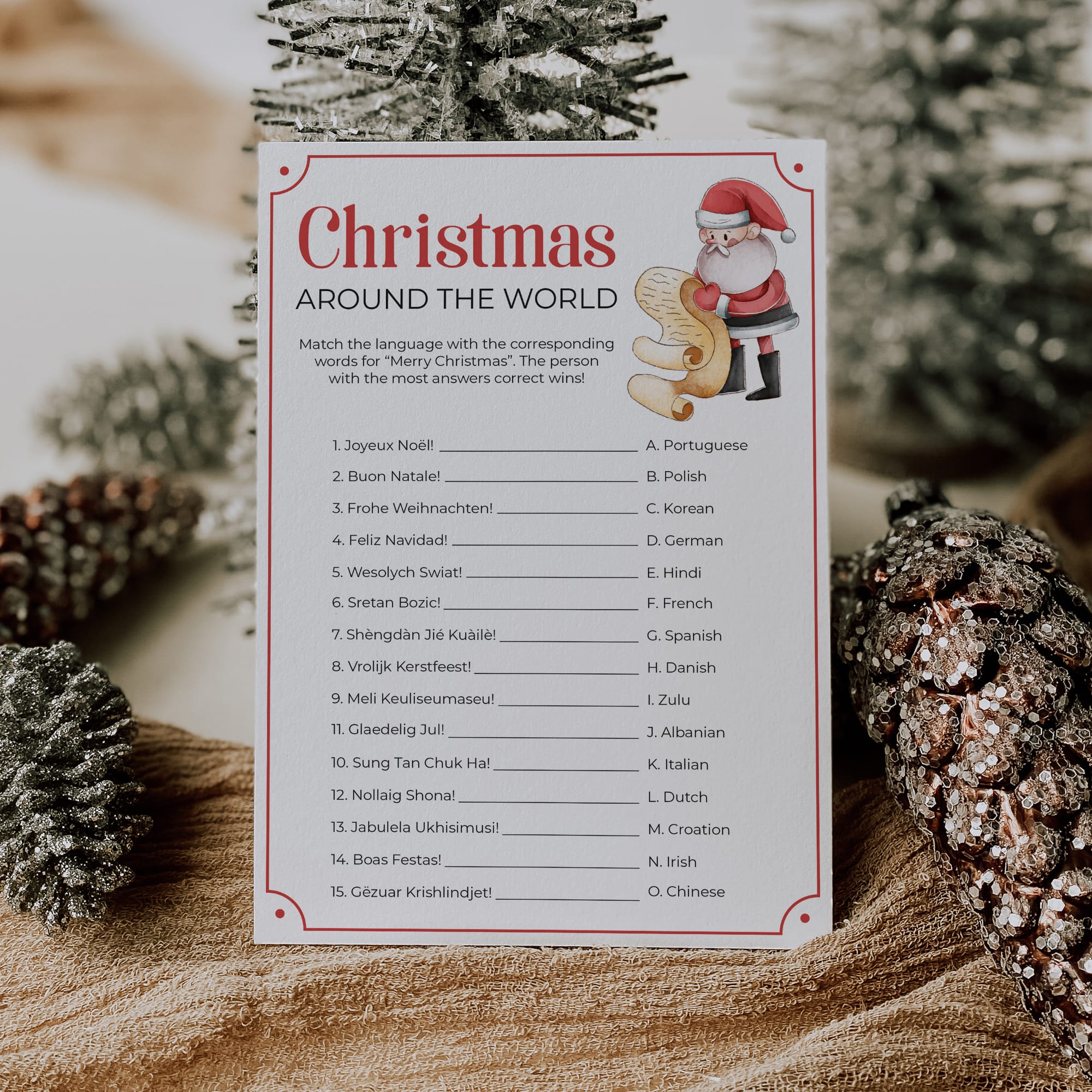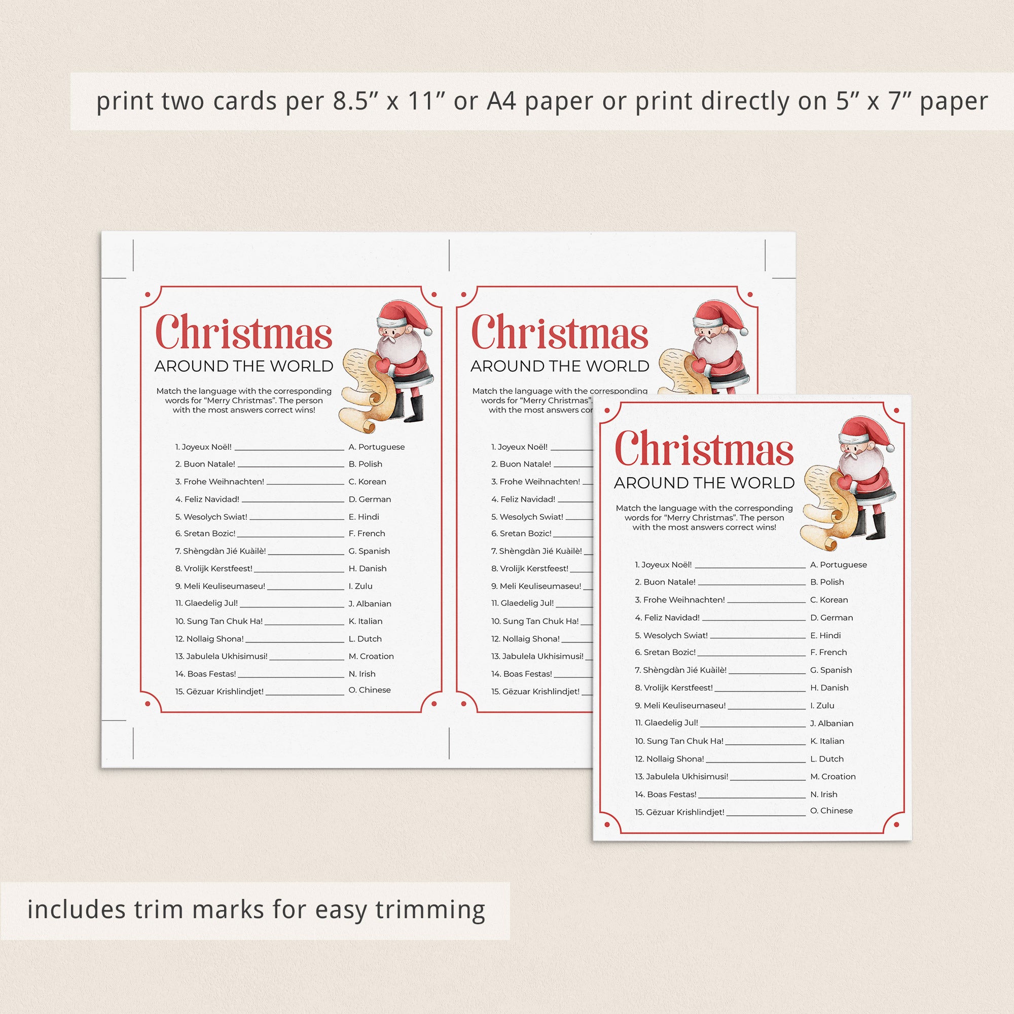 Feliz Navidad! Find out how much you know about different languages and how they say Merry Christmas around the world! Play this fun Christmas family game with this game card with handdrawn Santa.