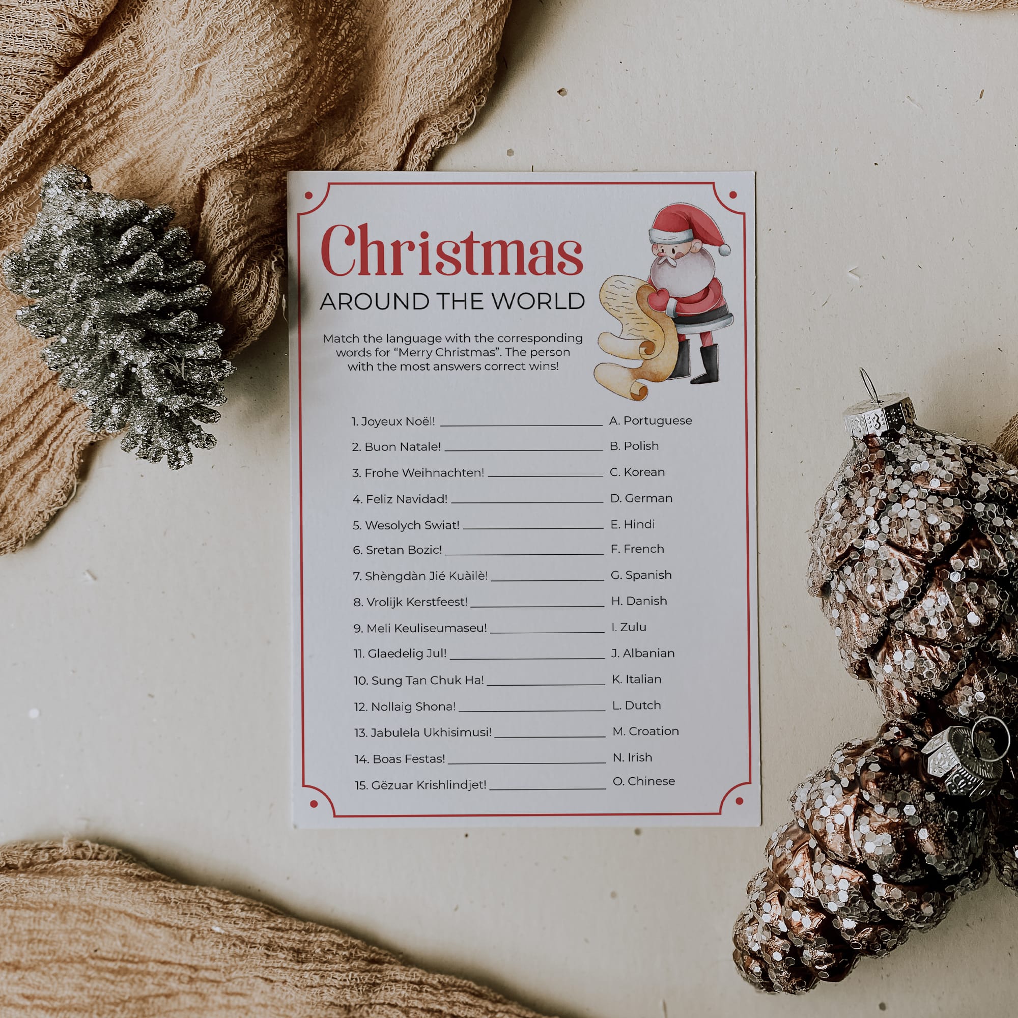 The game is very easy to play. Print and distribute these Christmas Around The World game cards and a pen to each of your guests. The have to match each version of the words “Merry Christmas” with its language of origin. The person with the most correct answers wins.