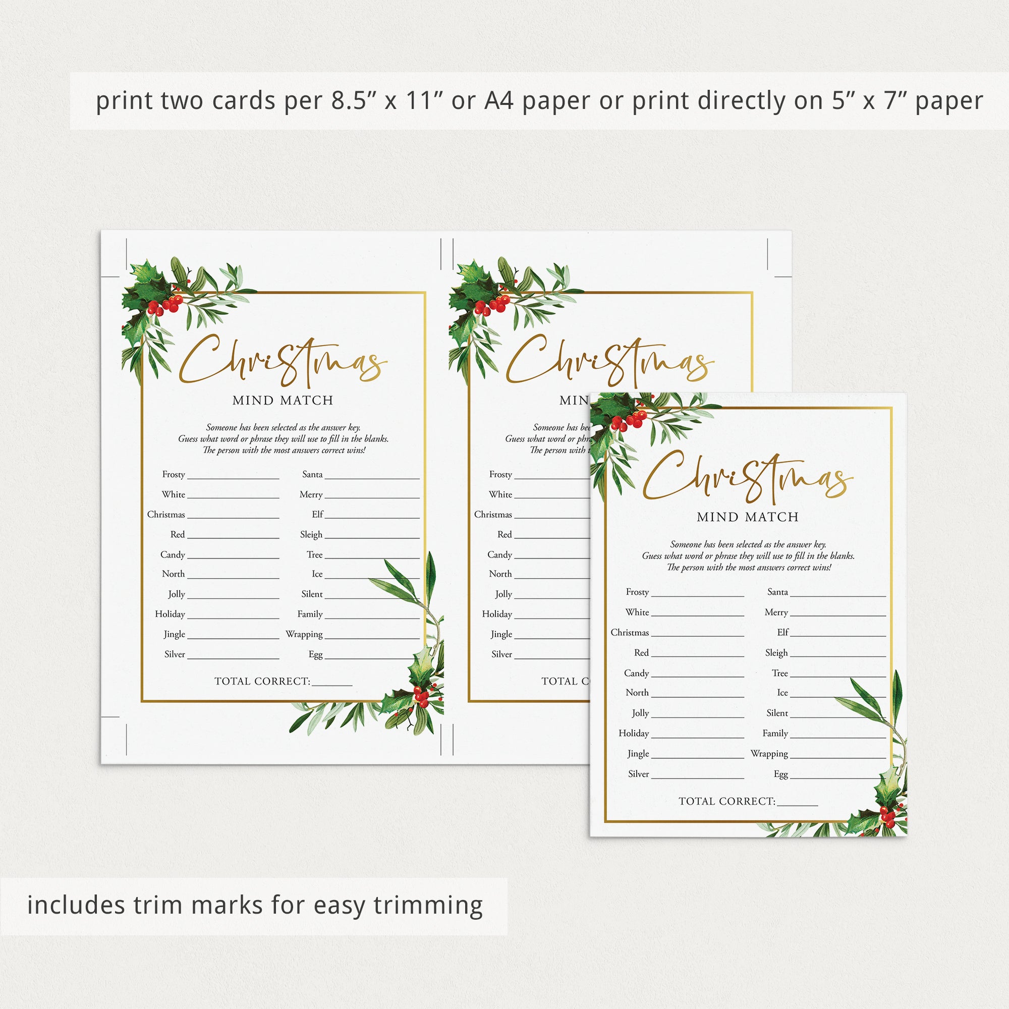 Are you hosting a Christmas party and looking for a fun icebreaker game? Play Mind Match with this elegant greenery Christmas game card! It is a fun activity for groups and very easy to play.