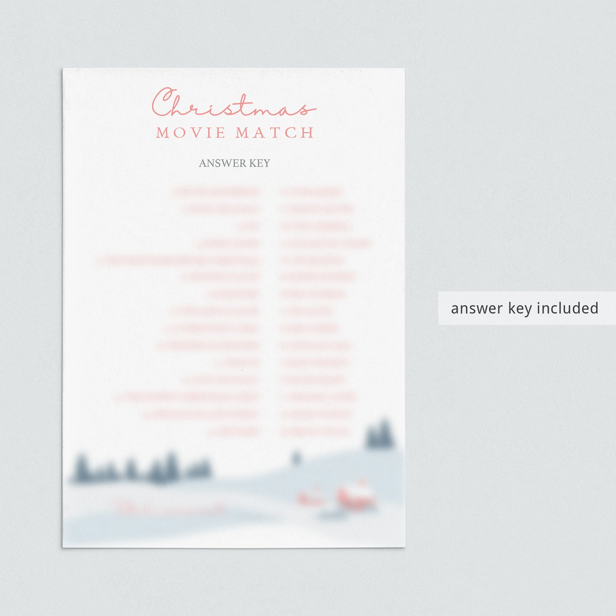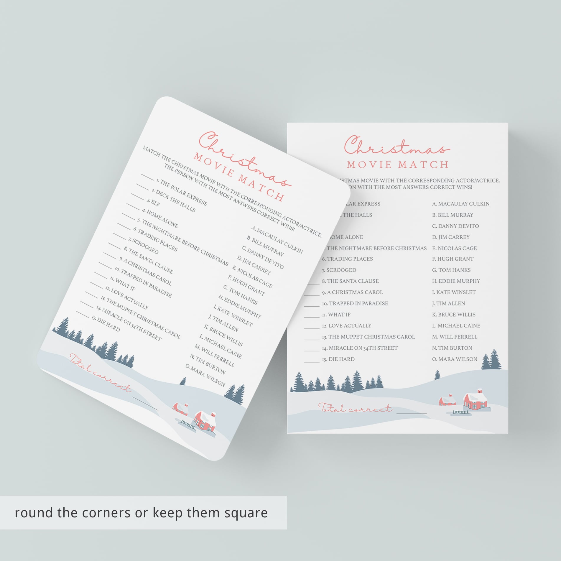 Are you looking for a fun game for your Christmas party? Play a Christmas Movie Quiz with this beautiful game sheet with Winter Wonderland landscape. This Christmas Movie quiz will have everyone racing to be first to match up the lead actor to the Christmas movie. If any of your friends, family members or co-workers, are movie buffs, then they might have a leg up when playing this fun game.