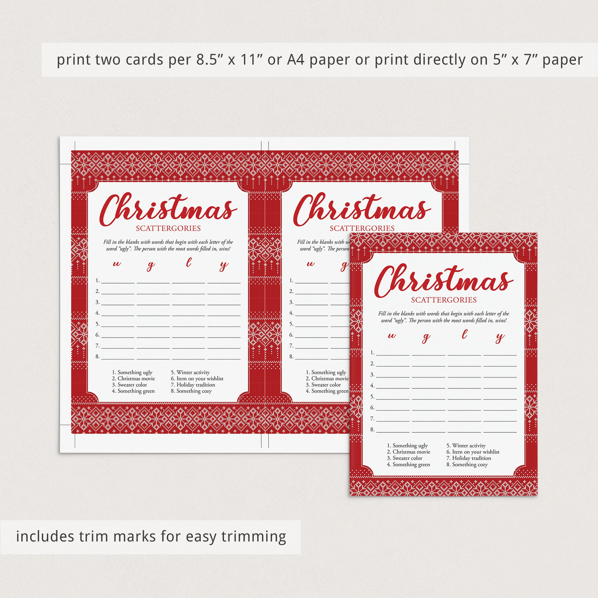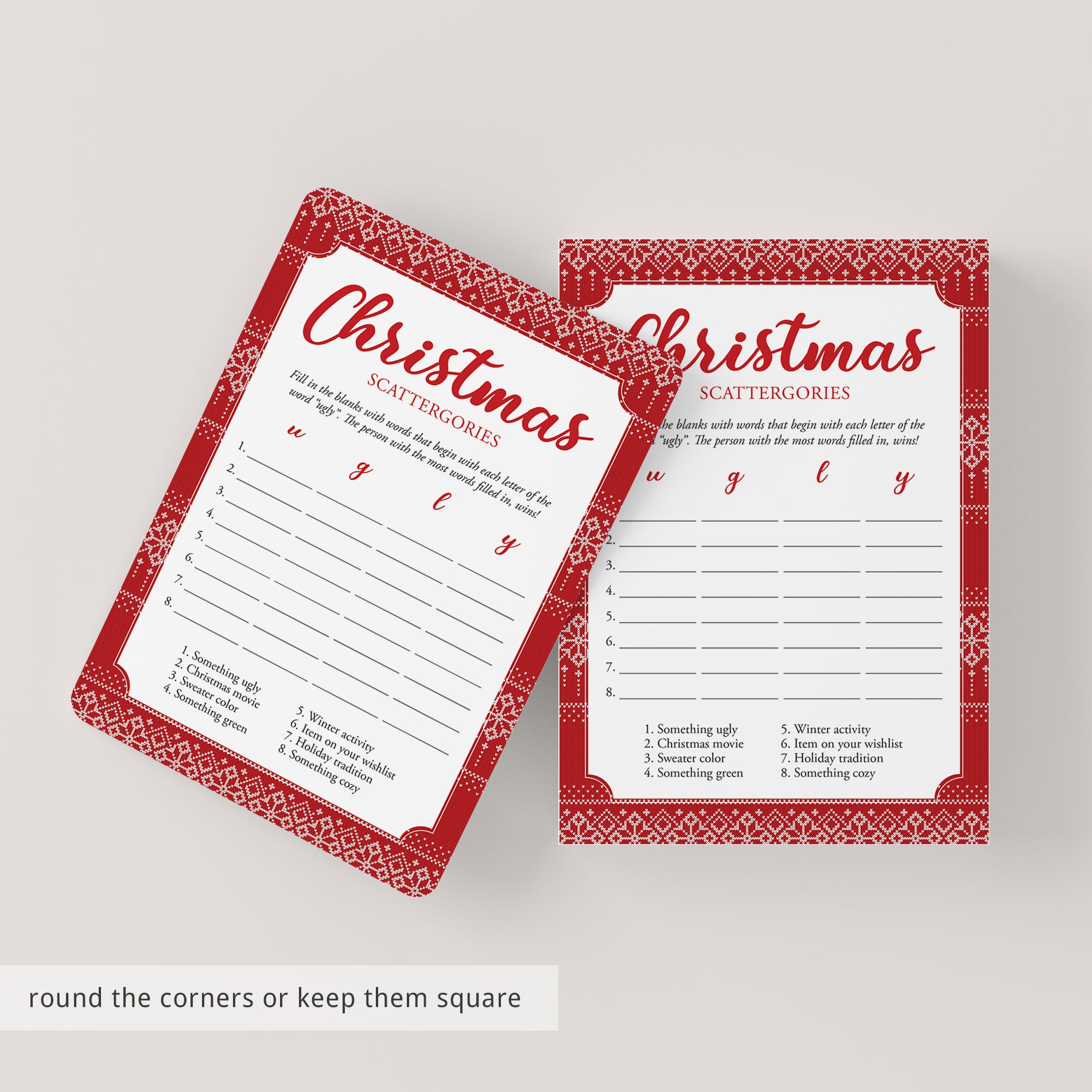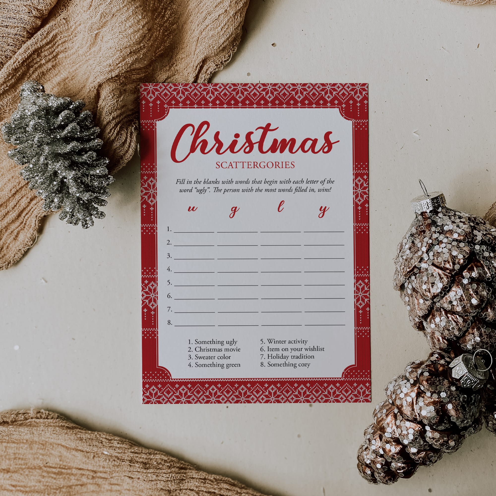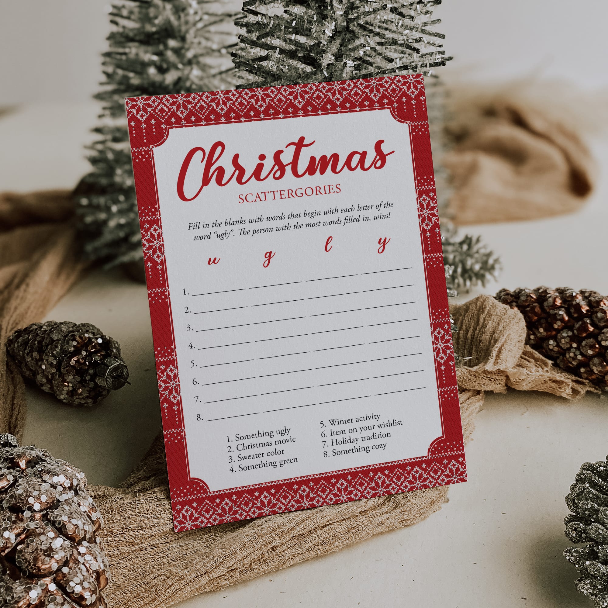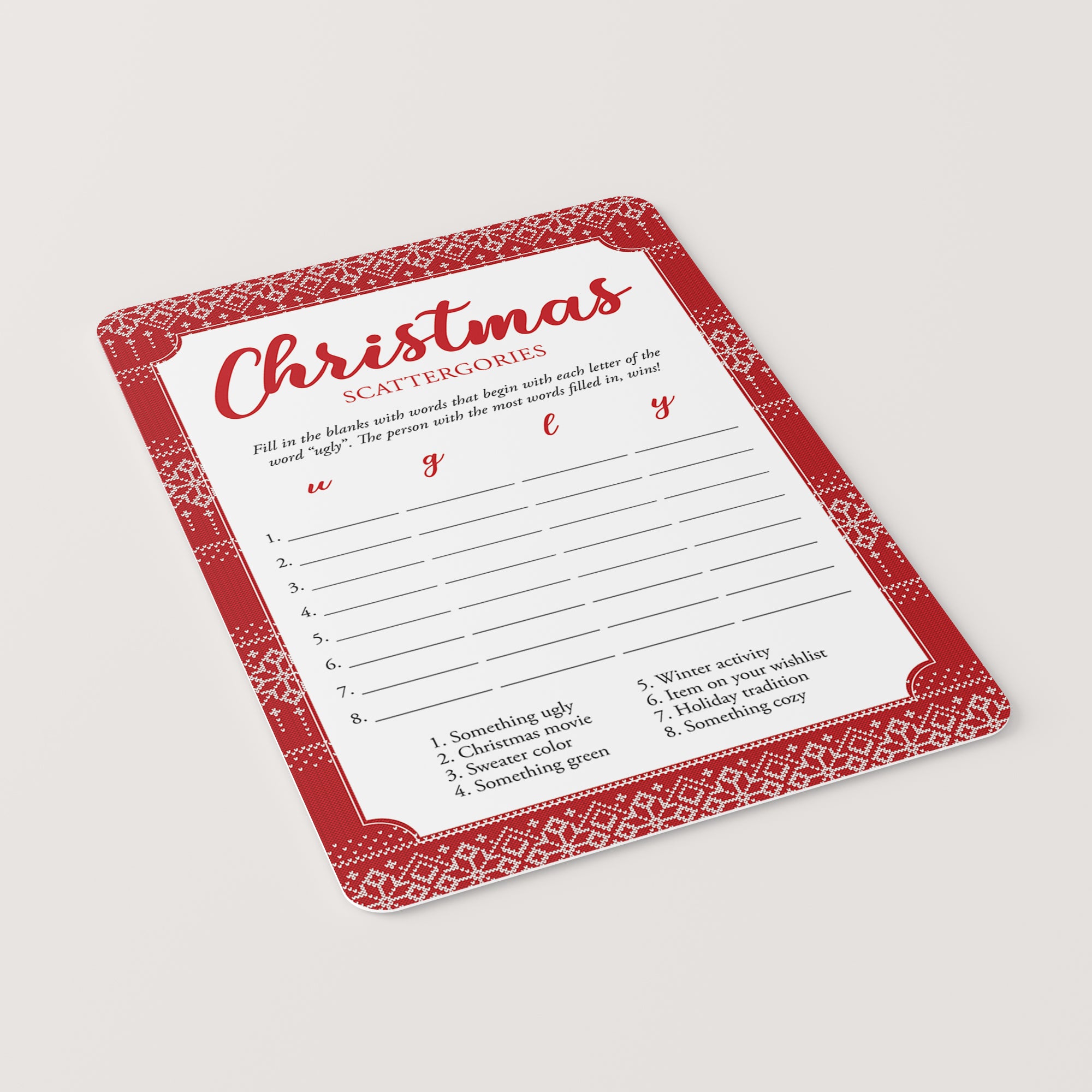 How to play the Christmas Scattergories game? Simply hand out a game sheet and a pen to your guests. They will have to come up with as many words related to the categories at the bottom of the sheet. The difficulty is that the words must begin with the letters in the word "UGLY". The person that gets the most words filled in within the set time, wins!
