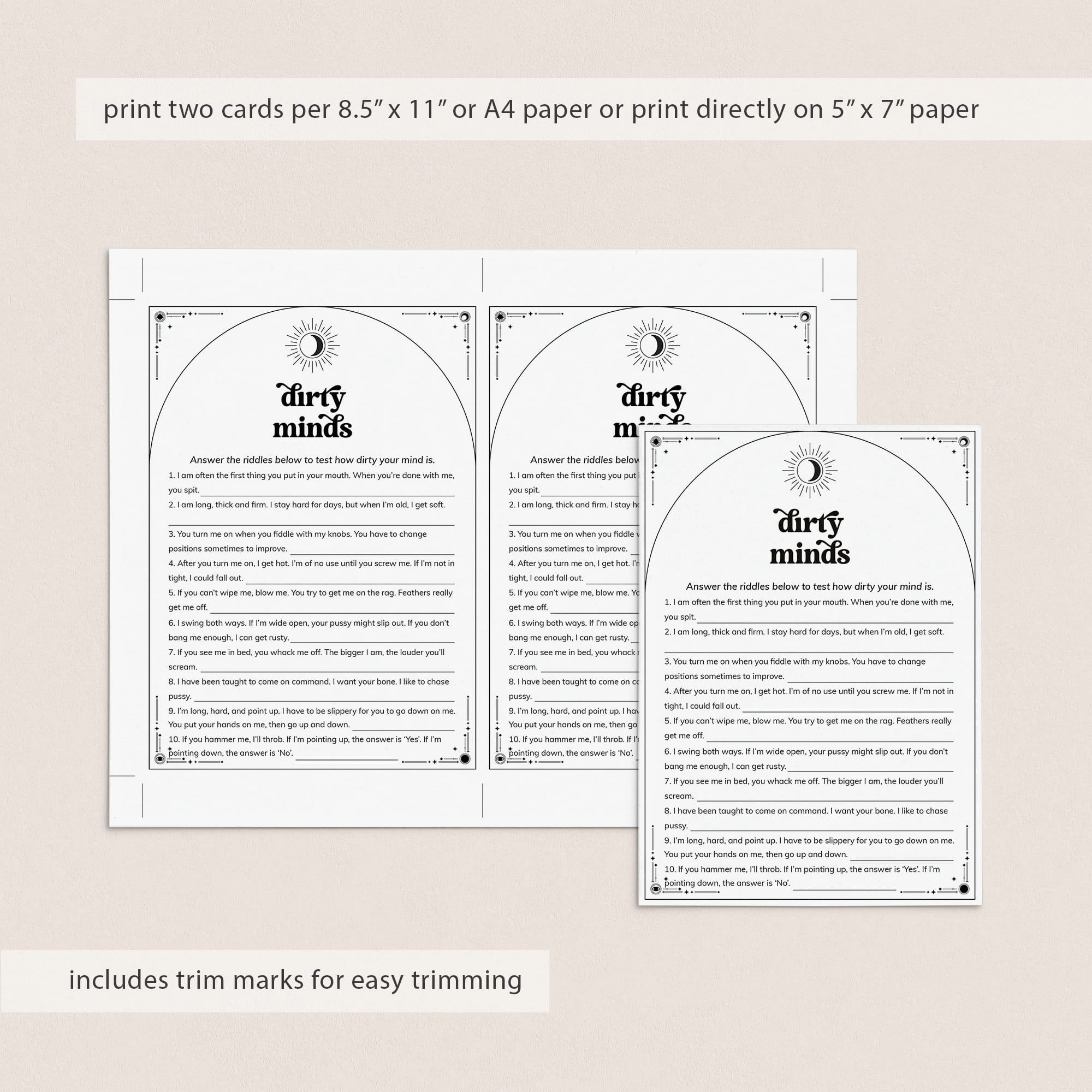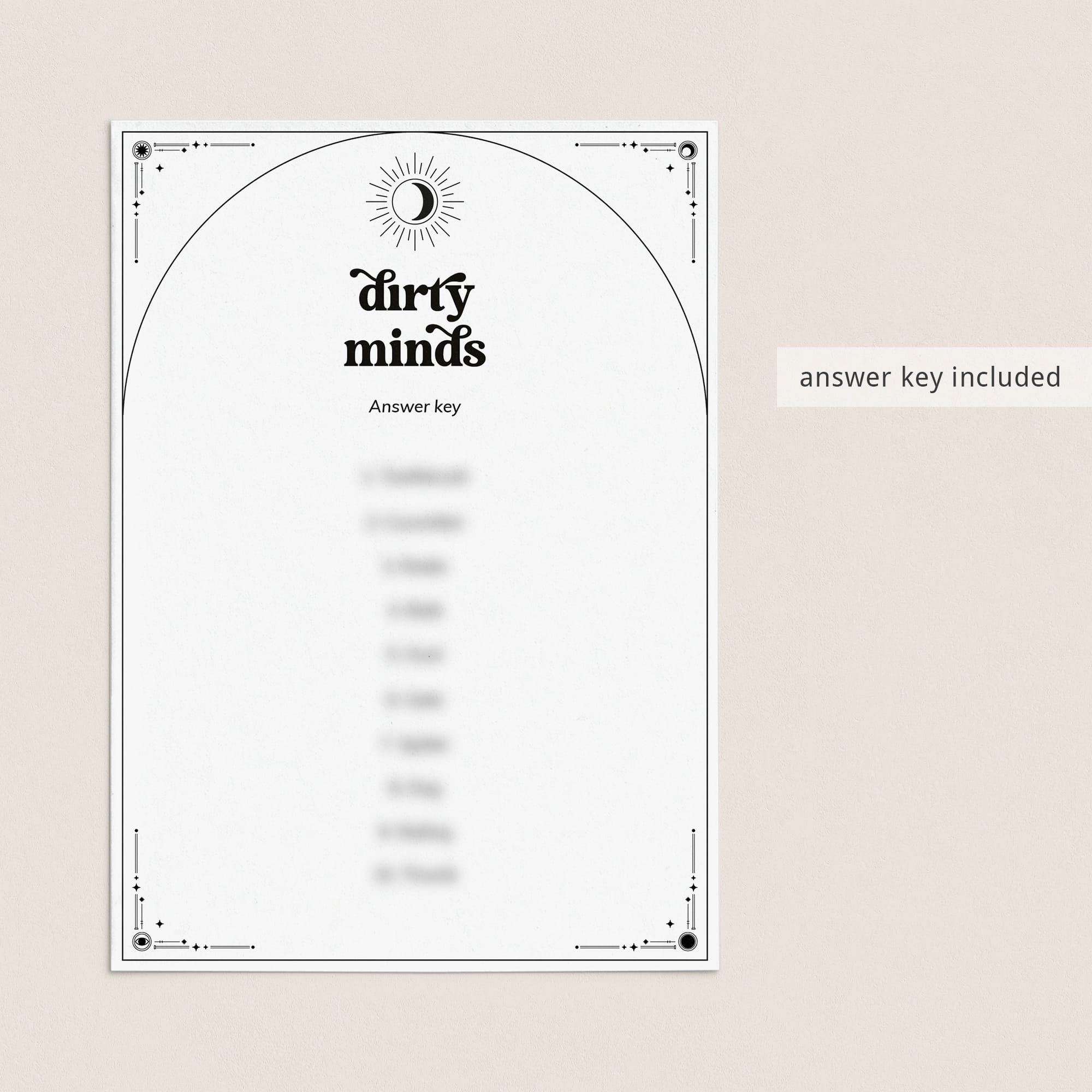 The dirtier a mind you have, the worse you will be at playing this Dirty Minds game of naughty clues. This game, with black soon, moon and stars, is the perfect game to play with your girls at your To The Moon and Bach Party, Witchy Hen Night, Celestuial Bridal Shower or Halloween Girl's Night
