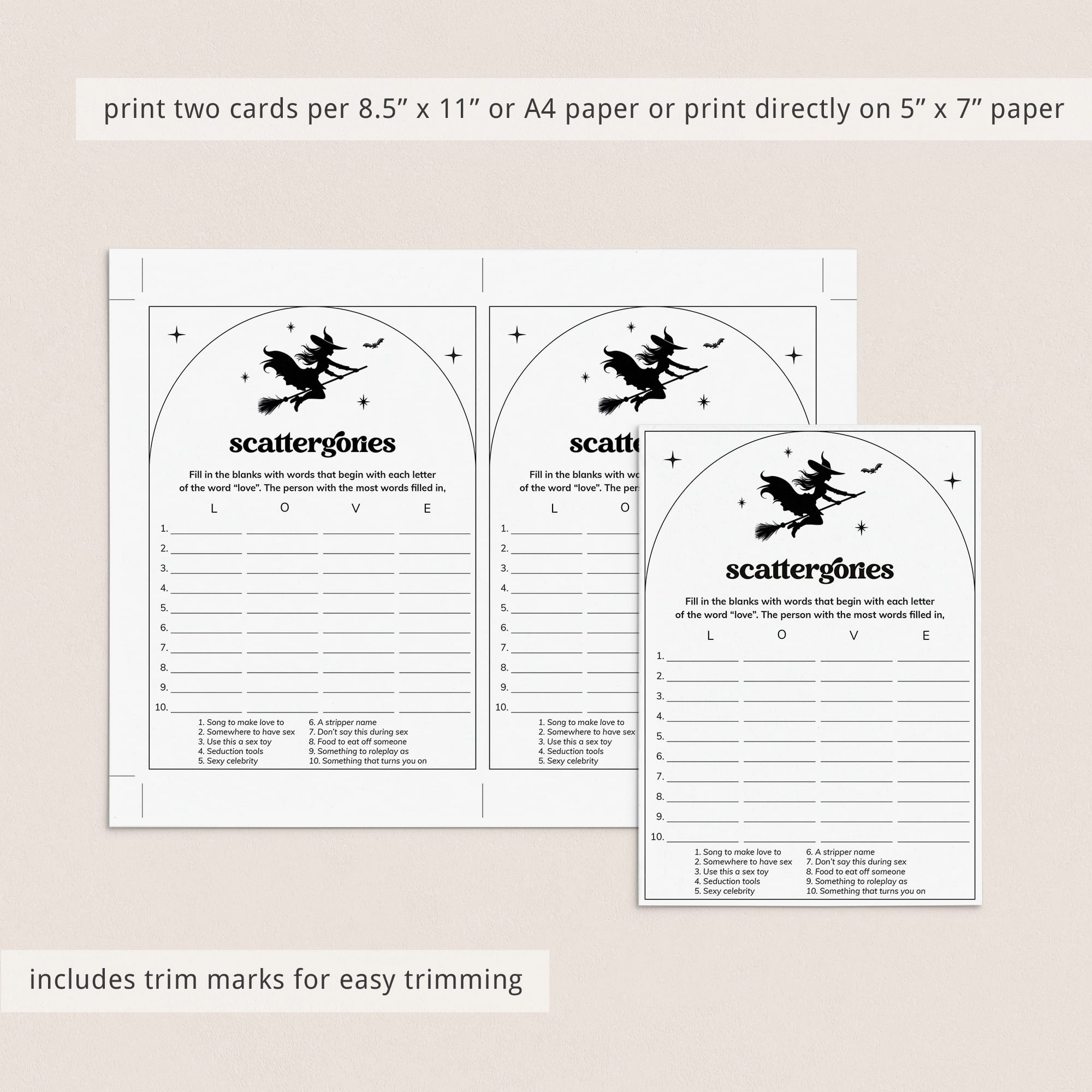 How many words can you fill in with the letters "L", "O", "V" and "E"? Play Dirty Scattergories at your Withcy bachelorette party to ensure lots of fun and laughter. This Scattergories game with black witch on a broomstick is the perfect addition to your Let's Go Witches bachelorette party, Wicked hen night or Witchy Bride bridal shower.