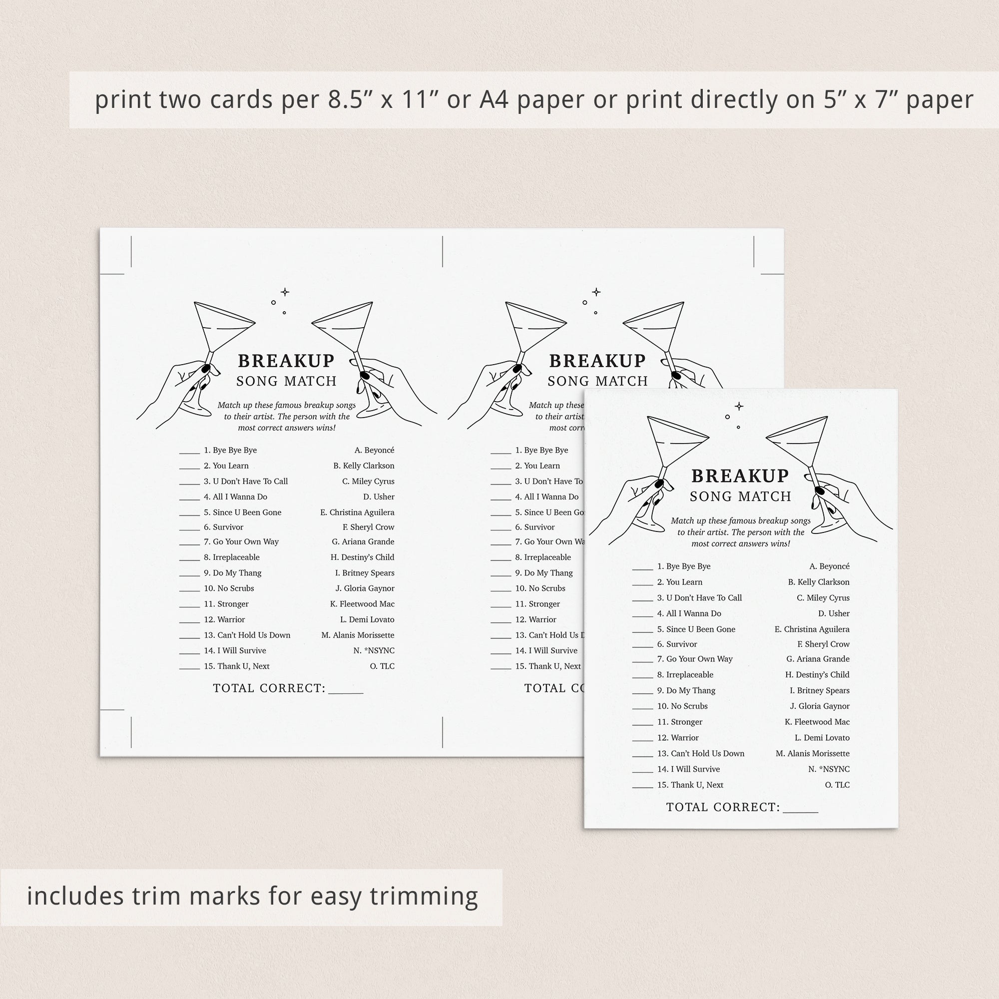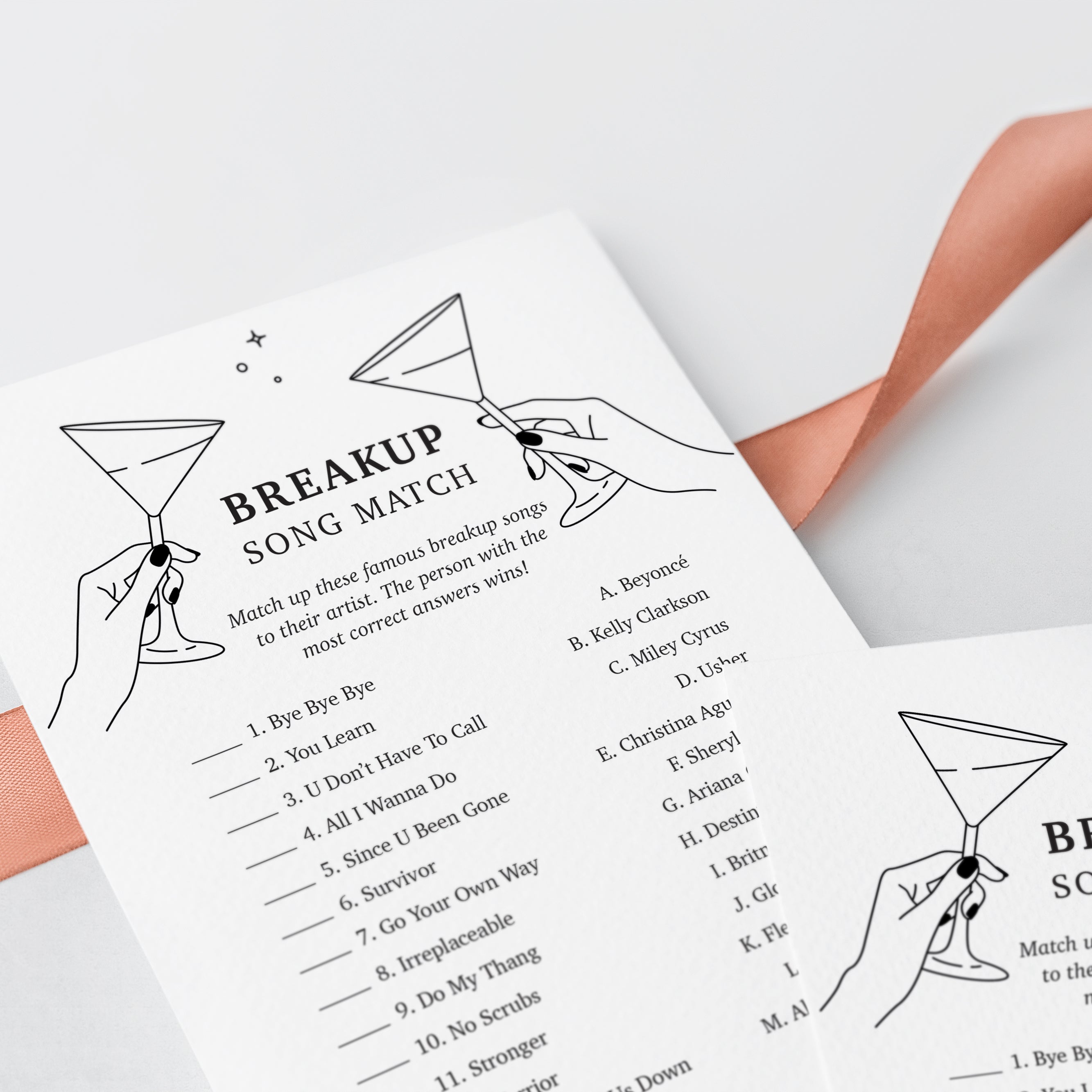 The game is very easy to play. Hand out this Match The Breakup Song game to your guests. Have them match the breakup song titles with the corresponding artist or band. The person with the most correct answers wins. An answer key is included.
