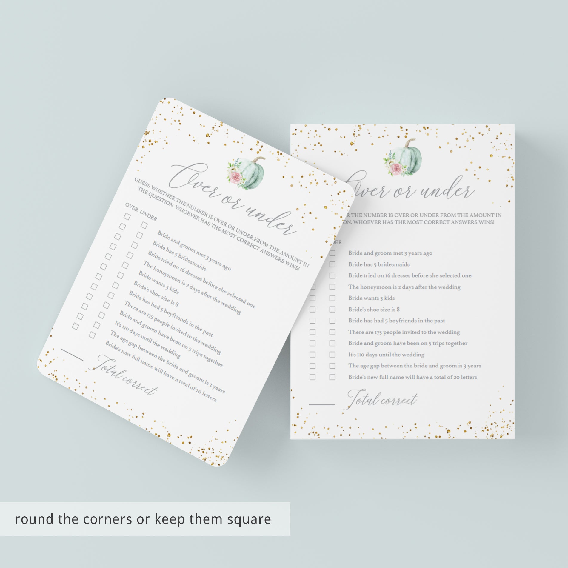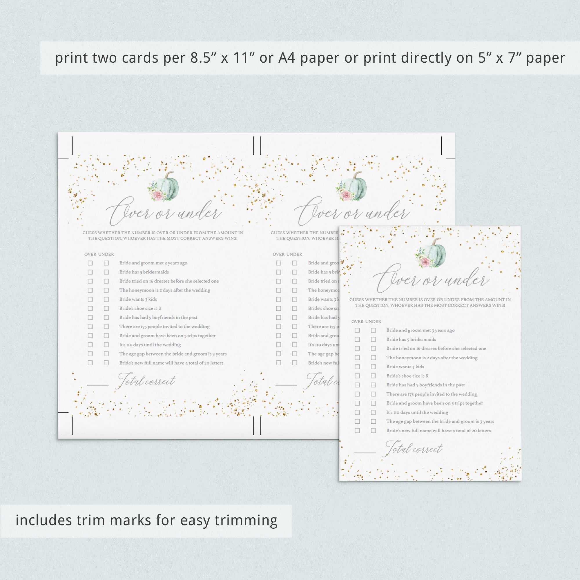 Are you good with numbers and dates? Find out with this pumpkin theme Over or Under game template with watercolor floral pumpkin. The game is perfect for a fall bridal shower or pumpkin baby shower.