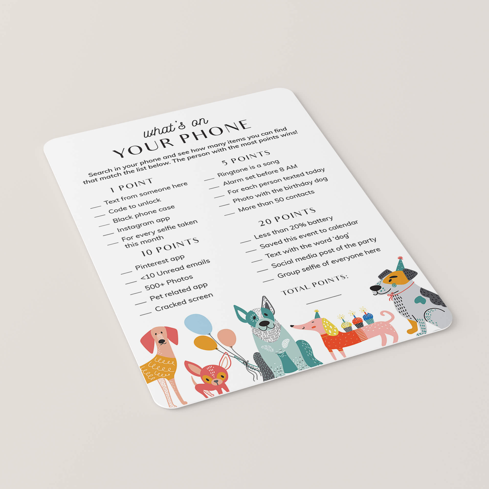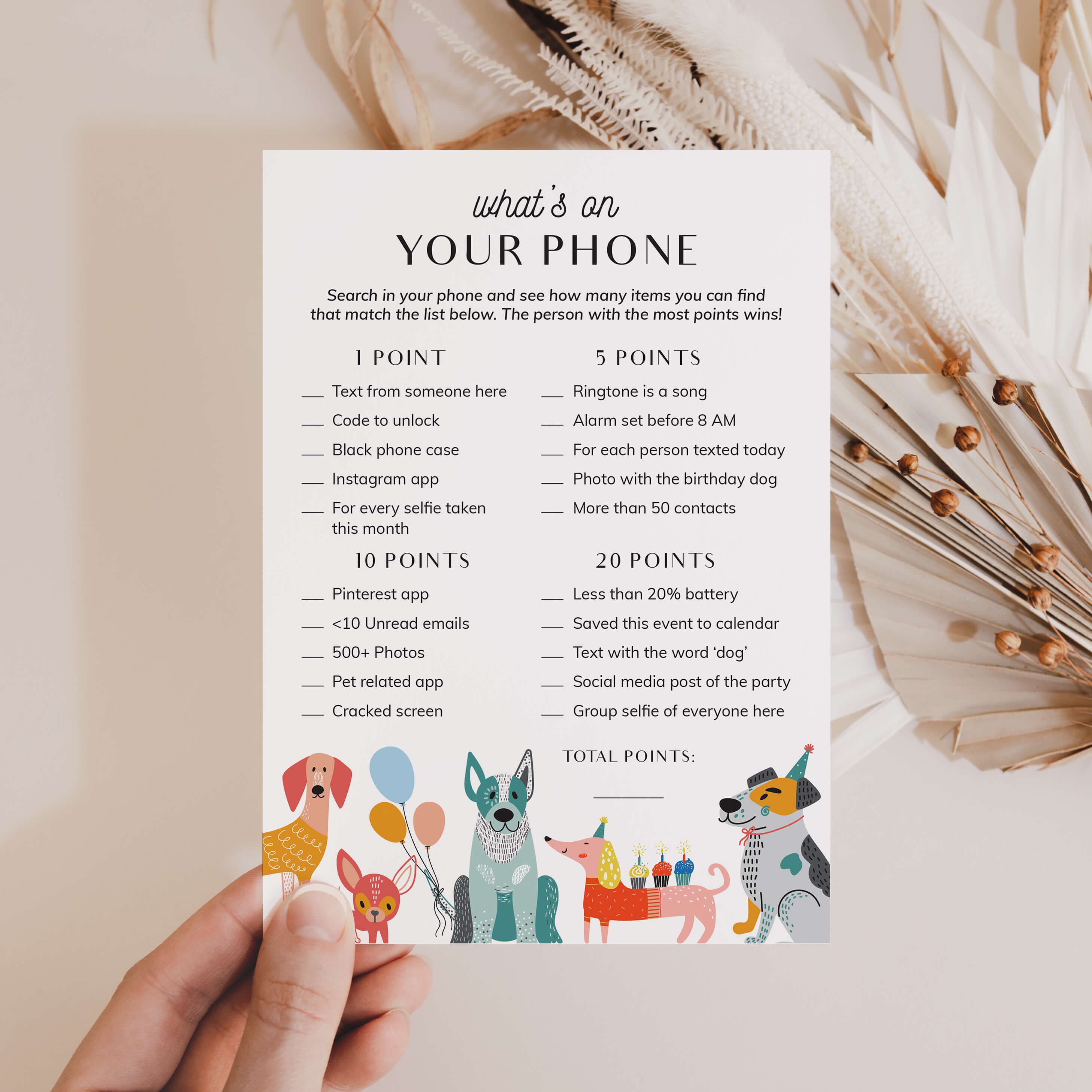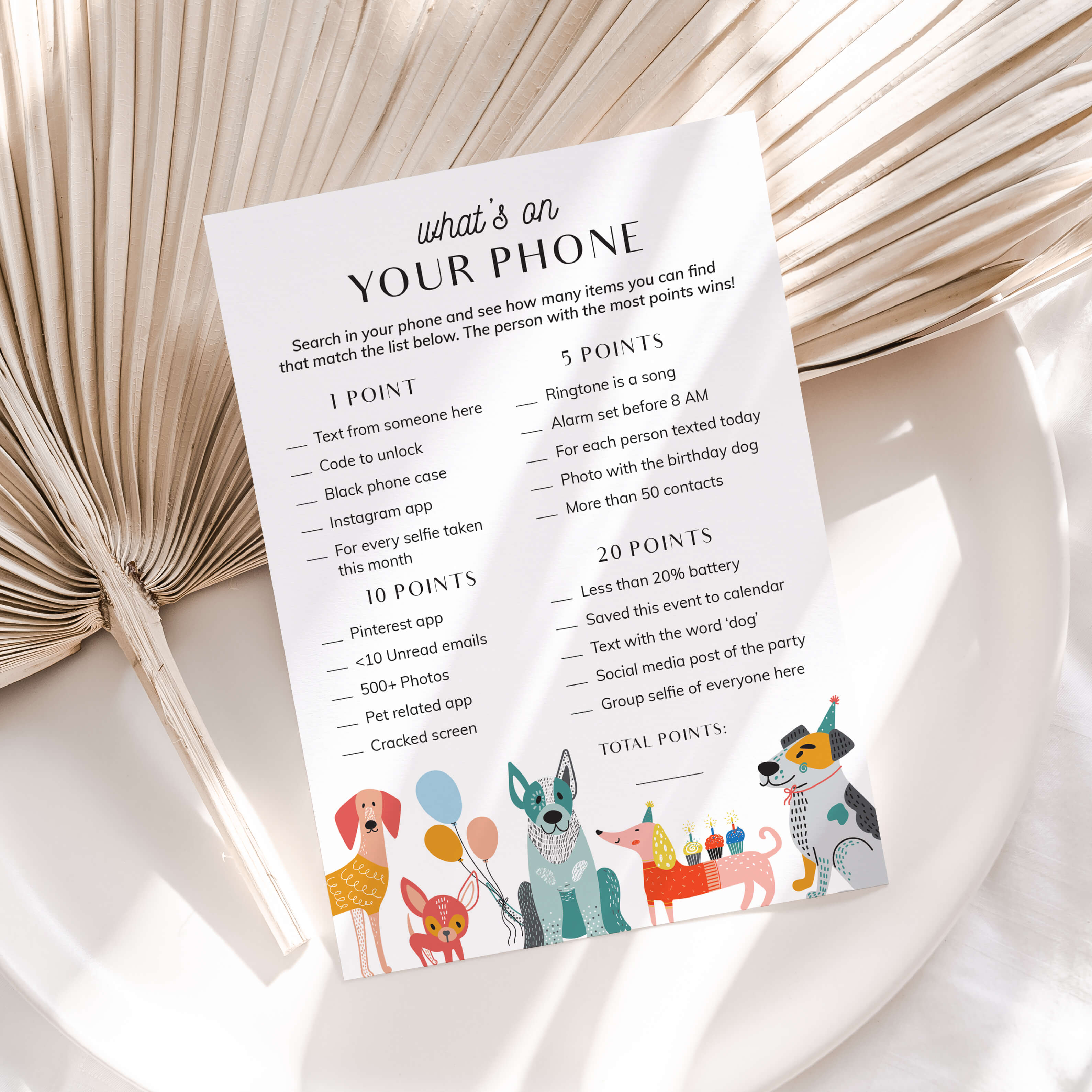 Add some fun to your dog birthday party with this cute dog birthday What’s On Your Phone game. It is the perfect icebreaker game, super easy to prepare for AND simple to play. All guests need to play is a smartphone, one of these Whats On Your Phone game cards and a pen. It's the perfect addition to any dog's birthday party.