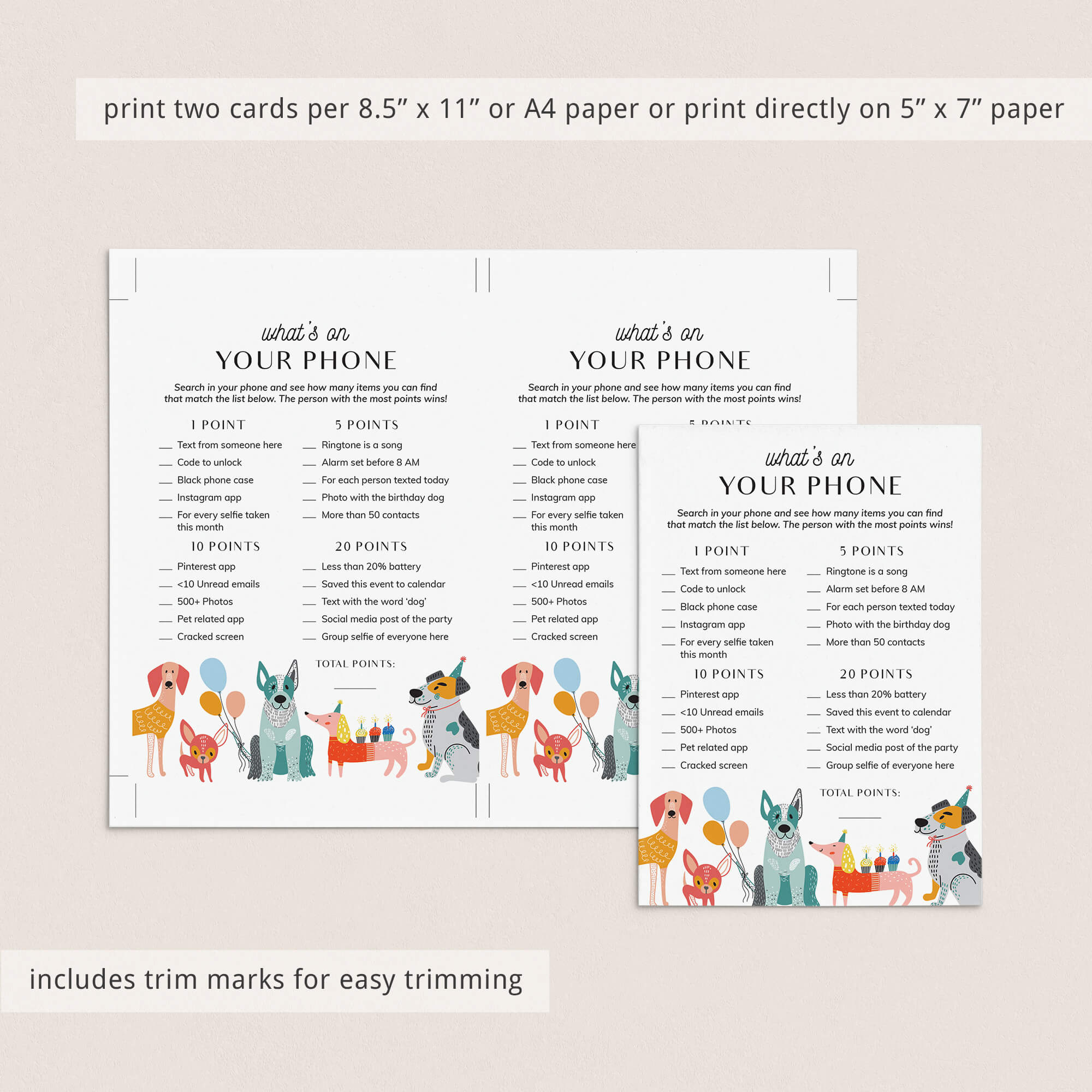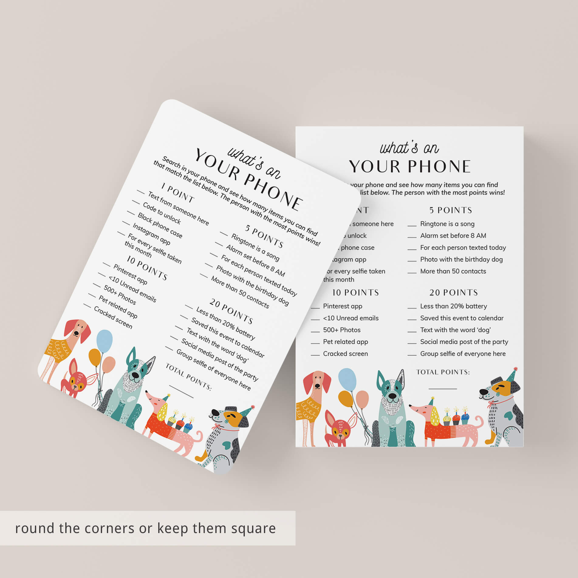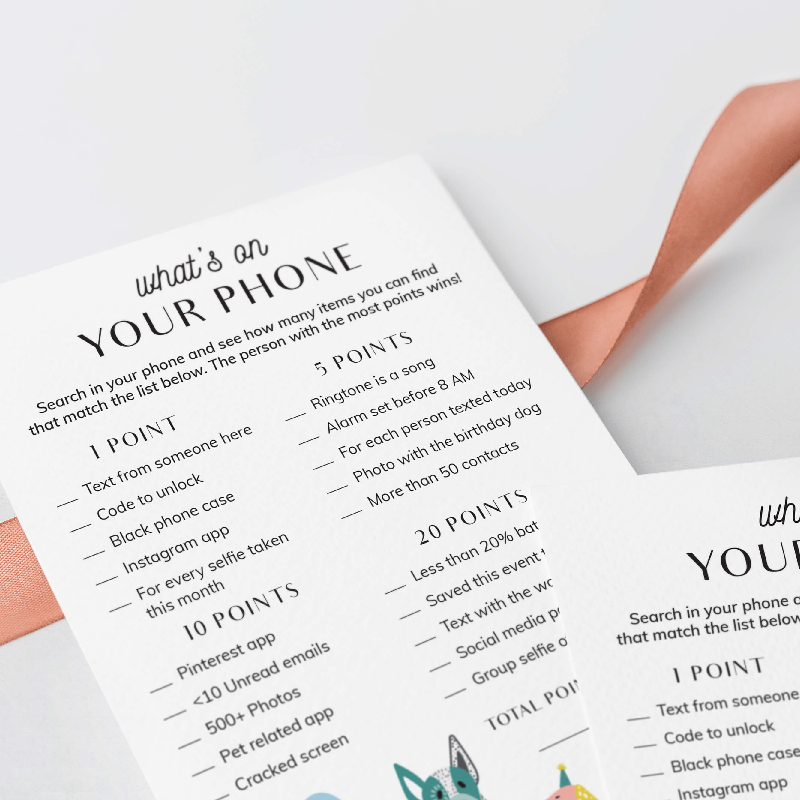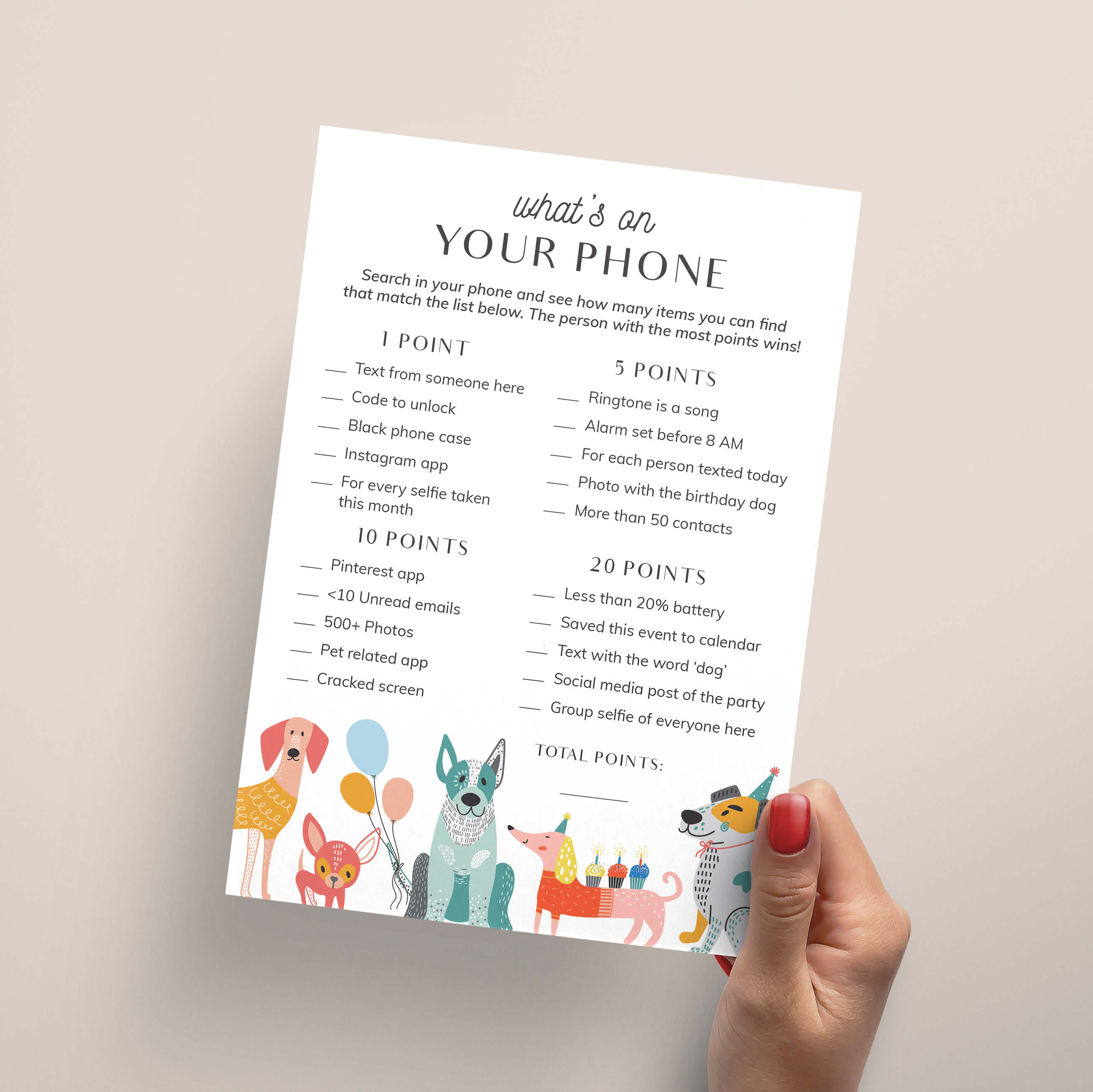 Add some fun to your dog birthday party with this cute dog birthday What’s On Your Phone game. It is the perfect icebreaker game, super easy to prepare for AND simple to play. All guests need to play is a smartphone, one of these Whats On Your Phone game cards and a pen. It's the perfect addition to any dog's birthday party.