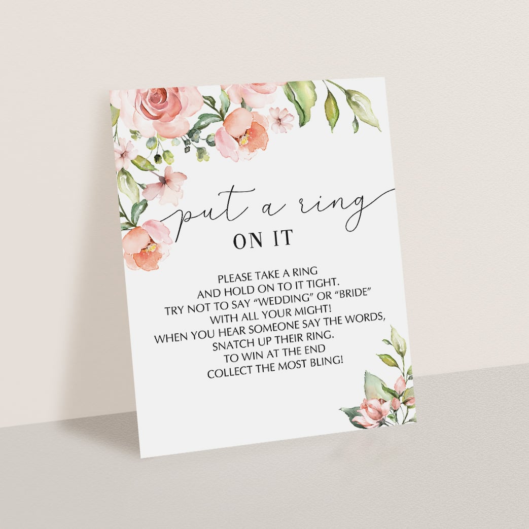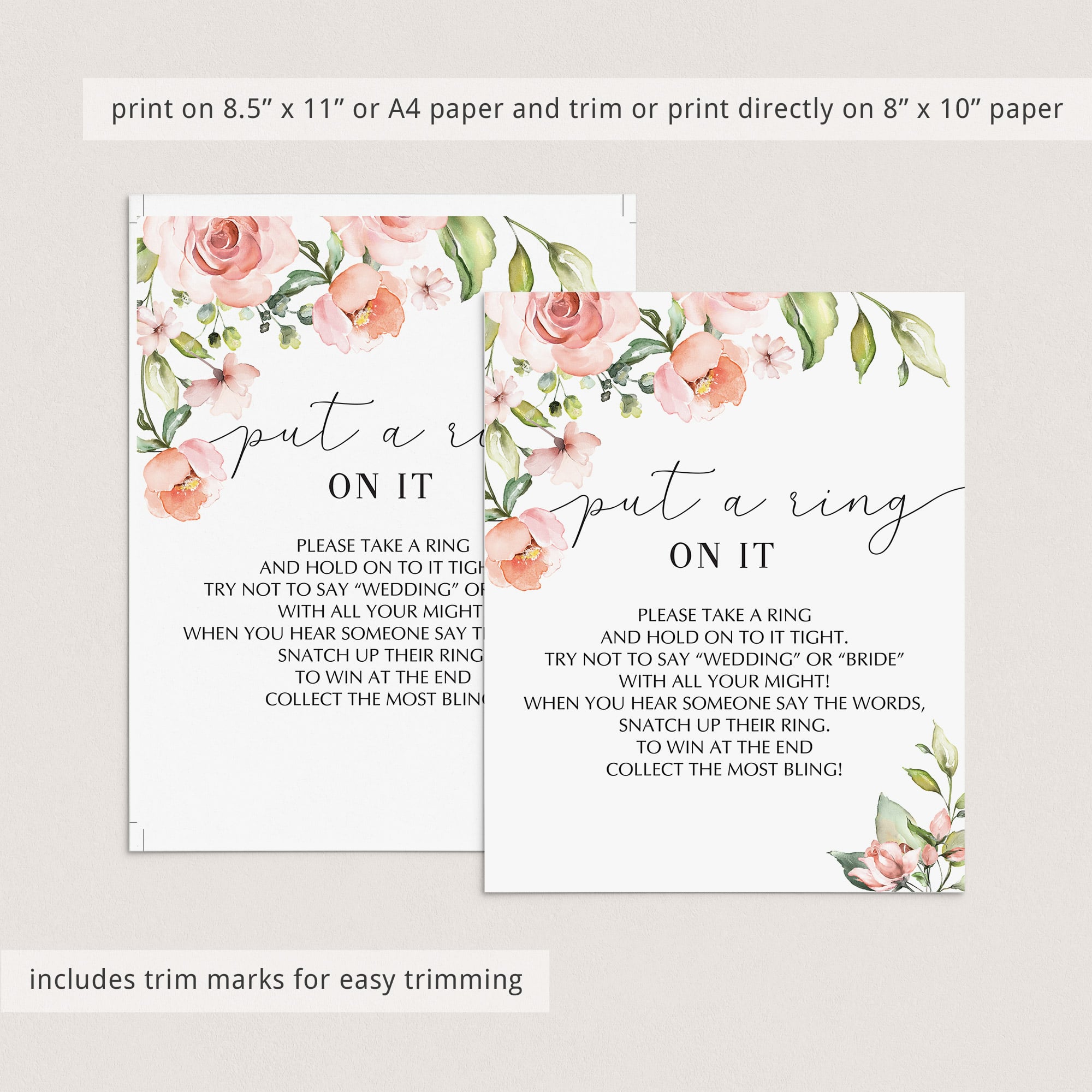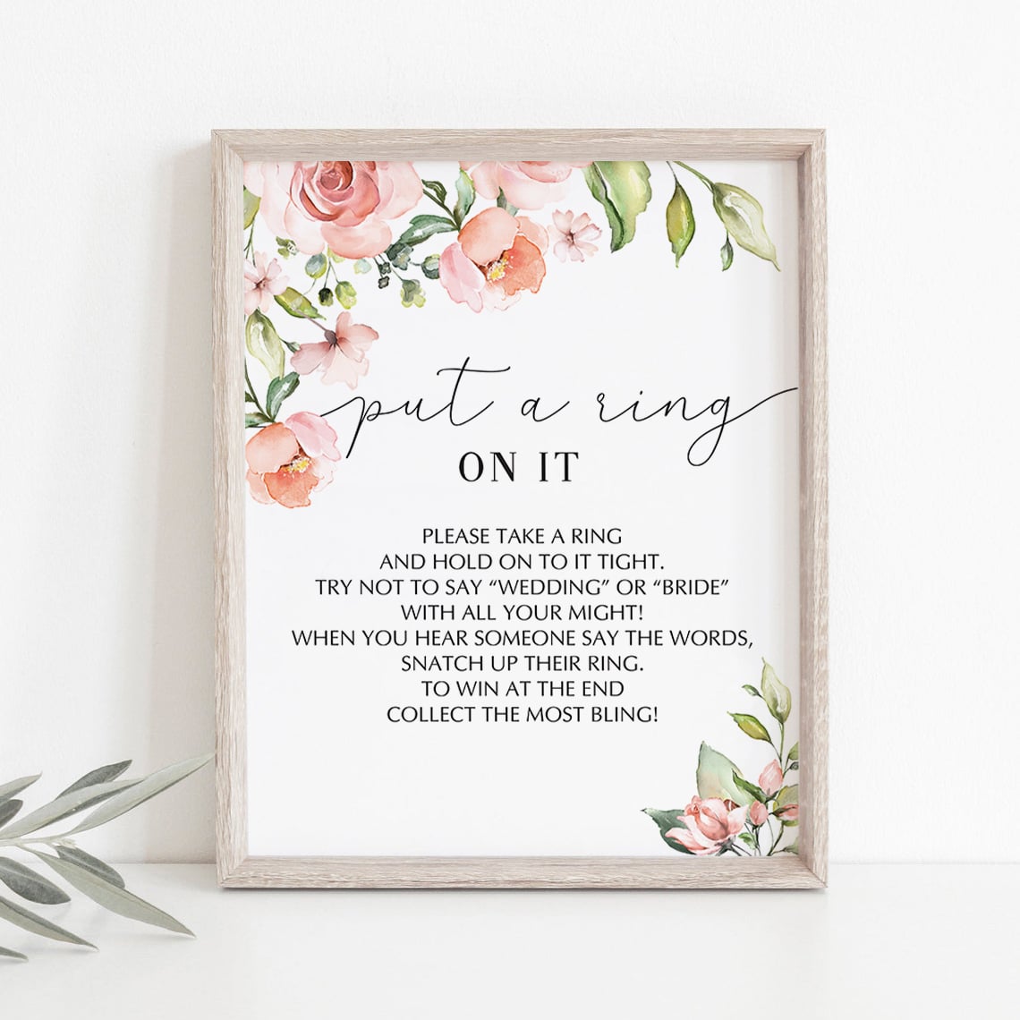 Use this beautiful floral themed sign to instruct your guests to take a ring the moment they walk in the door. Let each guest hold onto ring and tell them that they aren’t allowed to say the word “Bride” or "Wedding".