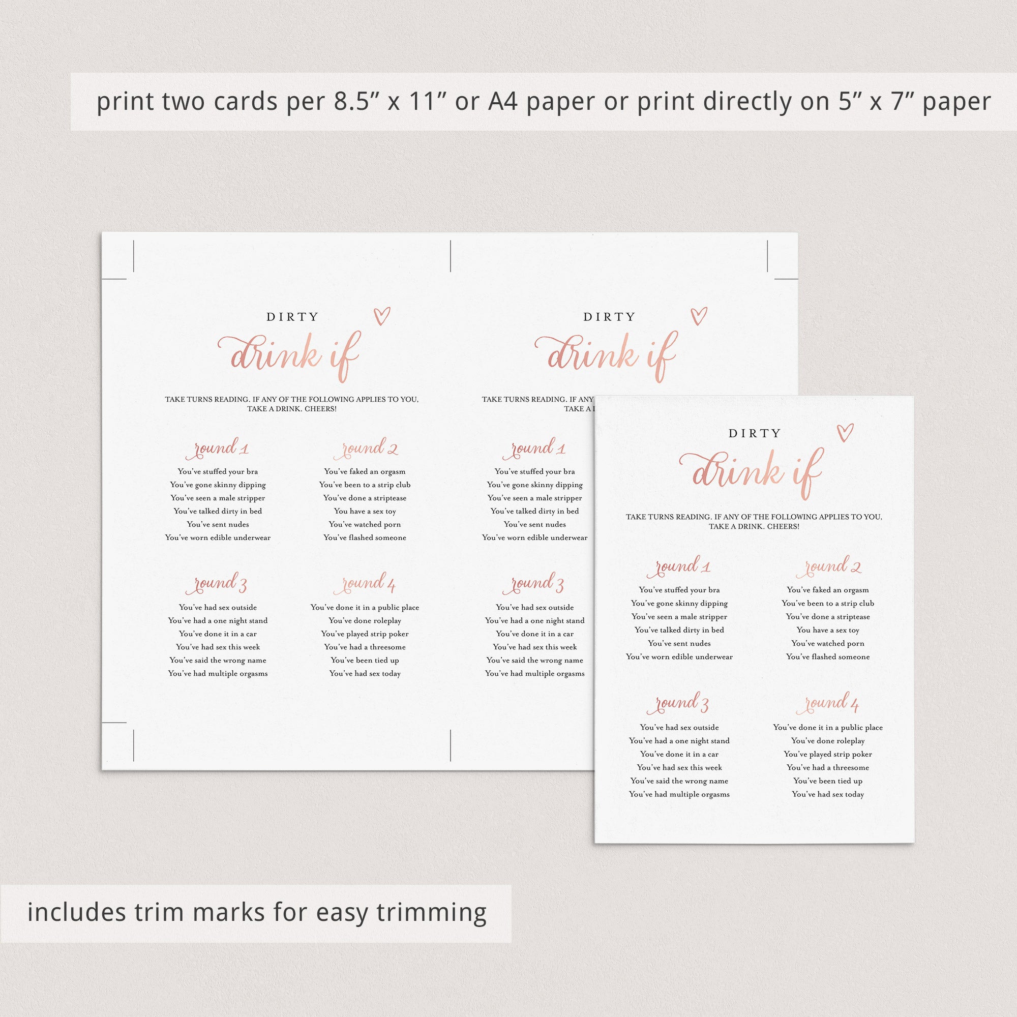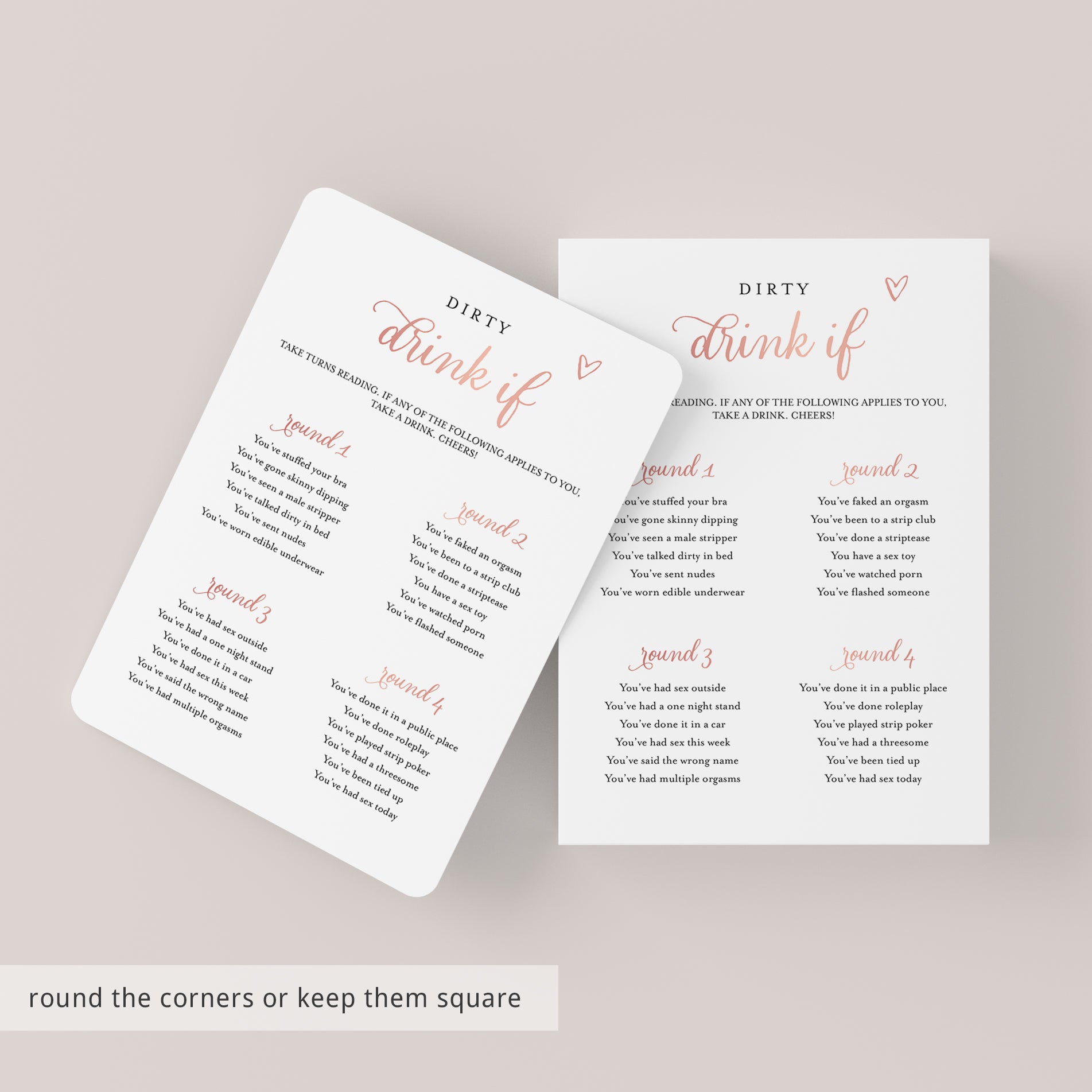 Ensure a wild party with this rose gold bachelorette Drink If Game! Print the games, bring to your event, pour drinks all around and get ready to bare all to your friends as you run through the rounds.