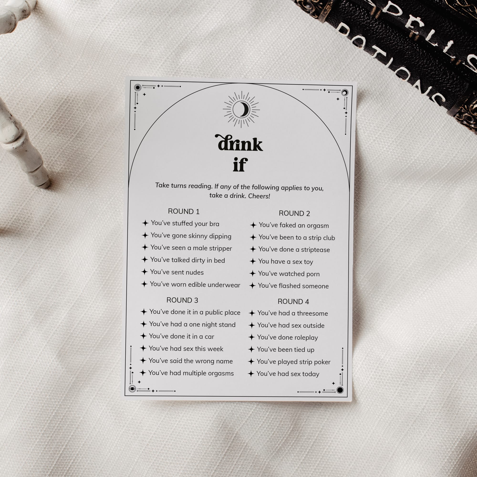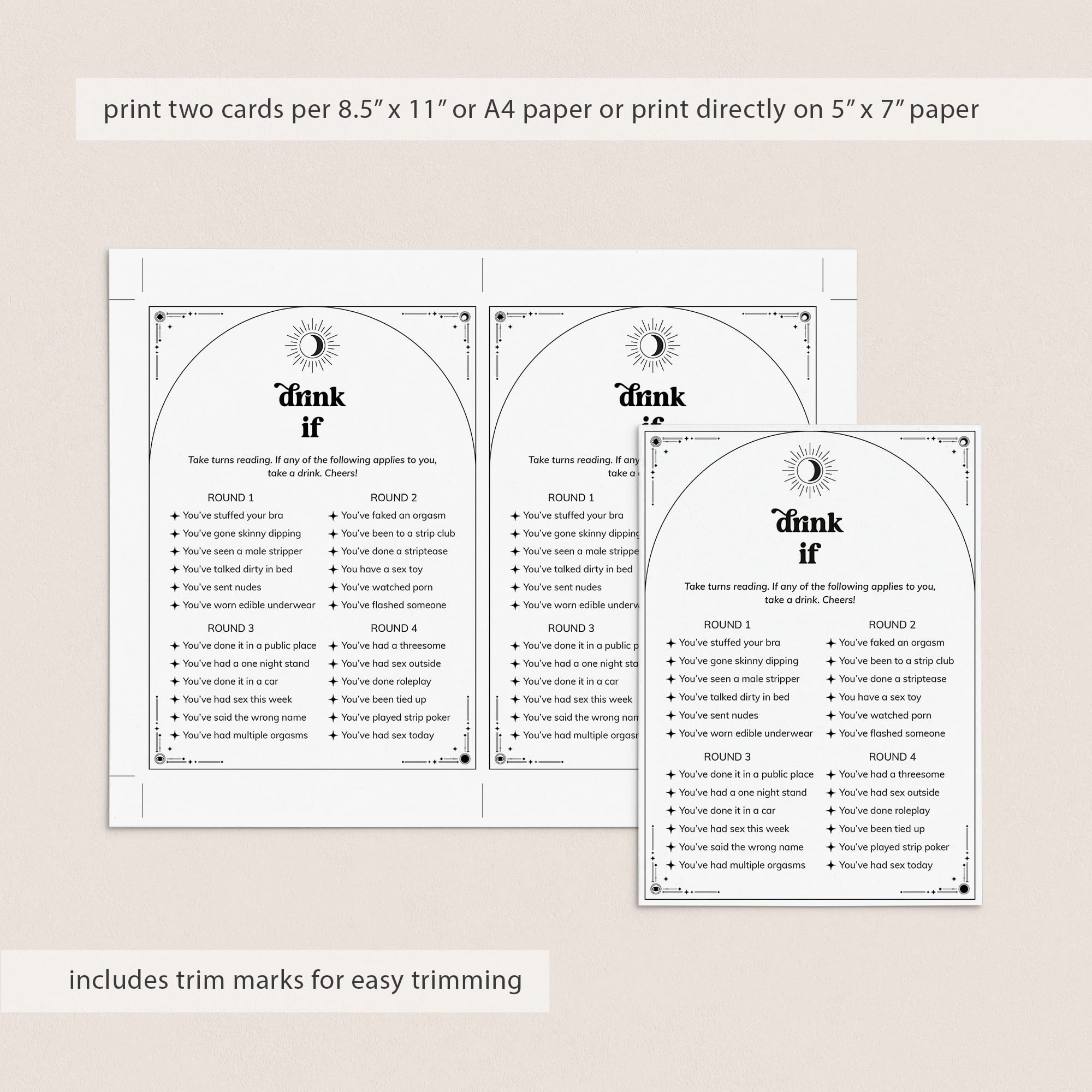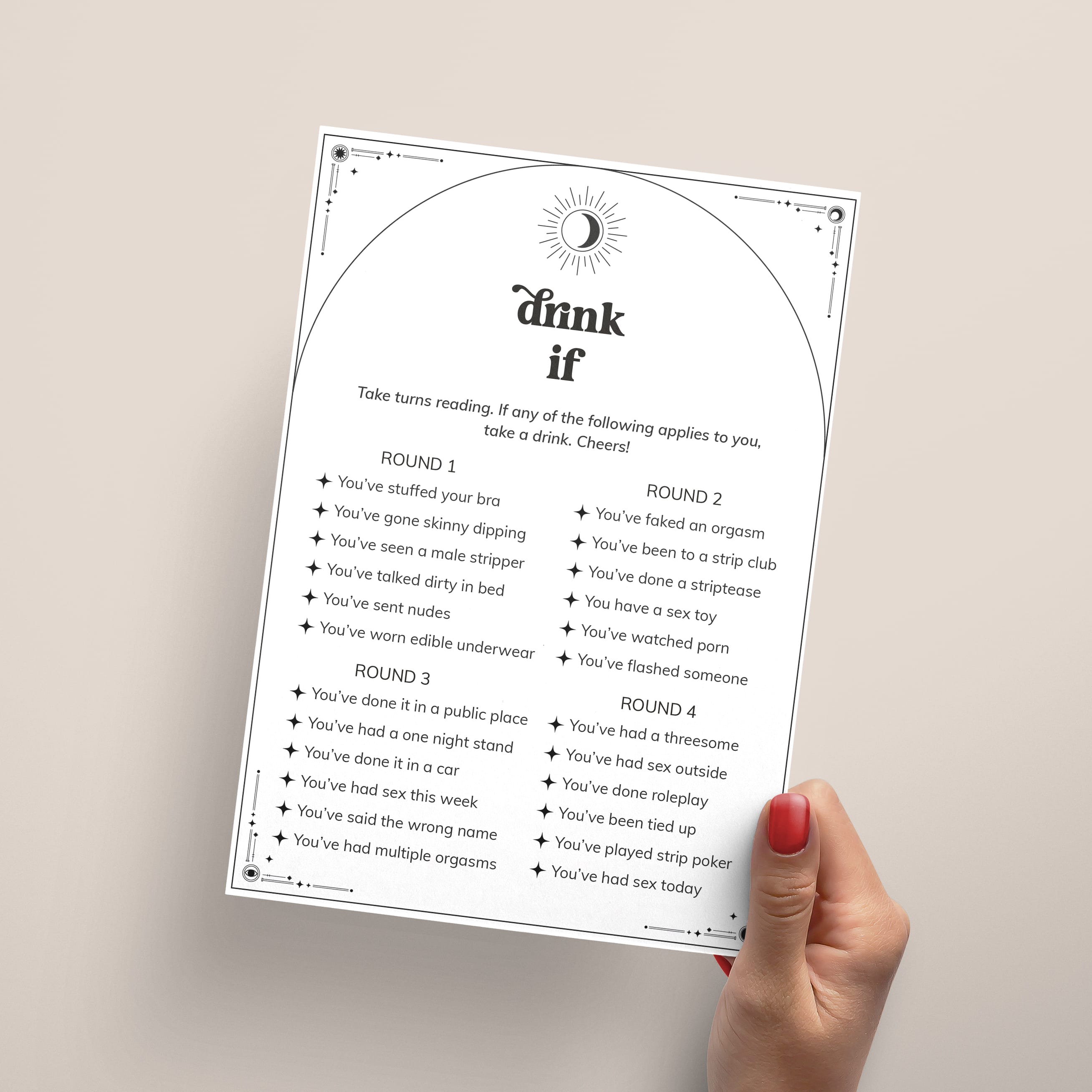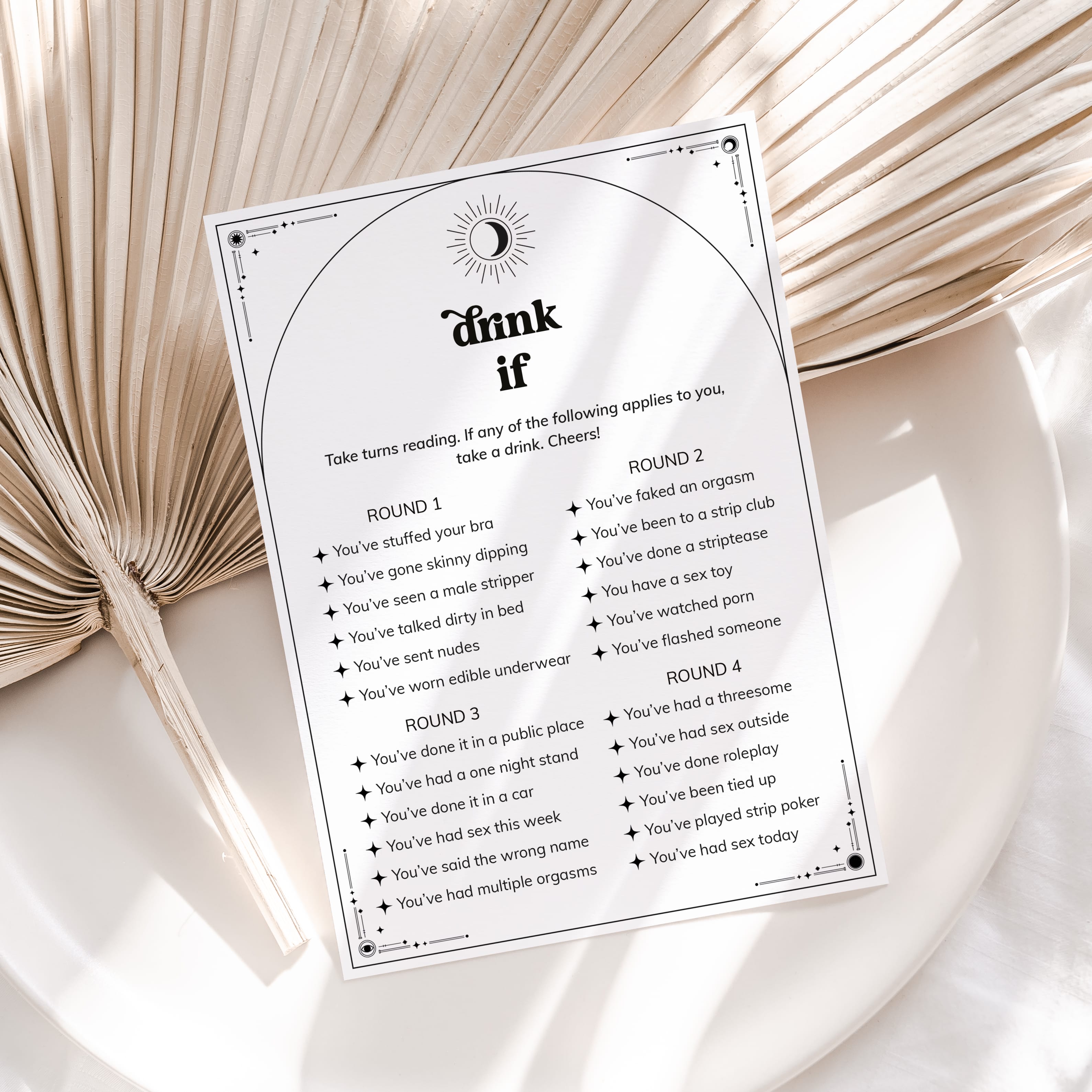 Ensure a wild weekend with this Boho Celestial Bachelorette Drink If Game! Print the game, bring to your event, pour drinks all around and get ready to bare all to your friends as you run through the rounds.