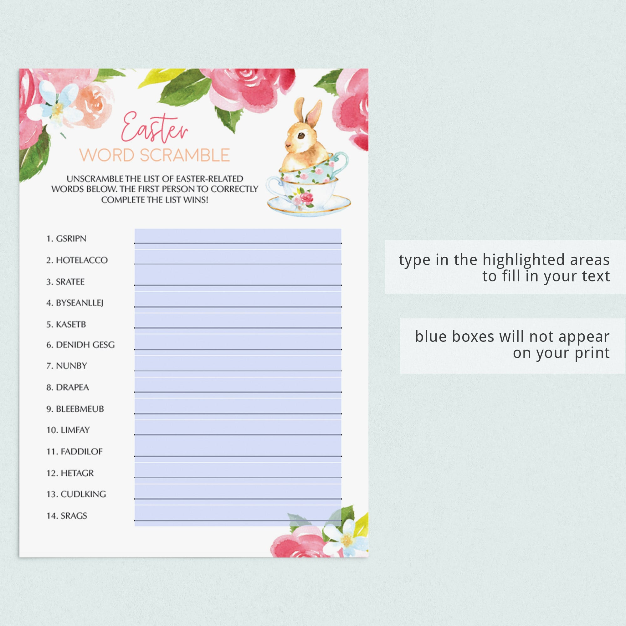 Printable and electronically fillable files are included, so that you can play this Easter word scramble game in-person or over a video conference app like Zoom, Skype or Teams.