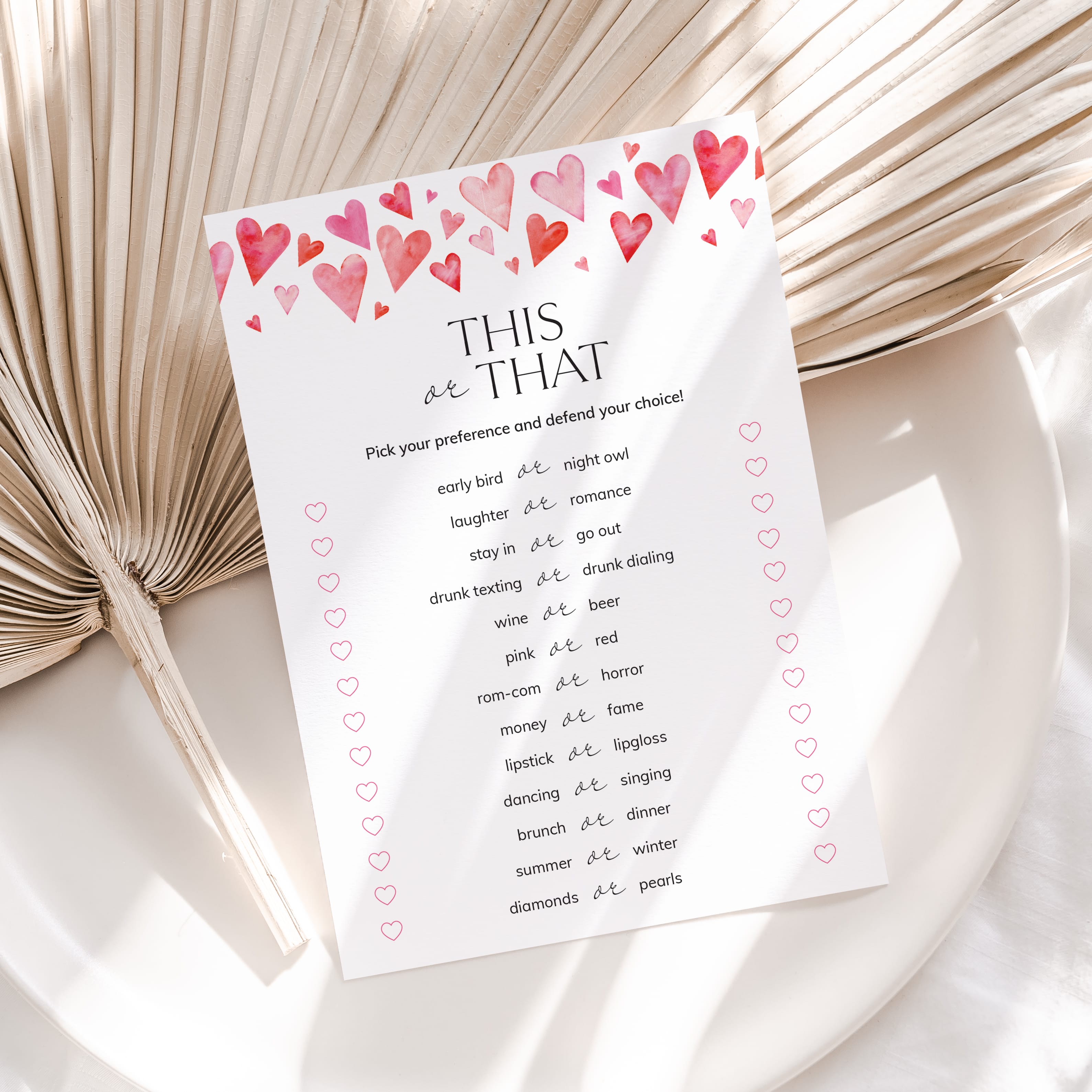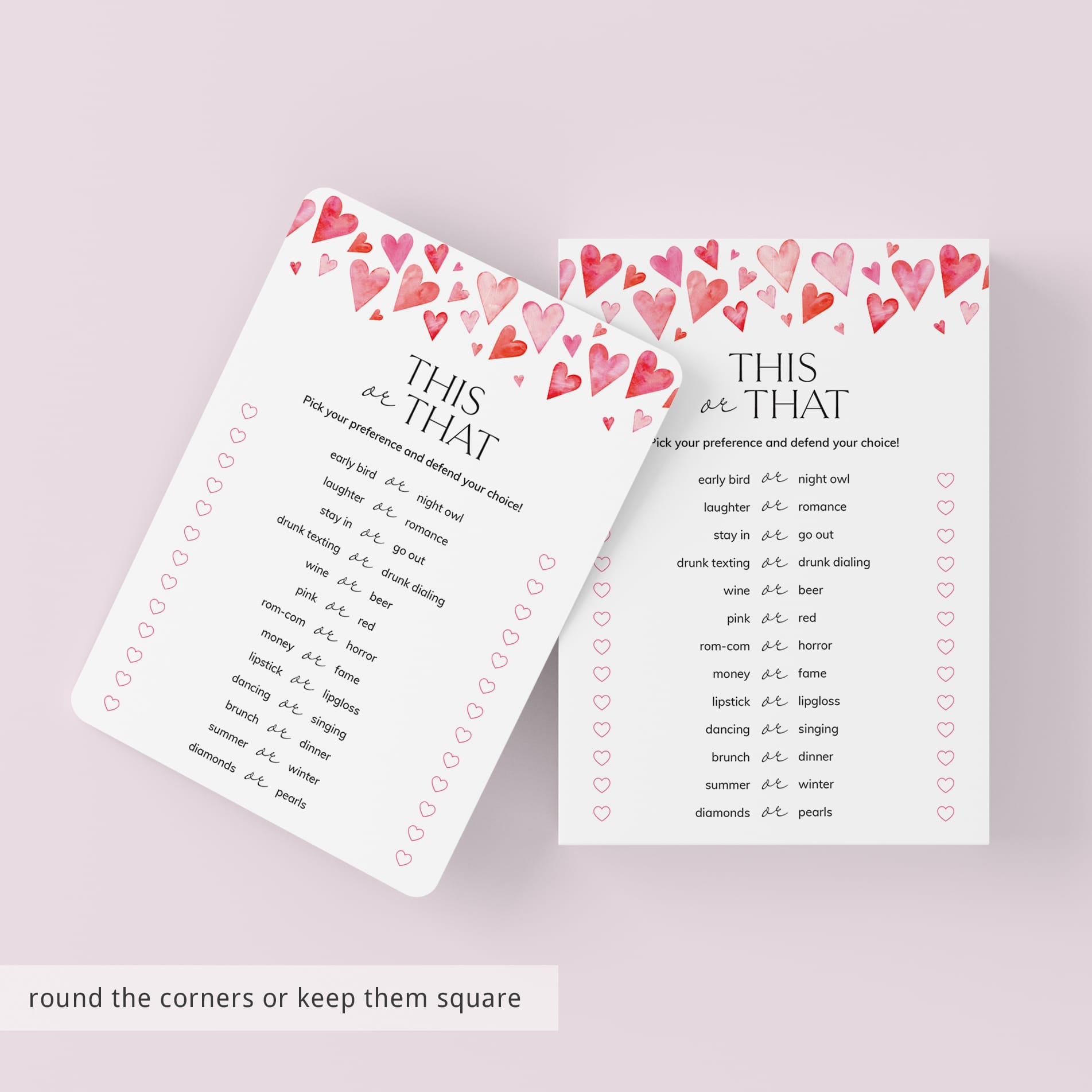Are you looking for a fun and easy icebreaker game for your Galentines party? Play This or That. It's is a great conversation starter for your party. This cute Galentine's Day game with watercolor hearts has 13 This or That questions. Have all the girls pick their preferences and defend their choice.