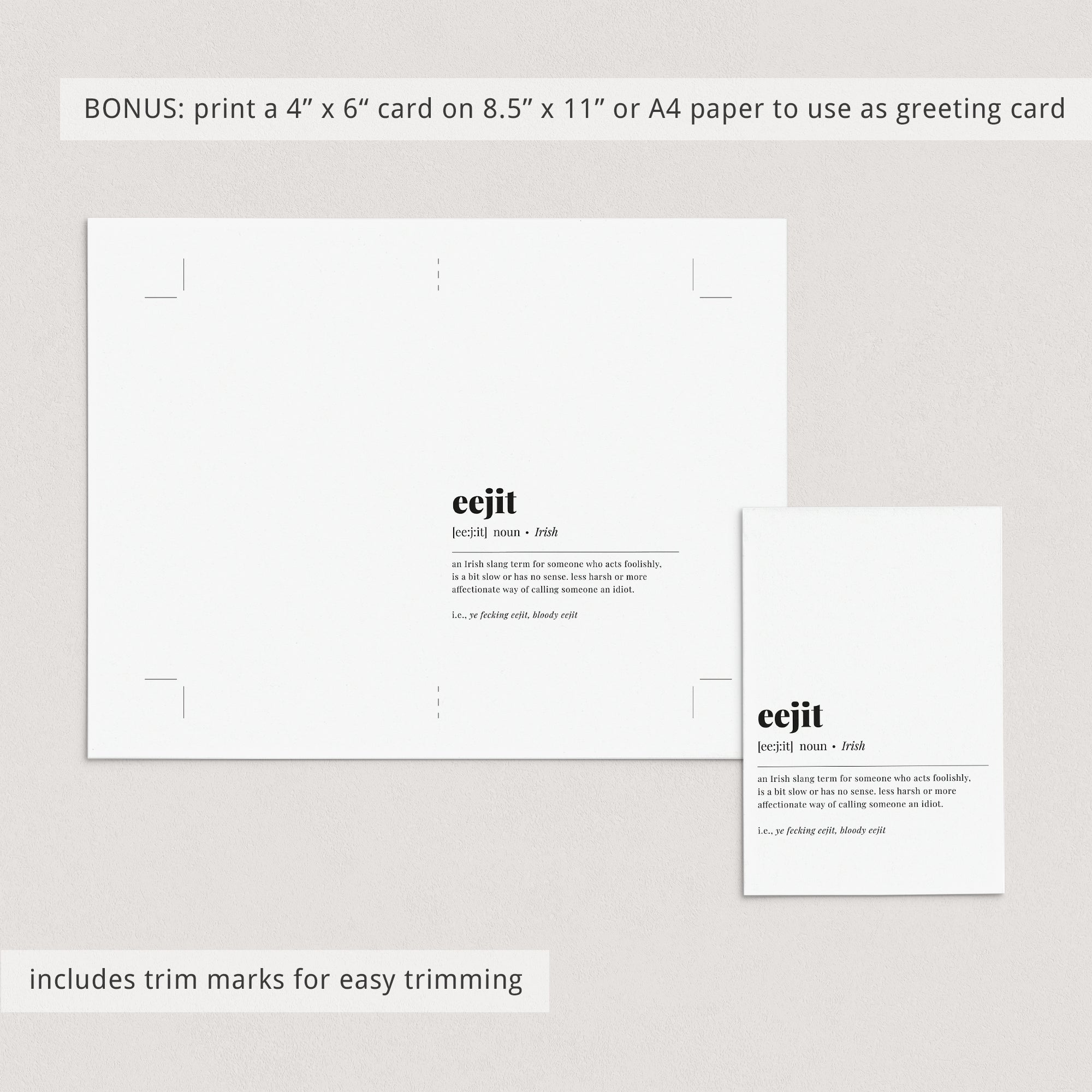 This dictionary-style meaning of 'eejit' printable is an instant download. After purchase you will receive a download link immediately on screen. Also within minutes of your order and payment, an e-mail will be sent to you with a link for your download.
