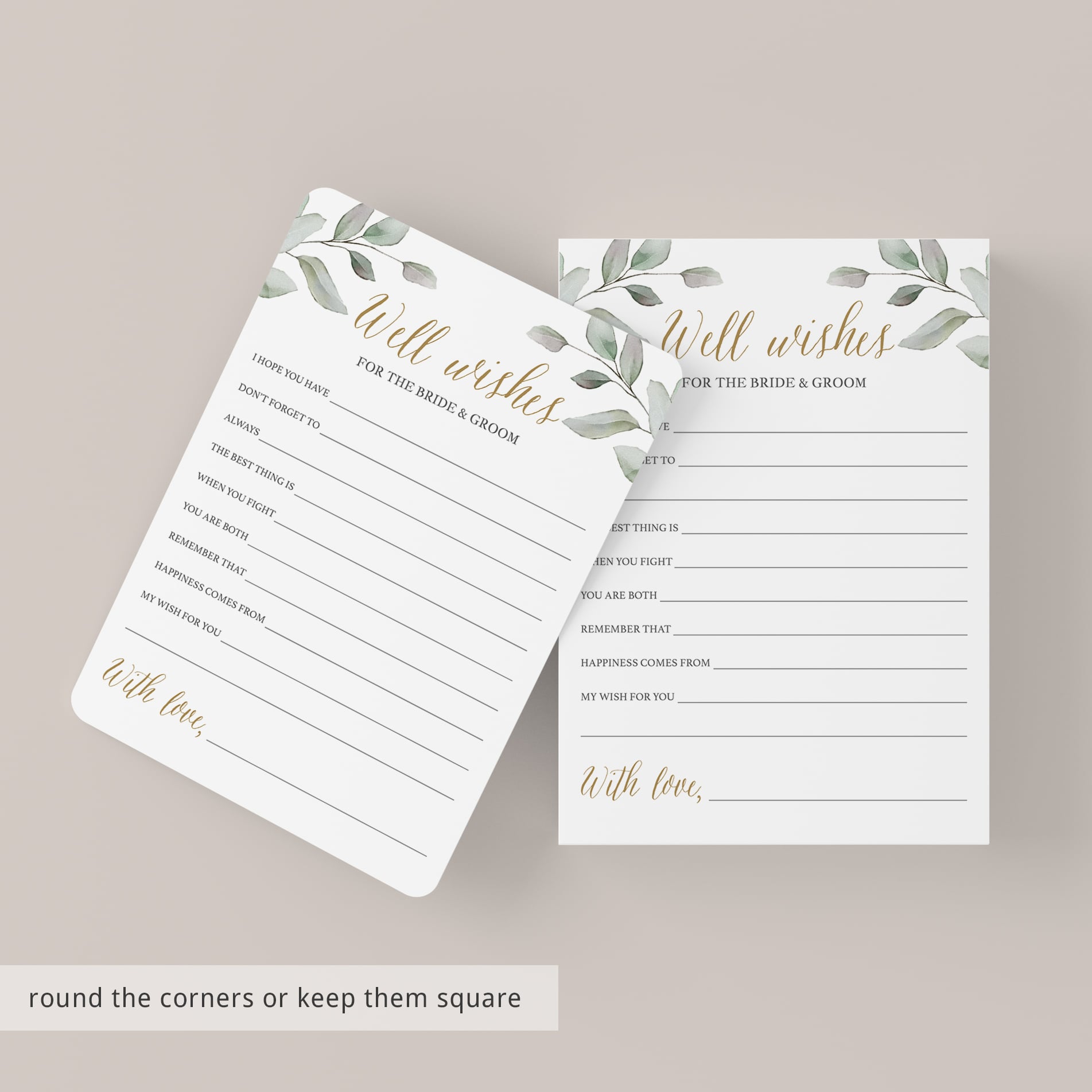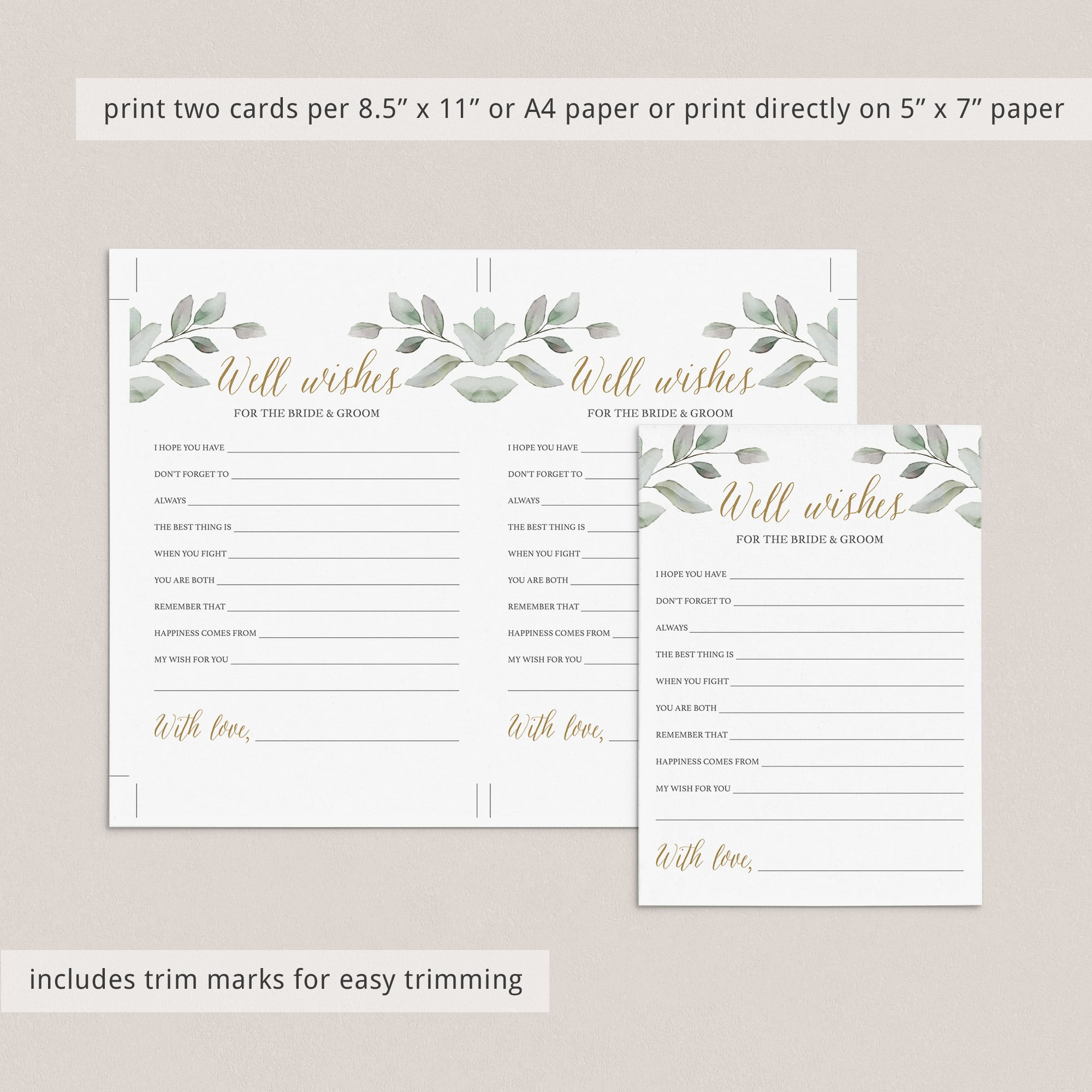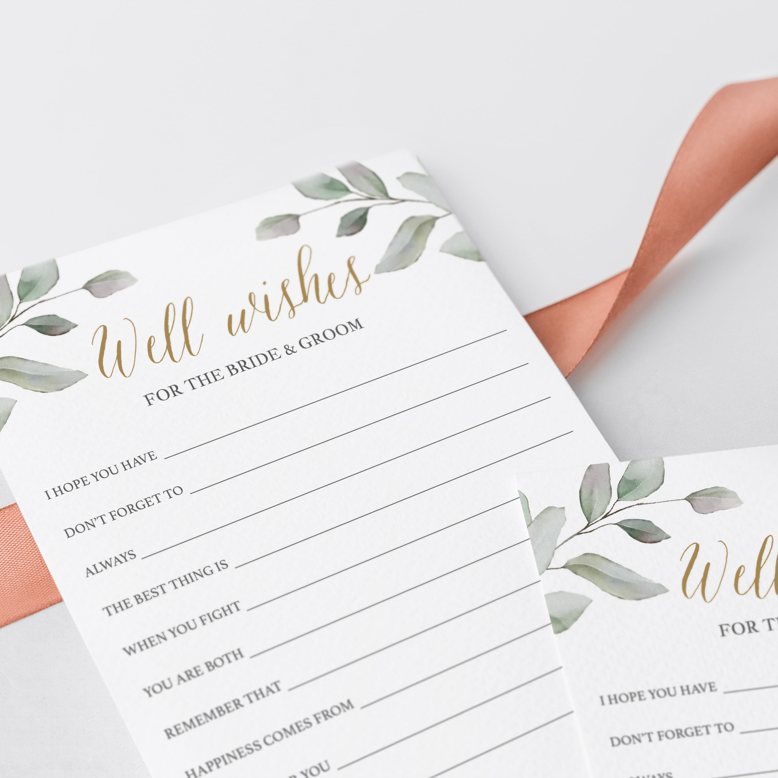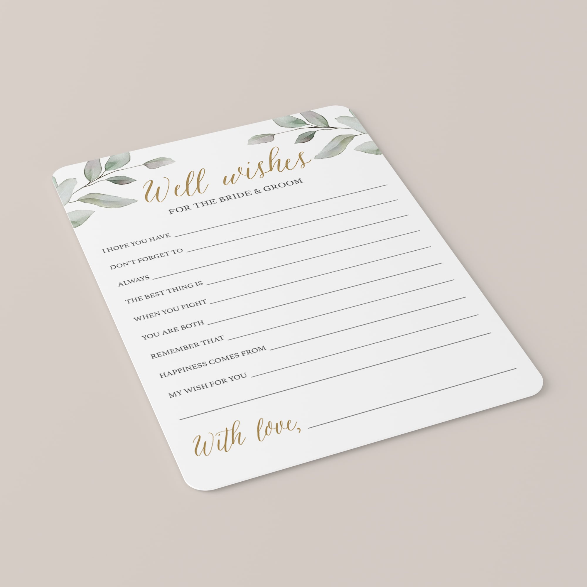 Create an amazing keepsake for the bride and groom with this elegant wedding Well Wishes and Advice card. The greenery and gold card is the perfect addition to a greenery themed wedding or bridal shower. Let every guest write down their well wishes and advice for the soon-to-be-weds and collect the cards for the happy couple.