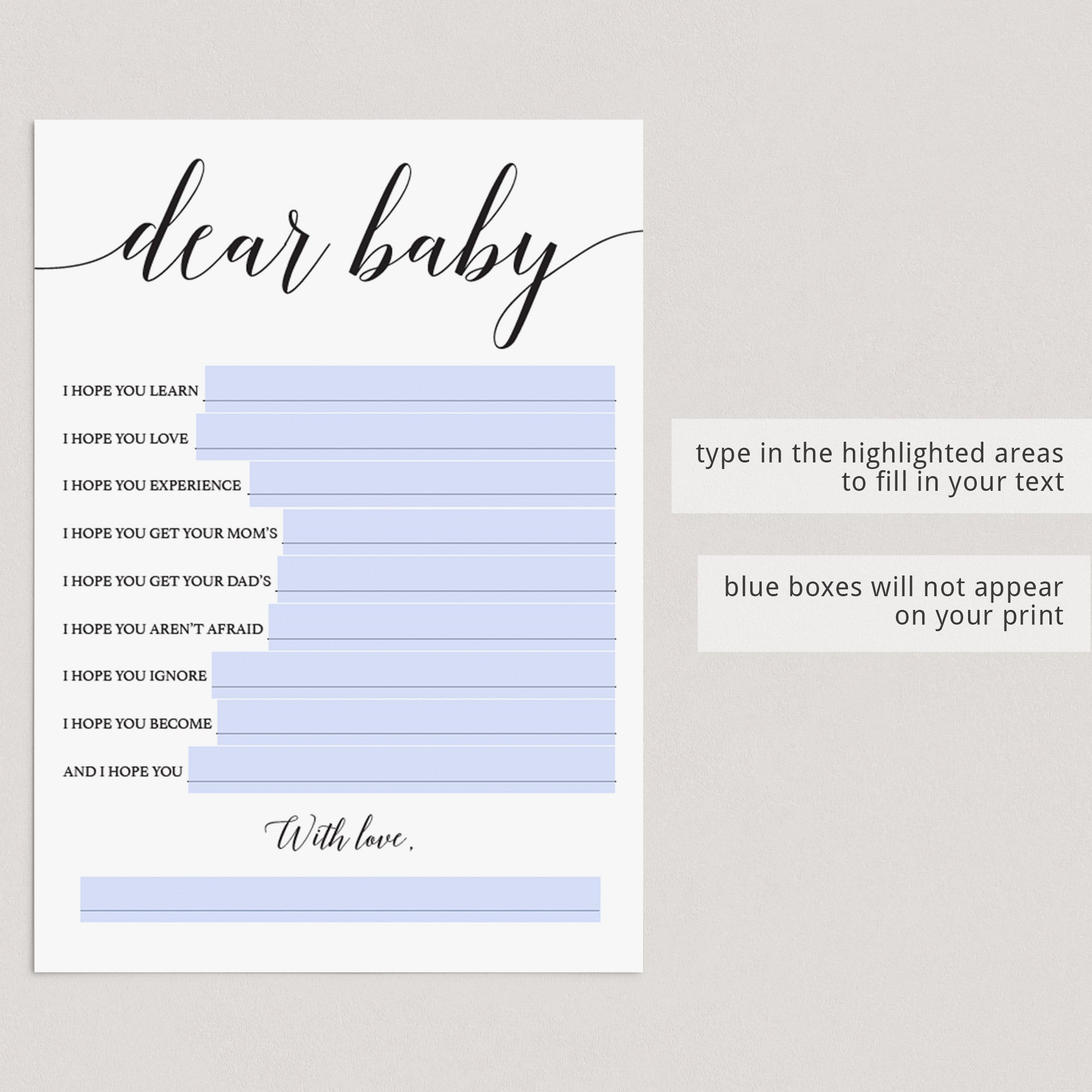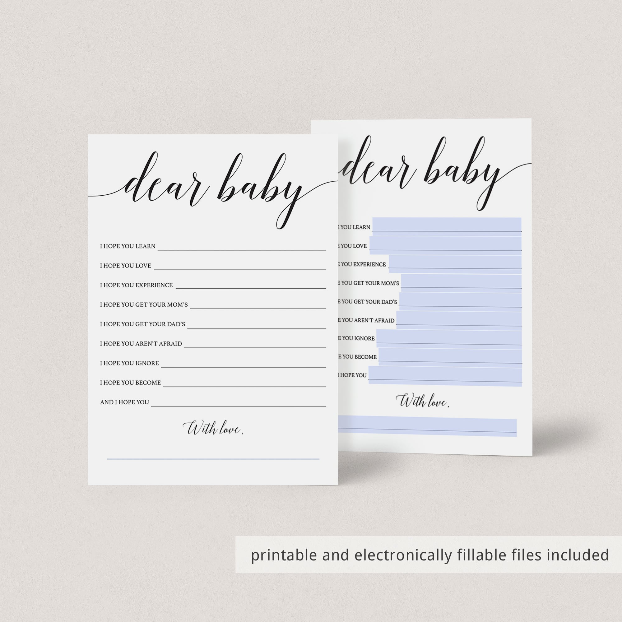 Create a meaningful keepsake with this simple, yet elegant wishes for baby card. Let every (virtual) baby shower guest write down or fill in their wishes for the new bundle of joy and collect the cards for the lucky mom-to-be. The wishes for baby card with calligraphy font is perfect for a gender neutral baby shower. Printable and electronically fillable PDF templates are included.
