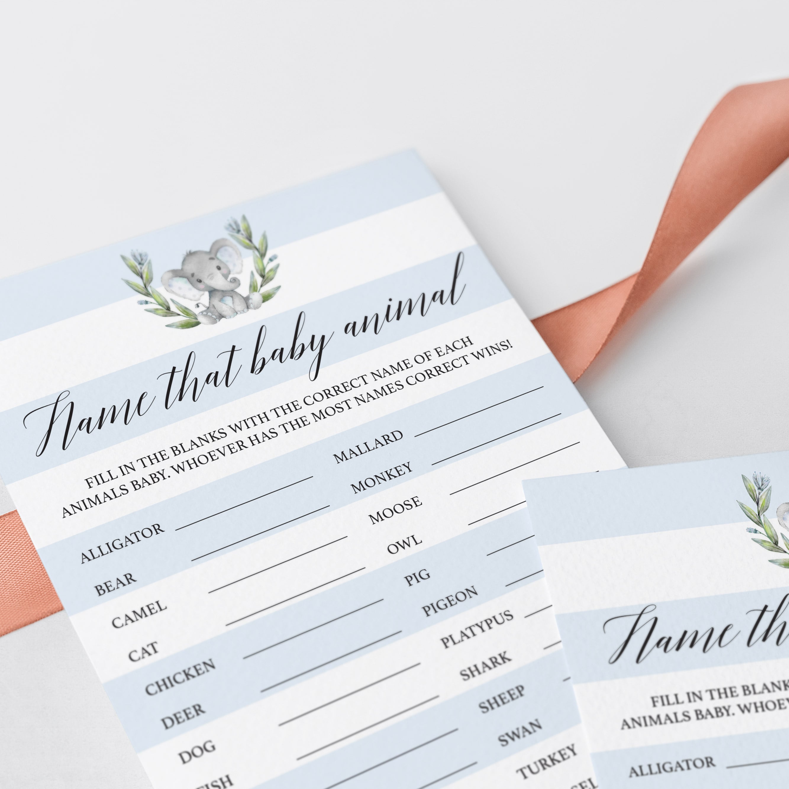 This blue and white game card with little elephant is perfect for a boy baby shower.