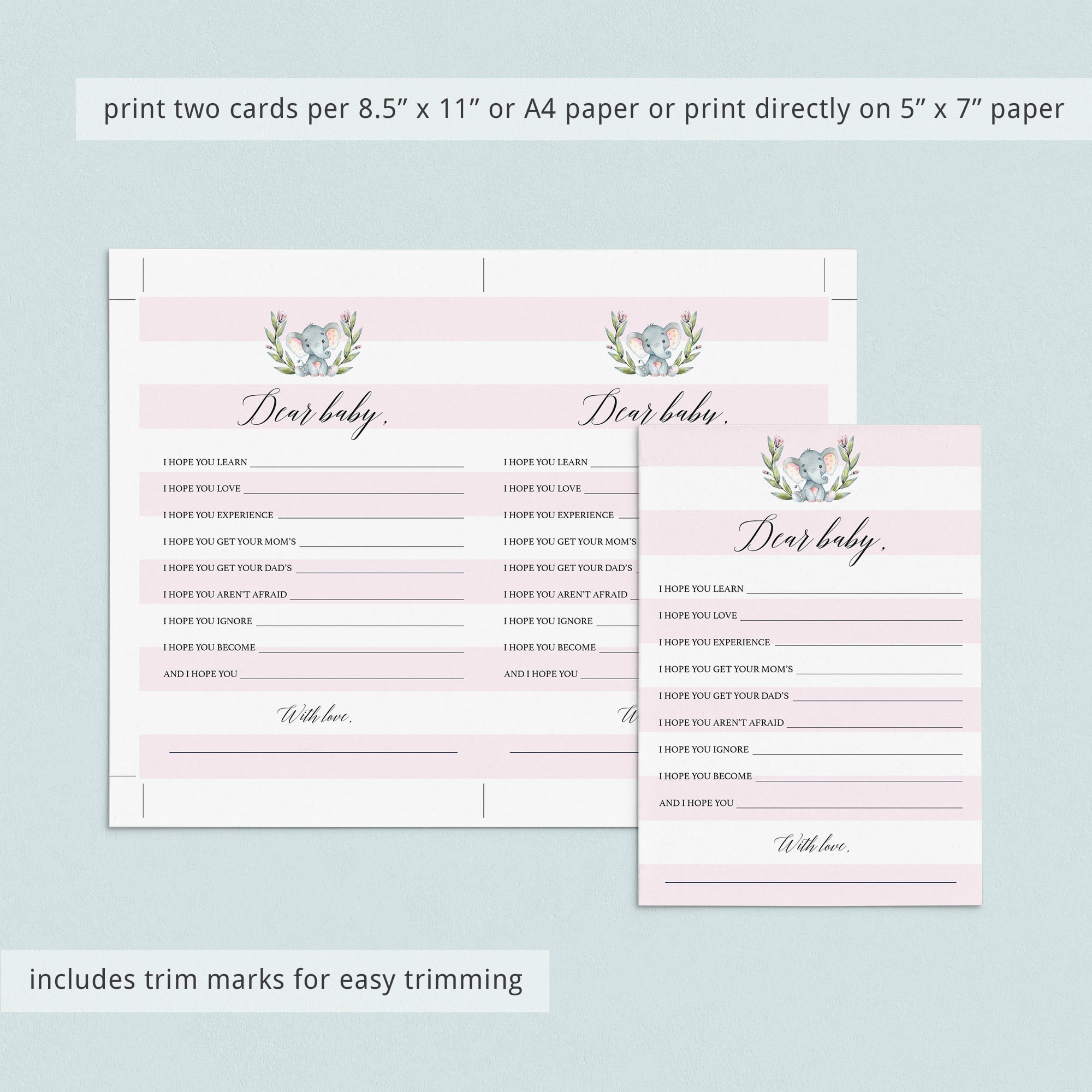 Are you hosting an elephant themed baby shower? Create a magnificent keepsake with this adorable wishes for the new baby girl card. Let every baby shower guest write down their wishes for the baby and collect the cards for the lucky mom-to-be.