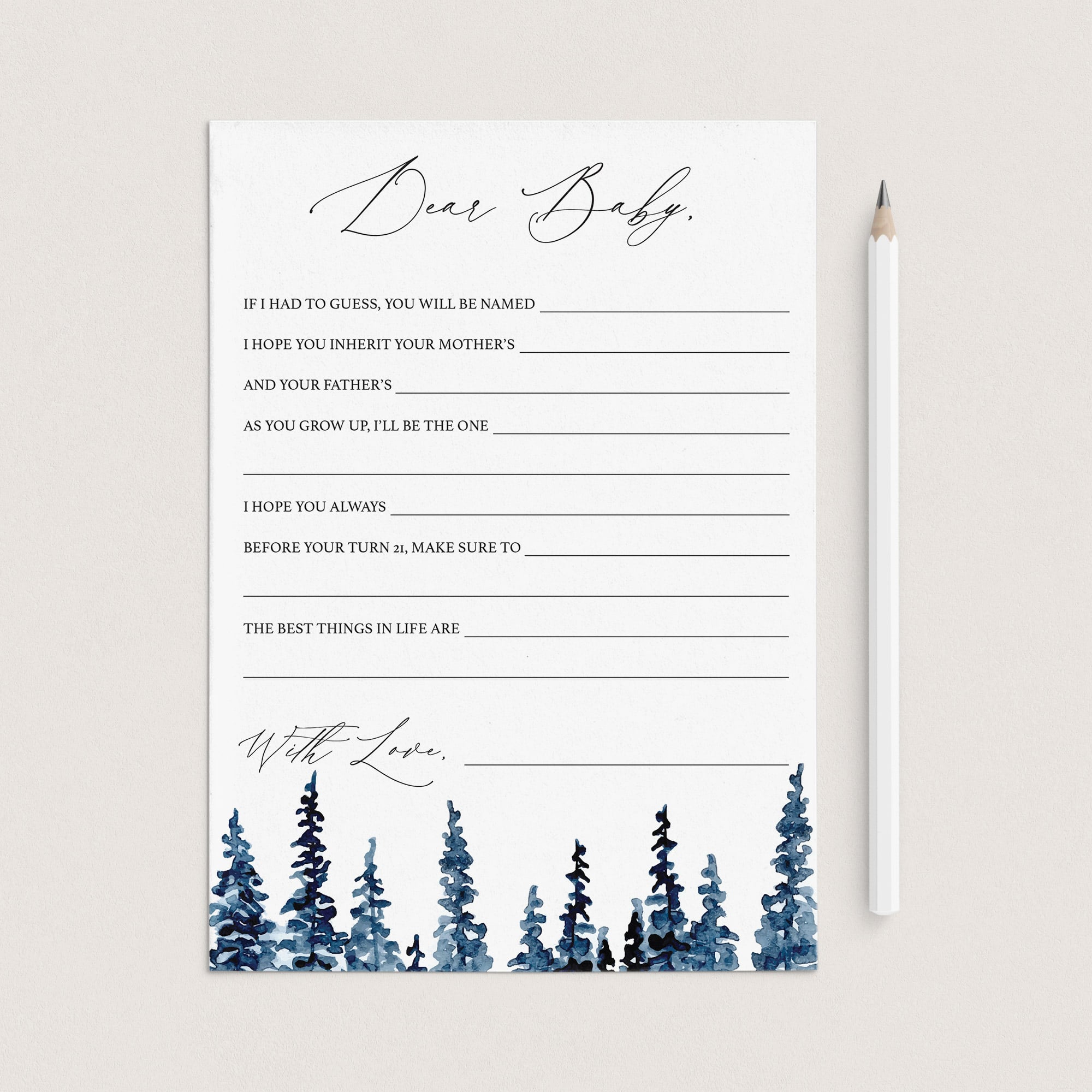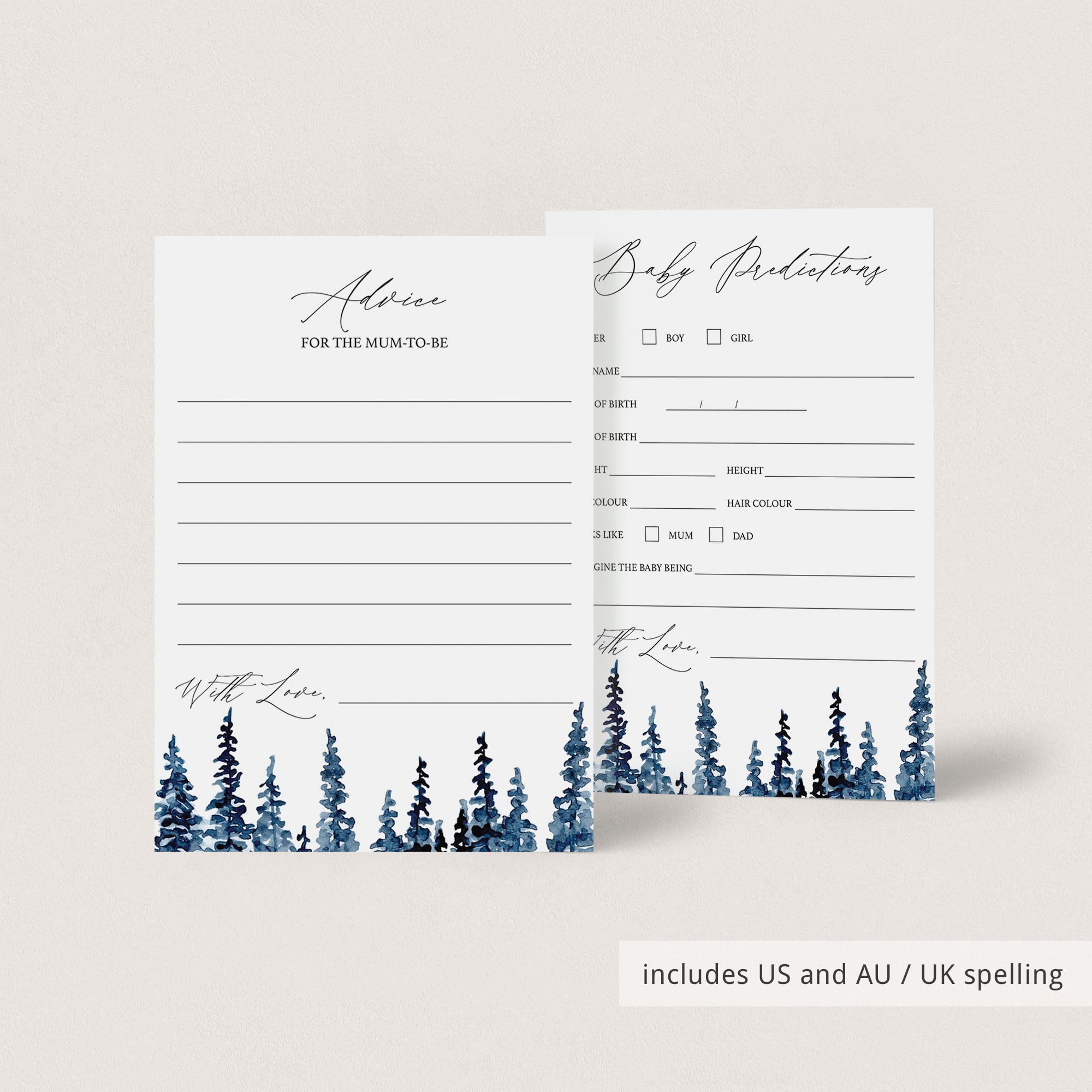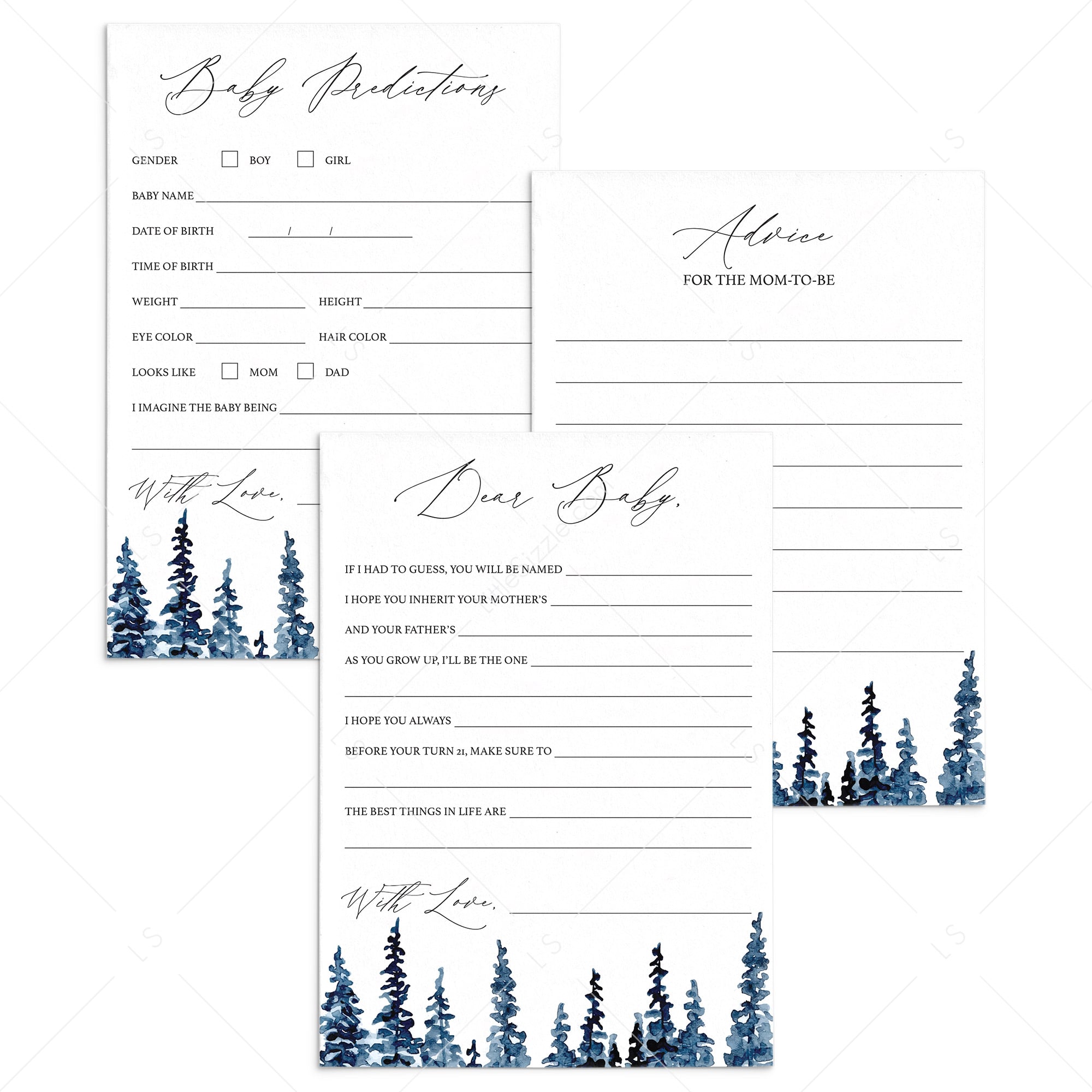 Create meaningful keepsakes for the mom-to-be with these enchanted baby shower games. The blue watercolor pine trees give the games a mystical and moody vibe and make them perfect for a fall or winter baby shower.