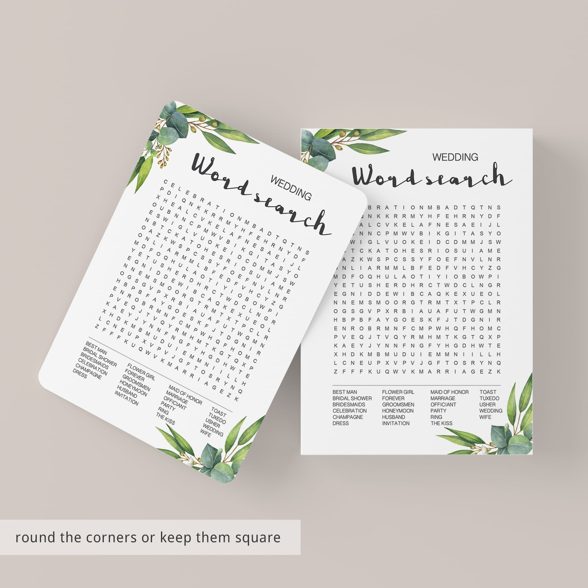 Are you looking for a unique bridal shower game? Play this eucalyptus wedding word search game. Let your guests search for all wedding related words that are listed at the bottom of the cards. The words can be found horizontally, vertically and diagonally. The first person to get all the words wins!