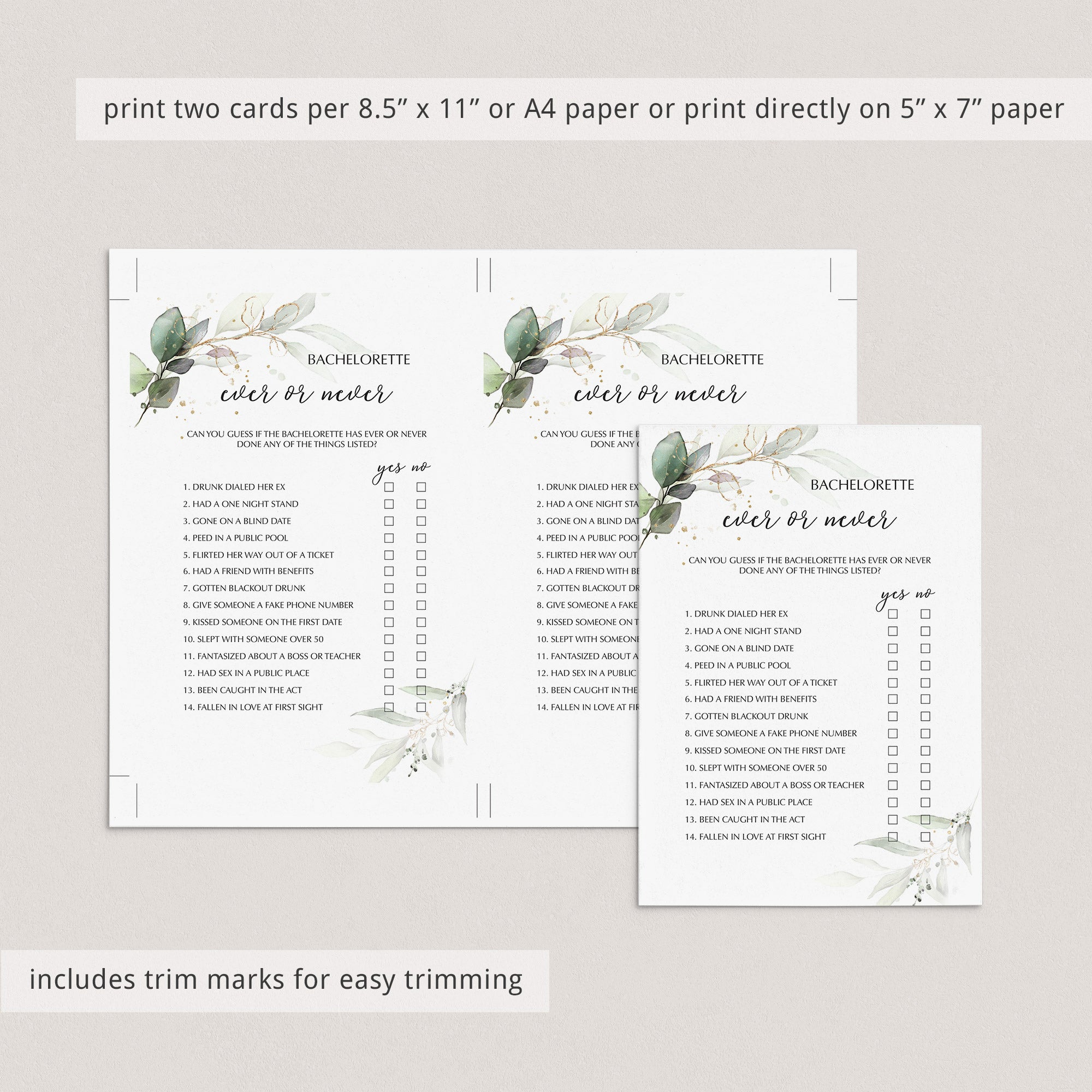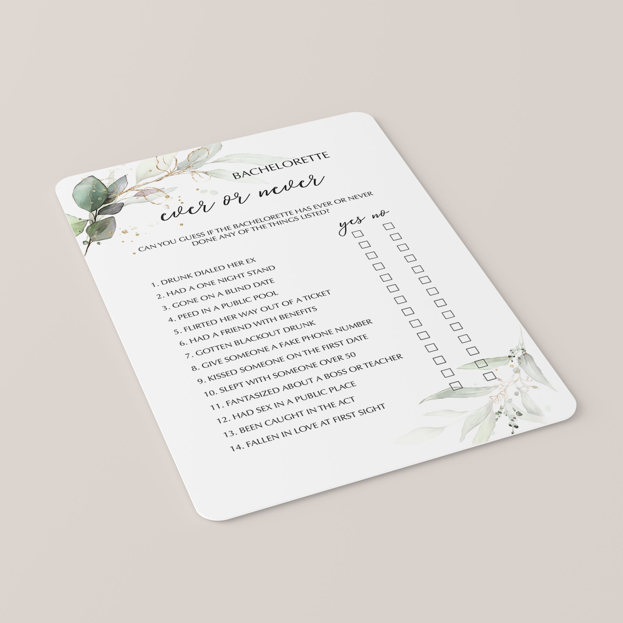 Have the bachelorette fill out the chic greenery and gold Ever or Never game card as an answer key before the party starts. Then compare her responses to what your girlfriends guessed. The player with the most correct wins bragging rights.