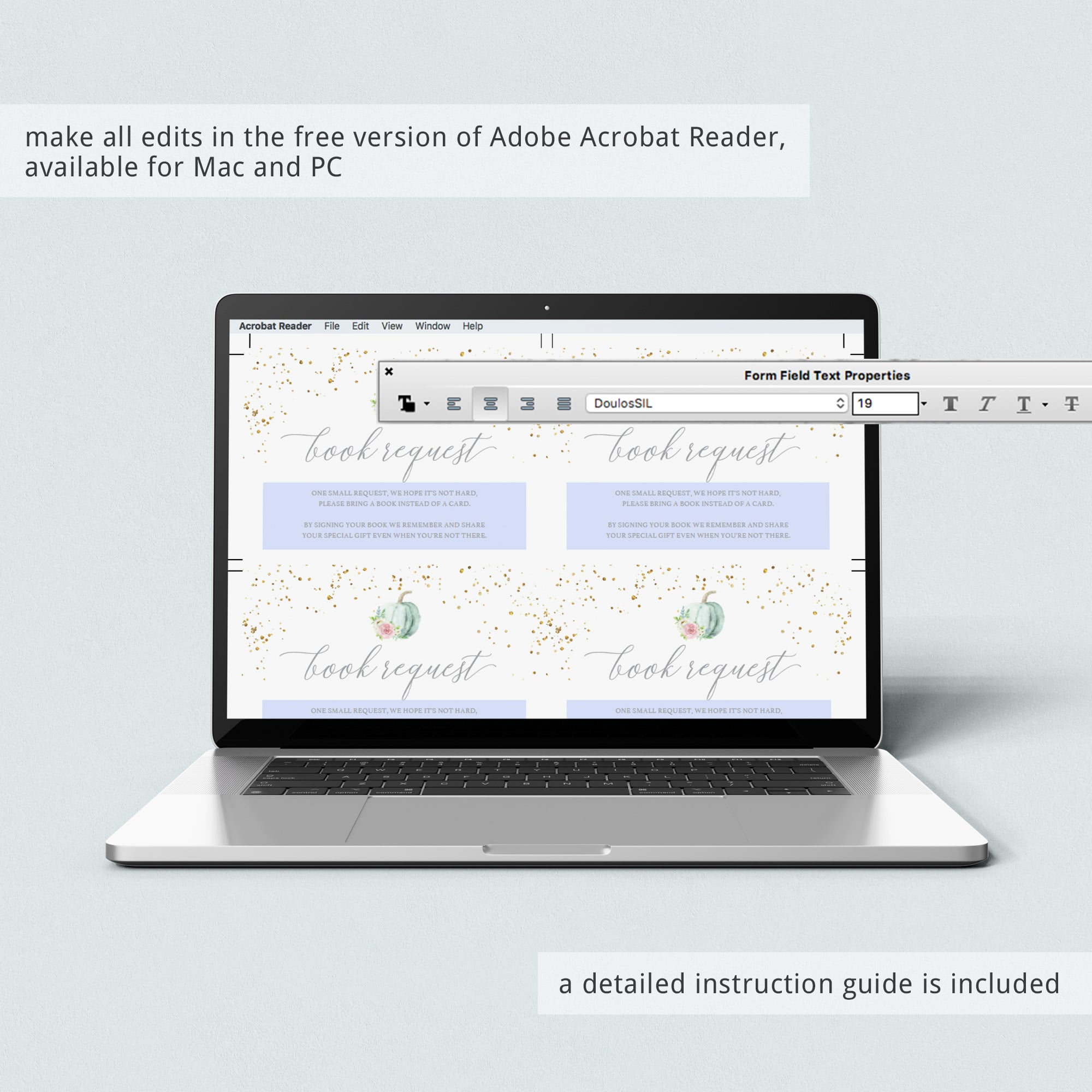 Easily personalize the book request template with your own words and print the cards on plain white paper. We recommend a nice heavy card stock for highest quality feel. A detailed instruction guide with tips & tricks on editing, trimming, paper choices and more is included.
