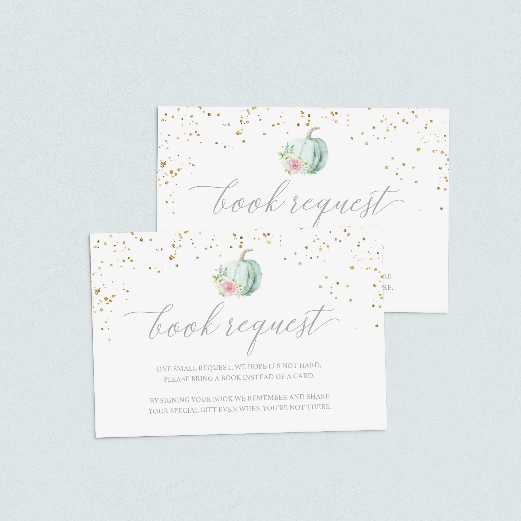 Are you hosting a fall baby shower? Start building a library for the little pumpkin and sweetly request your guests to bring a book instead of a card with these gorgeous fall Book Request cards with watercolor pumpkin. The use of a pastel color scheme makes this design perfect for either a girl or boy baby shower.
