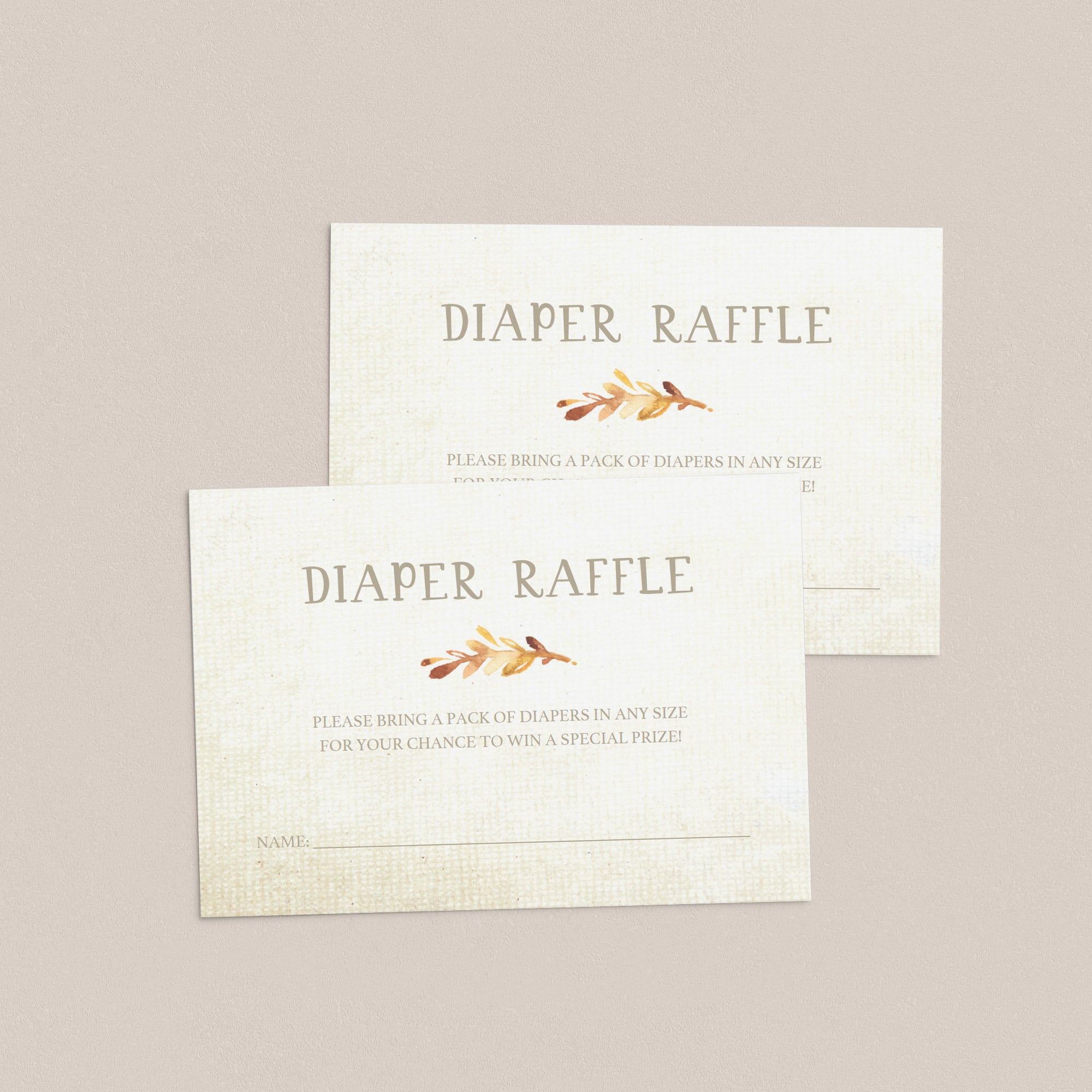 Who doesn't love a diaper raffle during a baby shower? Use this fall baby shower diaper raffle ticket to let your guests know they can win a great prize by bringing a pack of diapers. Include the diaper cards with watercolor leaf in your baby shower invitations before sending them out.