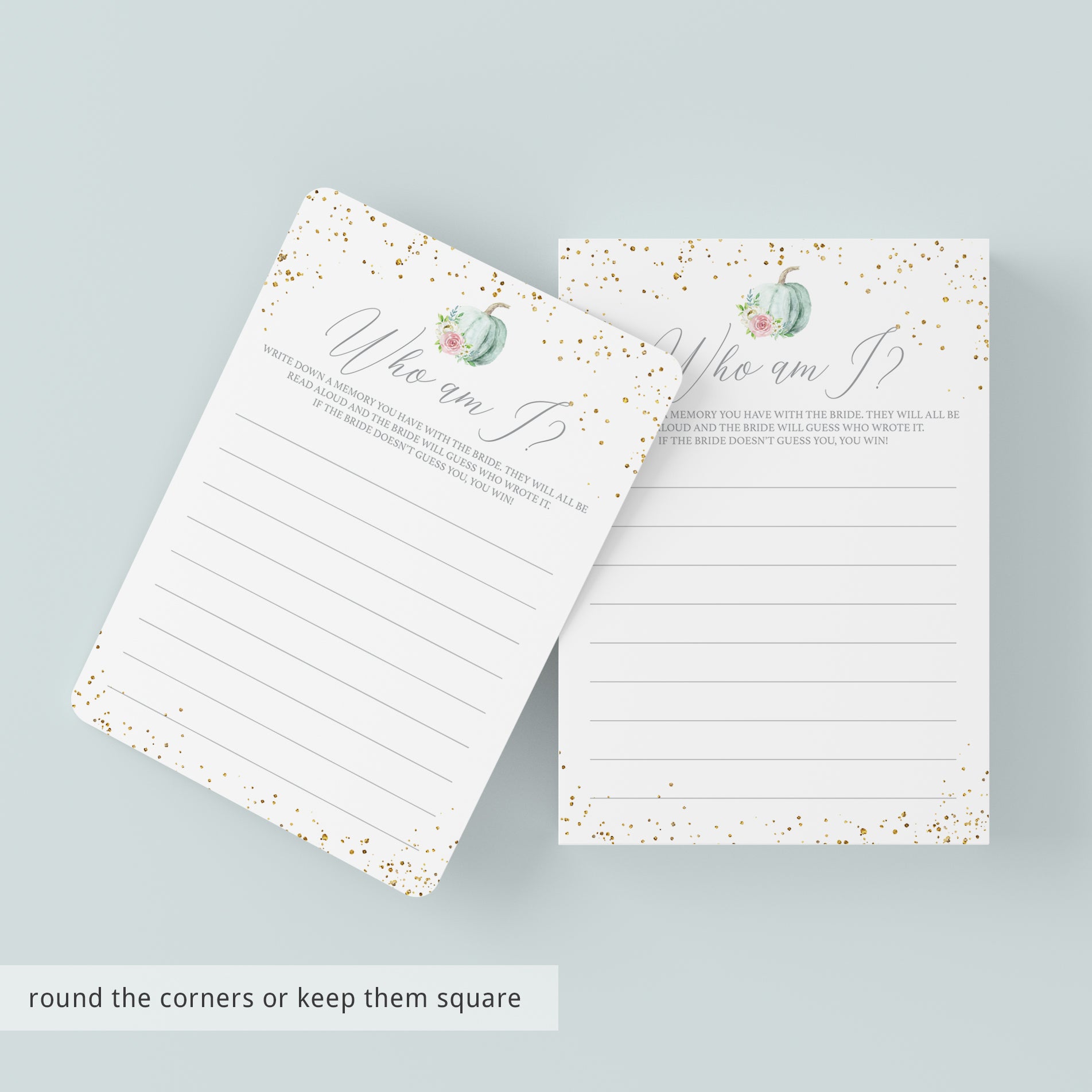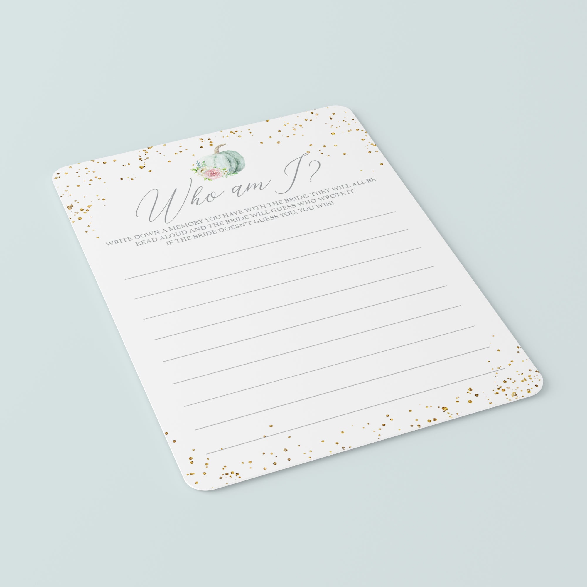 Are you looking for a fun ice breaker game for your fall bridal shower? Play Who Am I with these beautiful game cards with watercolor pumpkin. It's the perfect addition to your Fall In Love theme bridal shower and it's sure to be a hit at your party!