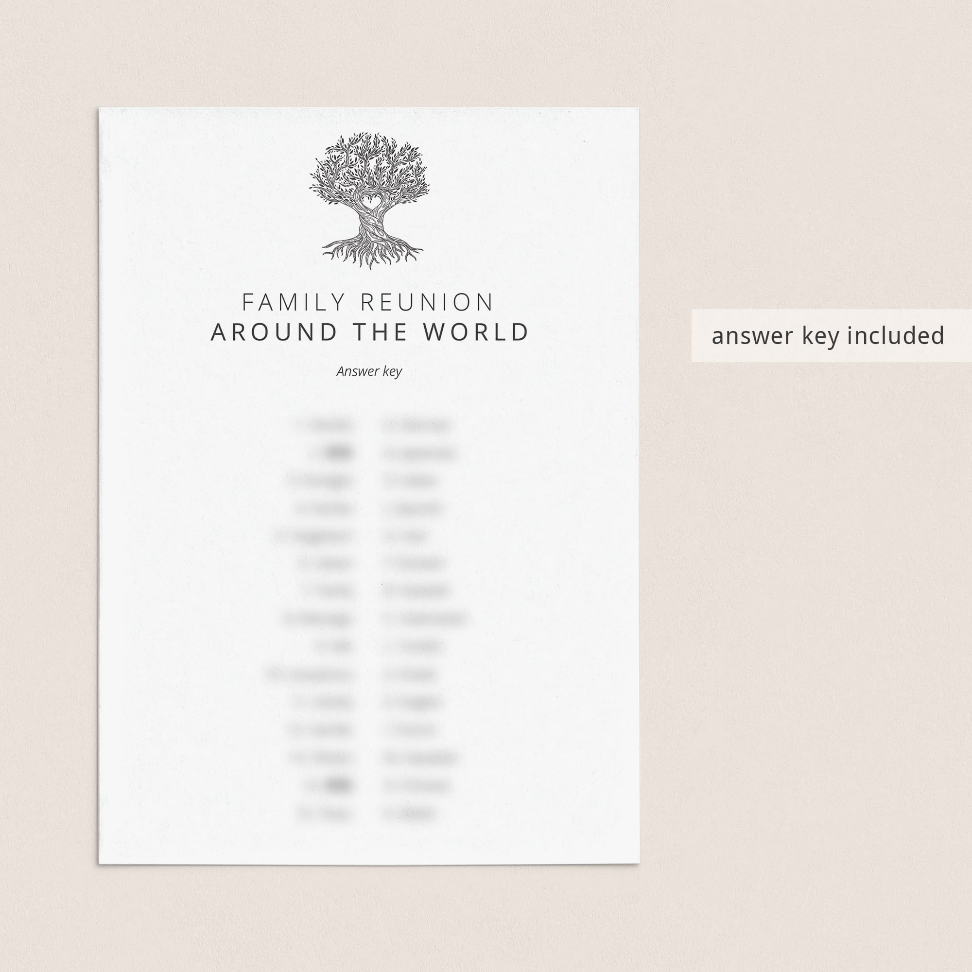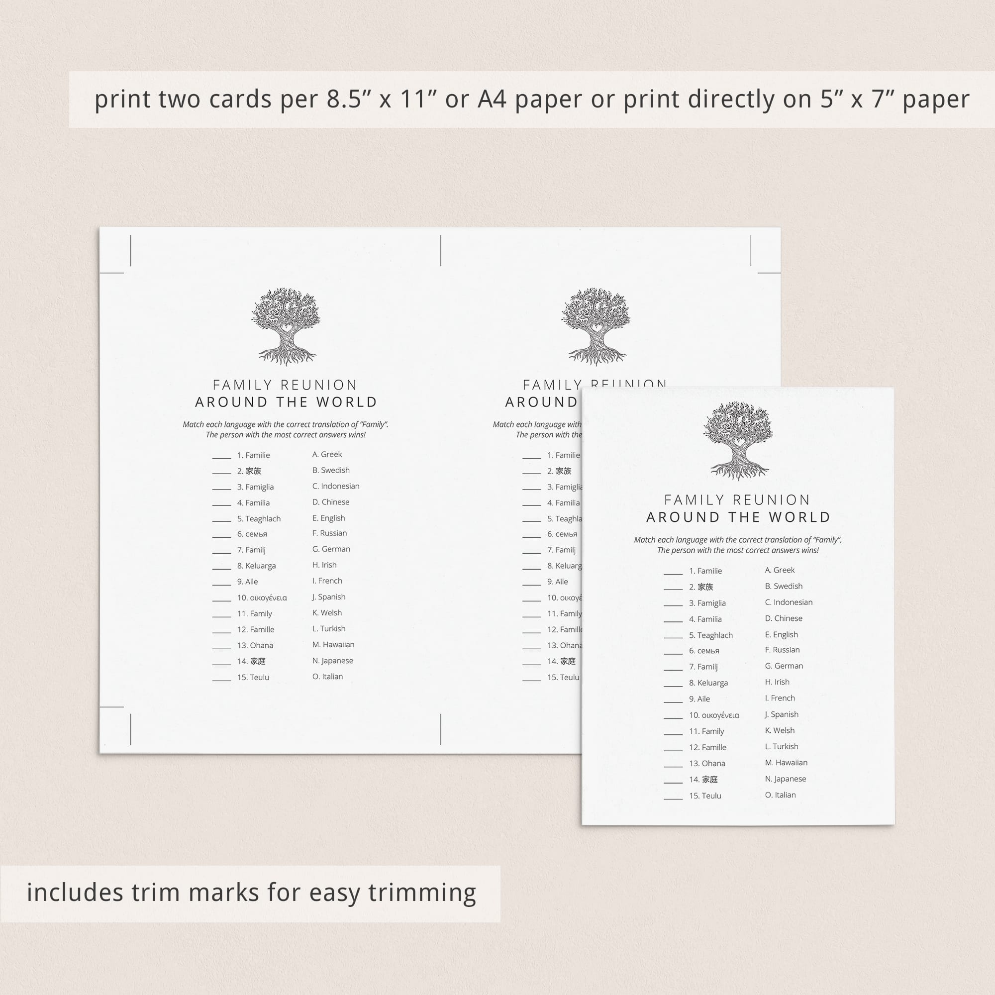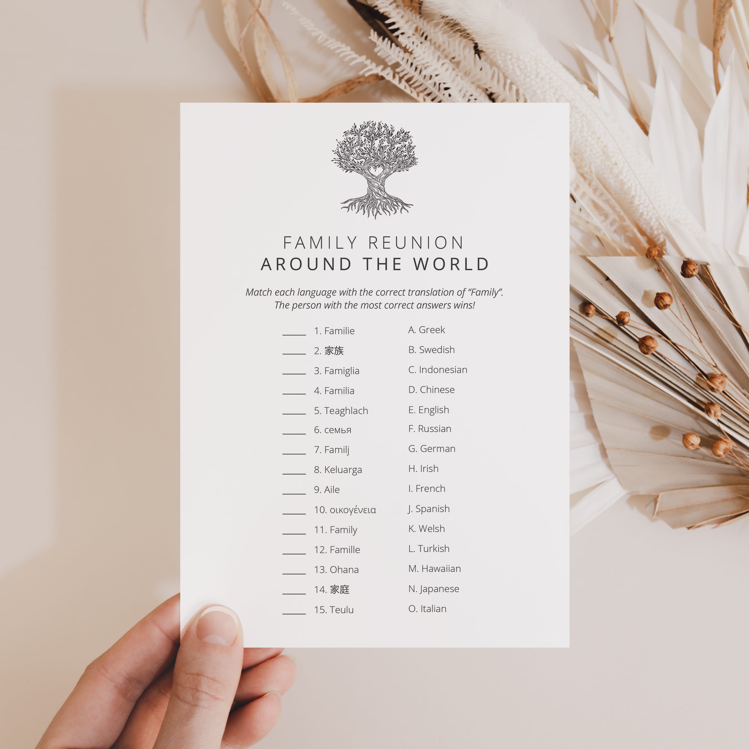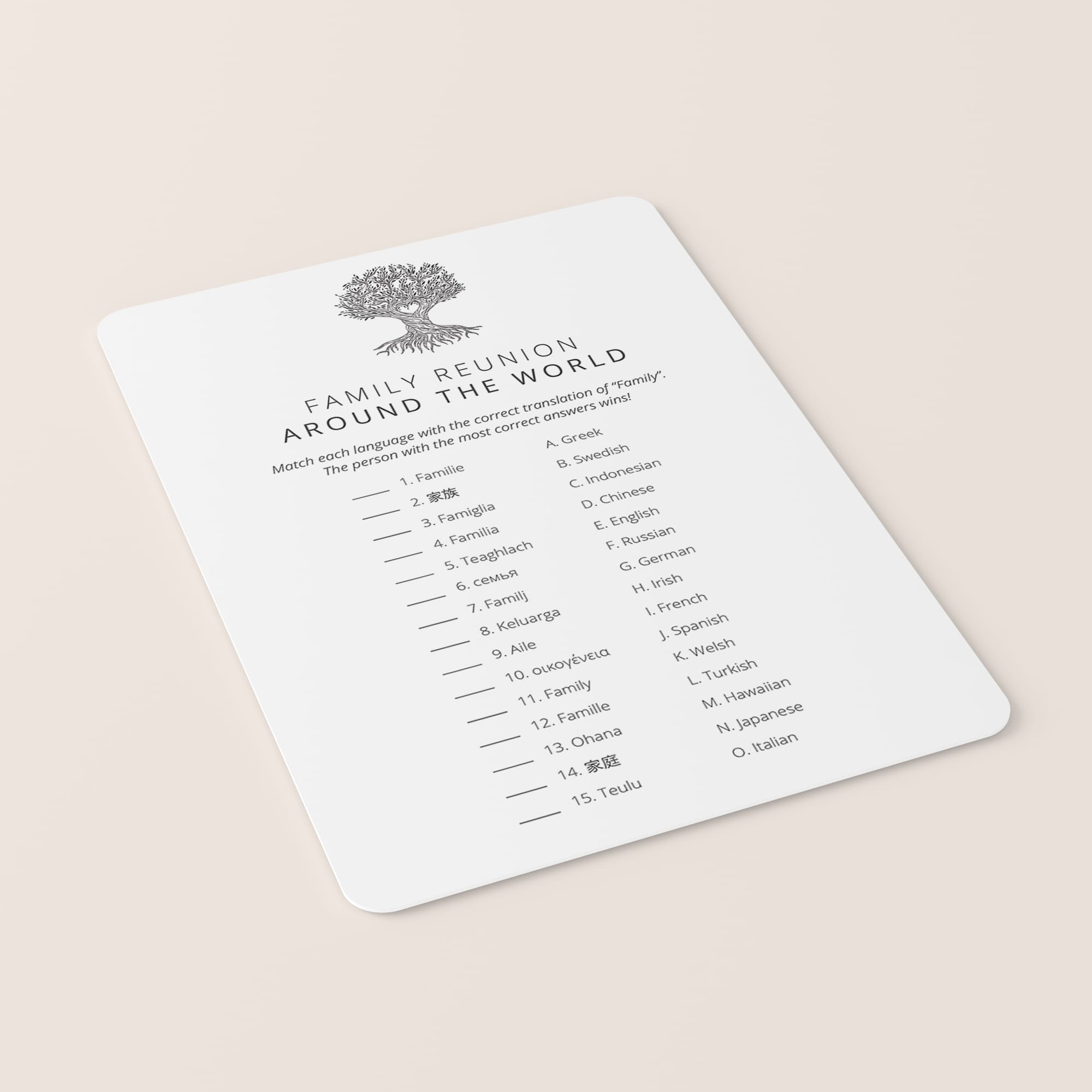 This game is simple and fun for all ages. Print and hand out these modern minimalist Family Around the World game cards with a pen or pencil to each guest. Everyone must try to match each version of the word “Family” with its language of origin. The person with the most correct answers wins.