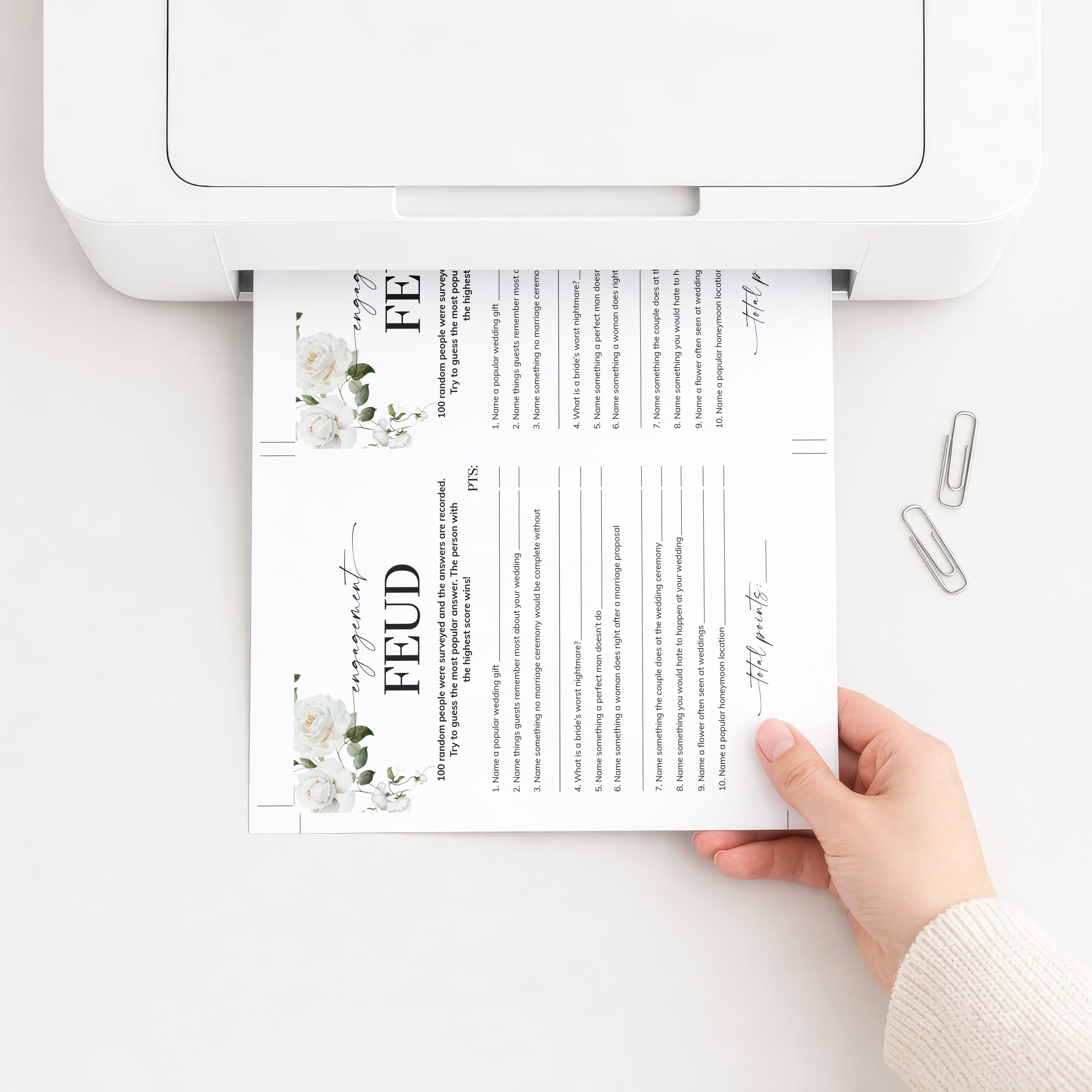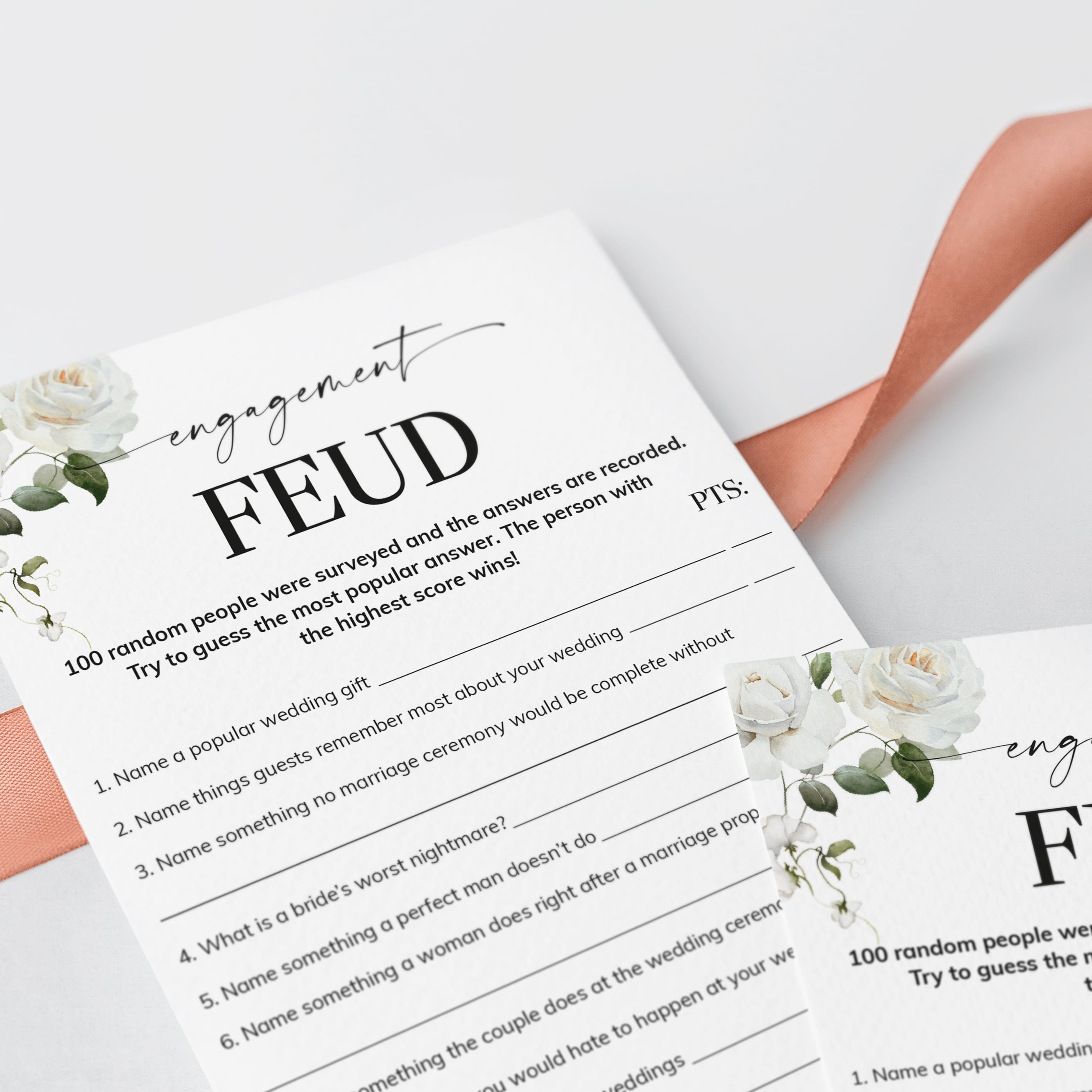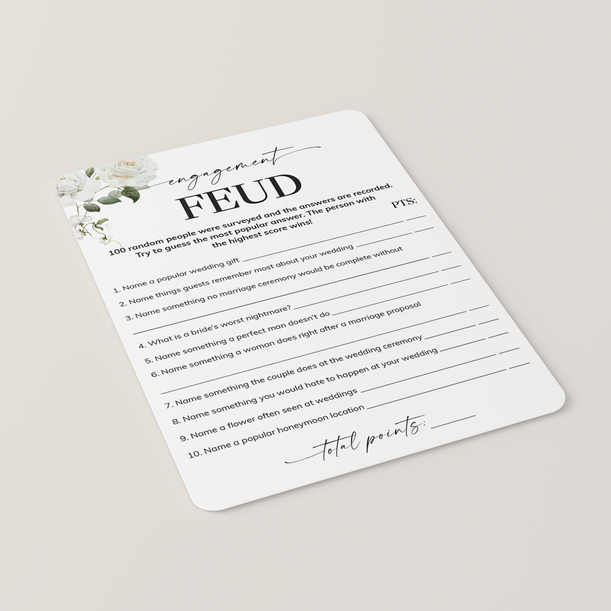 Add some fun to your engagement party with this elegant floral Engagement Feud game. Family Feud is one of the best games ever. Have your friends and family compete to guess the most popular answer to these 8 engagement feud questions. An answer key with Engagement Feud answers and points is included. The person or team with the highest score wins!