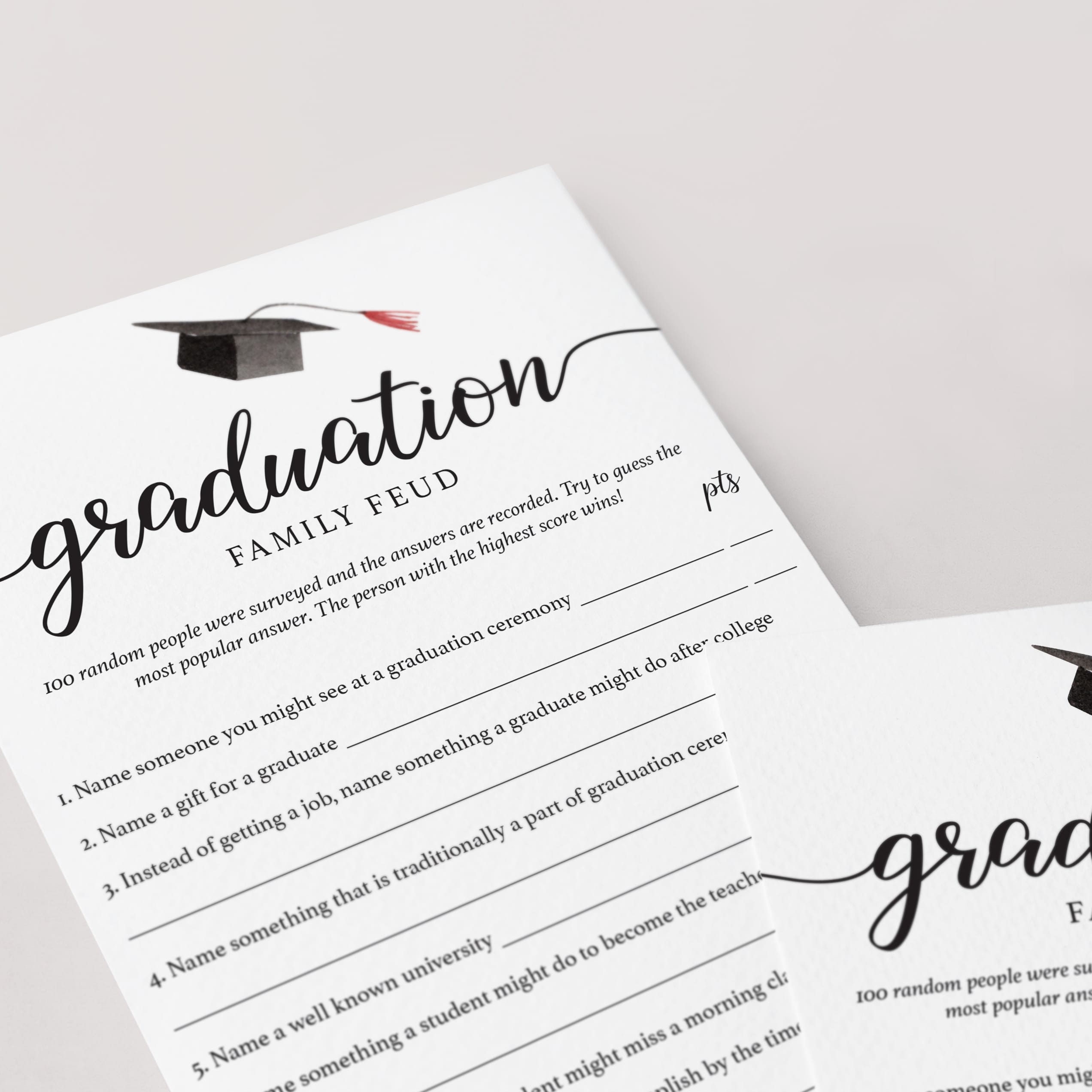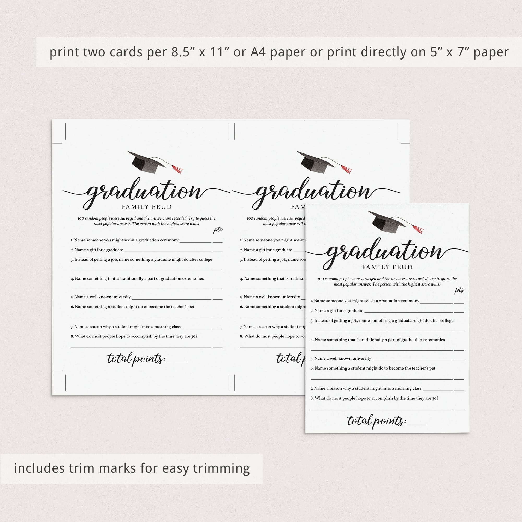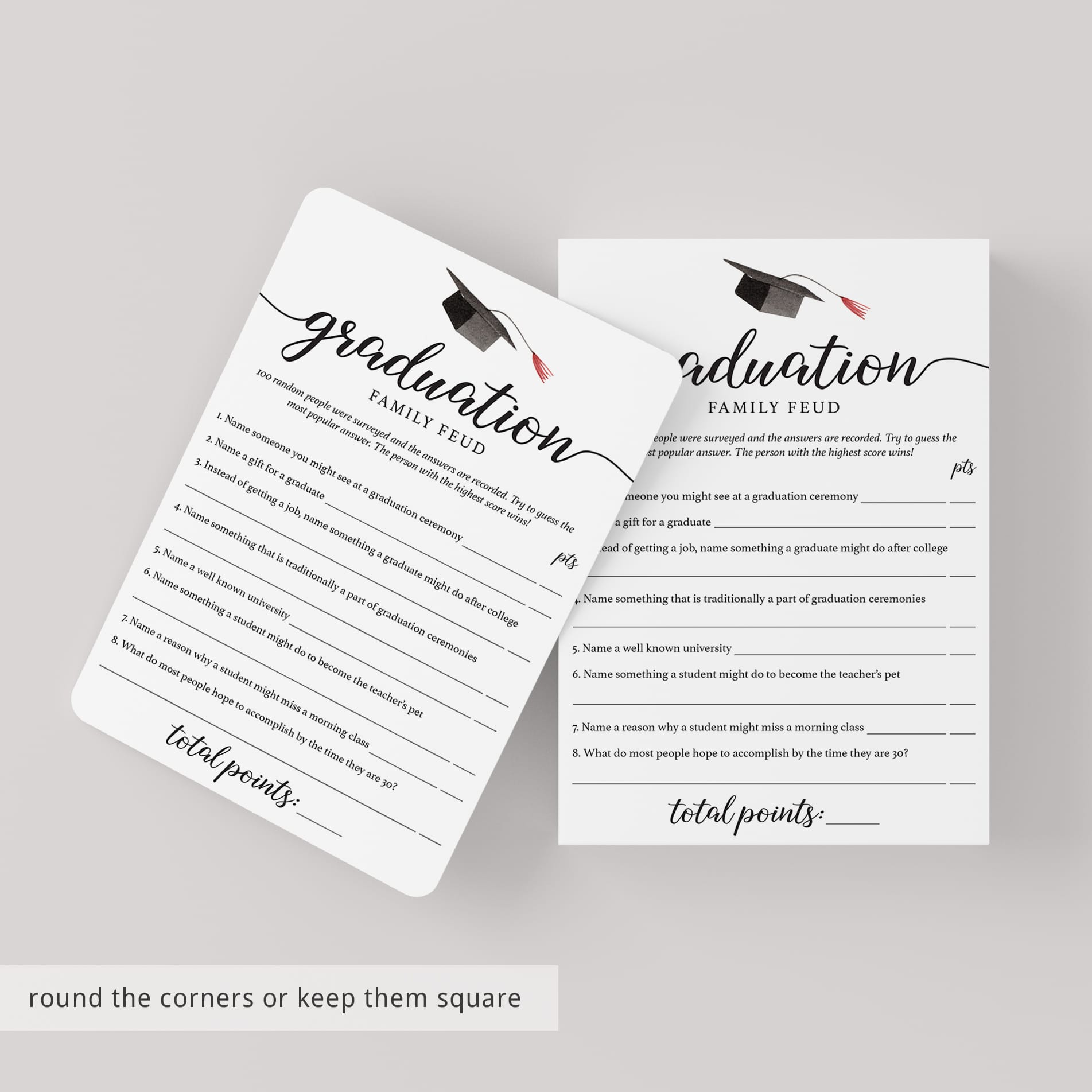 Add some fun to your Graduation Party with this Family Feud Graduation Edition game. Family Feud is one of the best game shows ever. Have your friends and family compete to guess the most popular answer to Graduation themed Family Feud questions. An answer key with Graduation Feud Answers and Points is included. The person or team with the highest score wins!