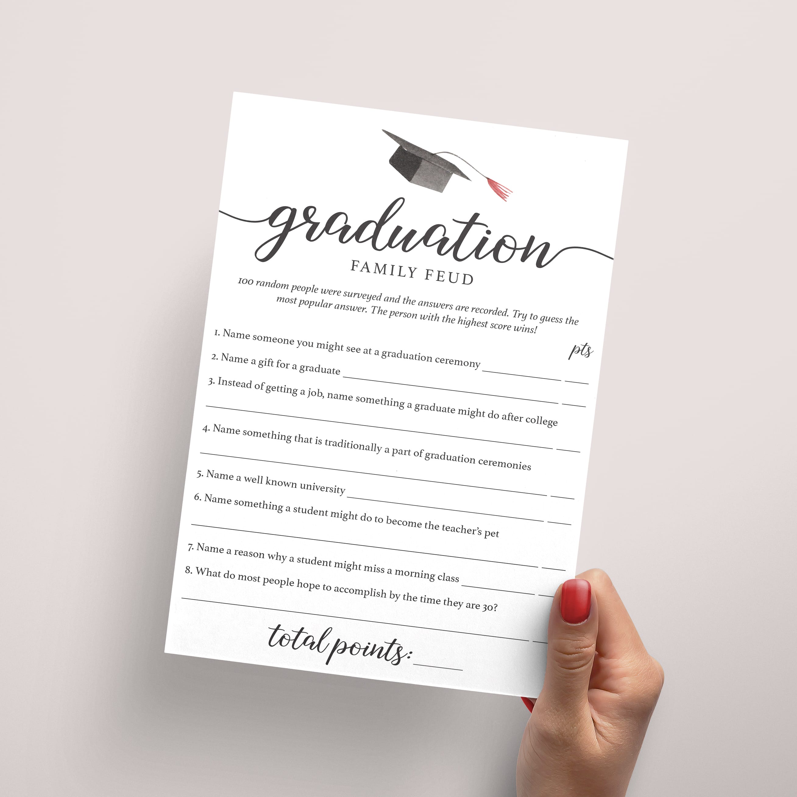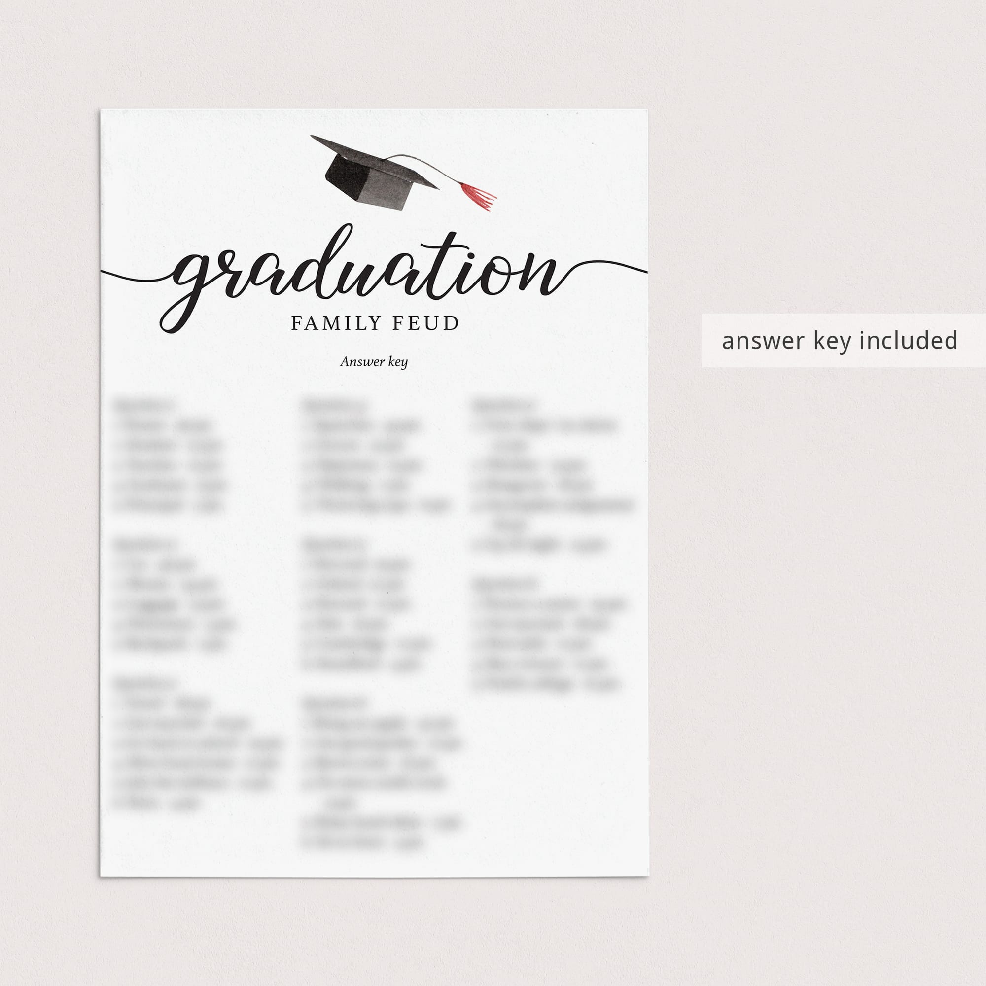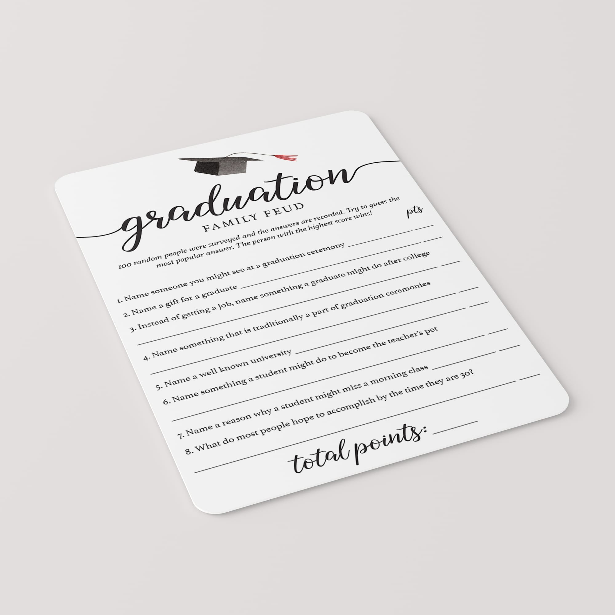Add some fun to your Graduation Party with this Family Feud Graduation Edition game. Family Feud is one of the best game shows ever. Have your friends and family compete to guess the most popular answer to Graduation themed Family Feud questions. An answer key with Graduation Feud Answers and Points is included. The person or team with the highest score wins!